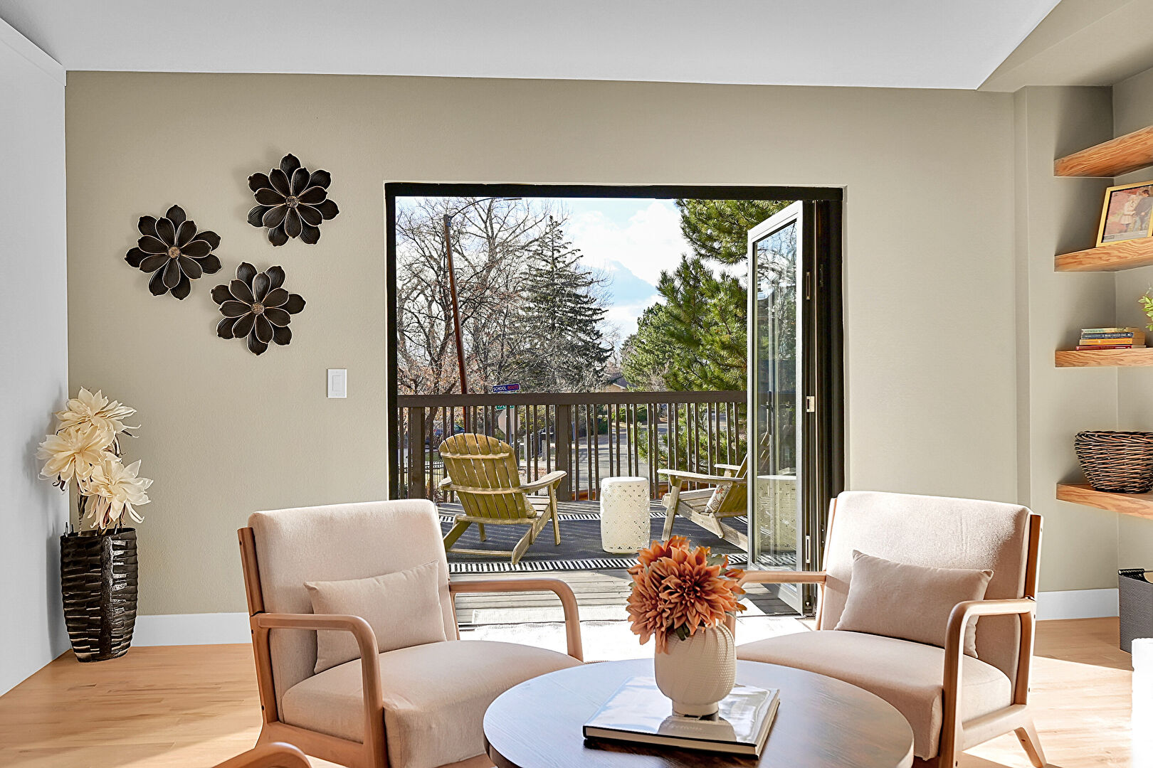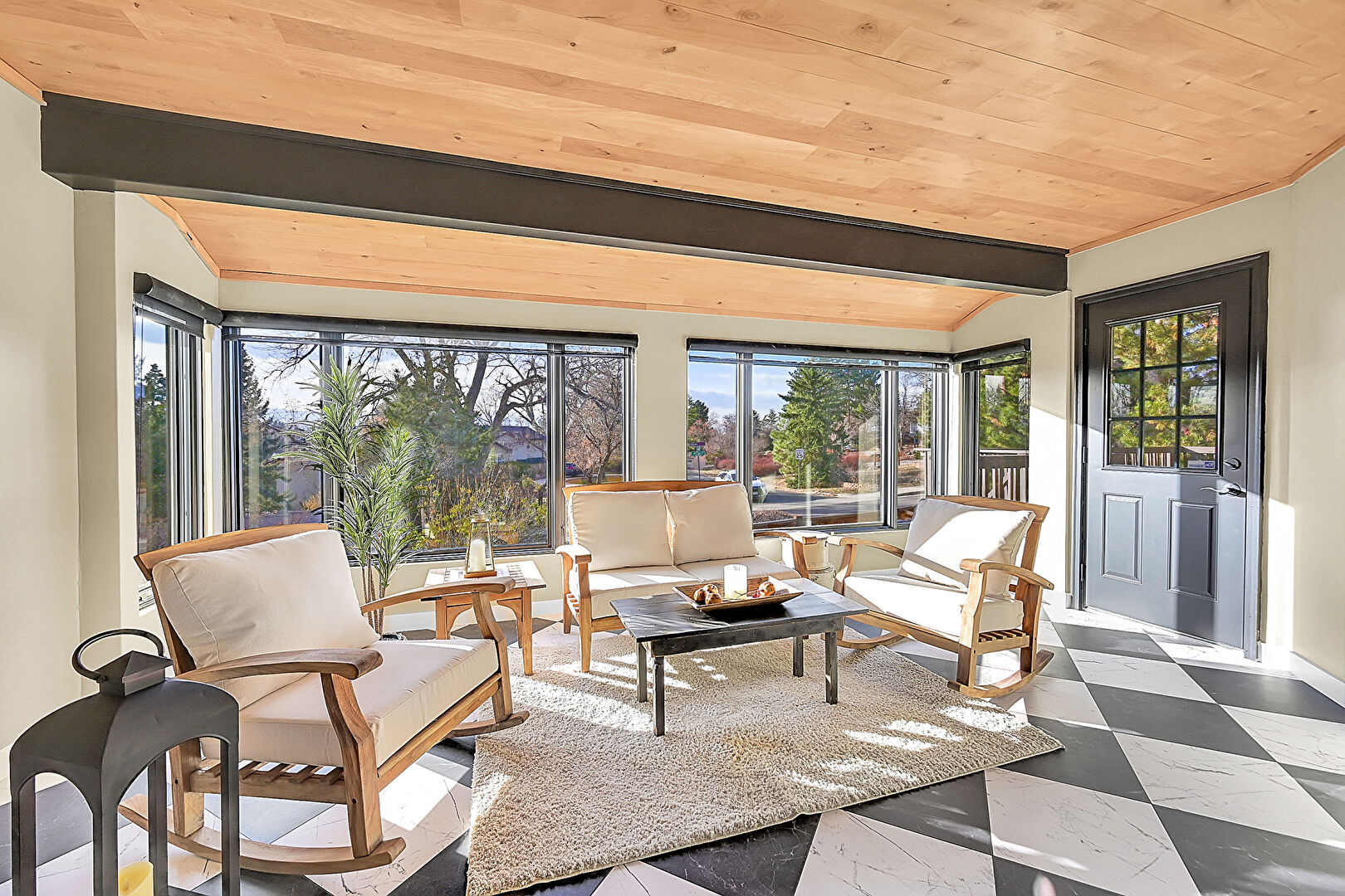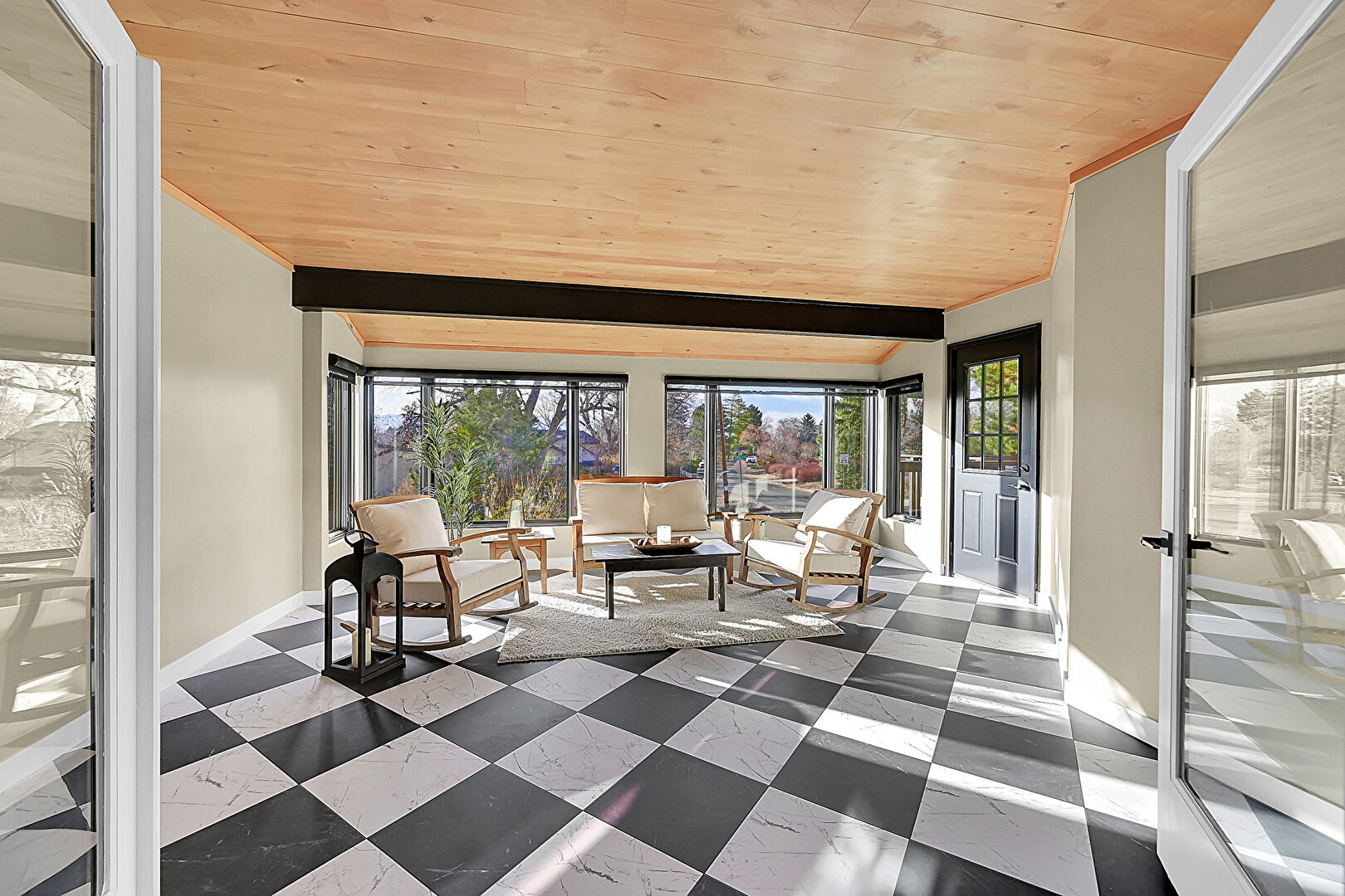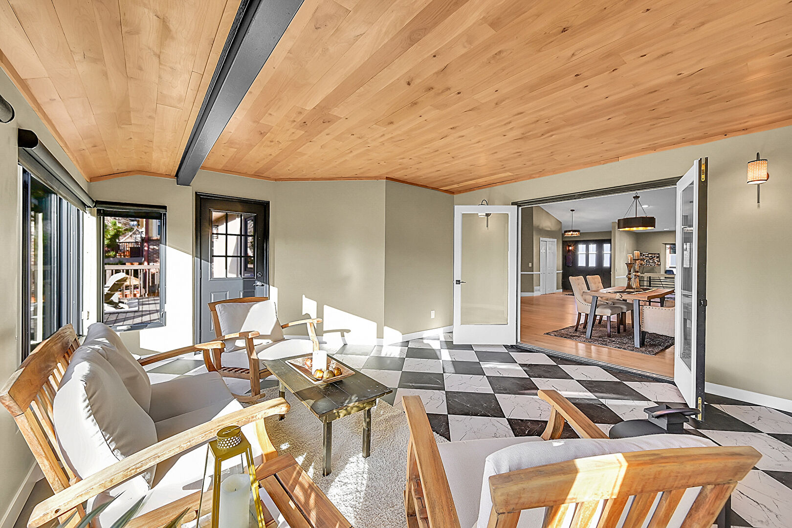 Baseboards Wall, Beamed Ceiling, Drywall, Natural Light, Vinyl Floor, Wood Ceiling, French Doors, Vaulted Ceiling, Vinyl Floor