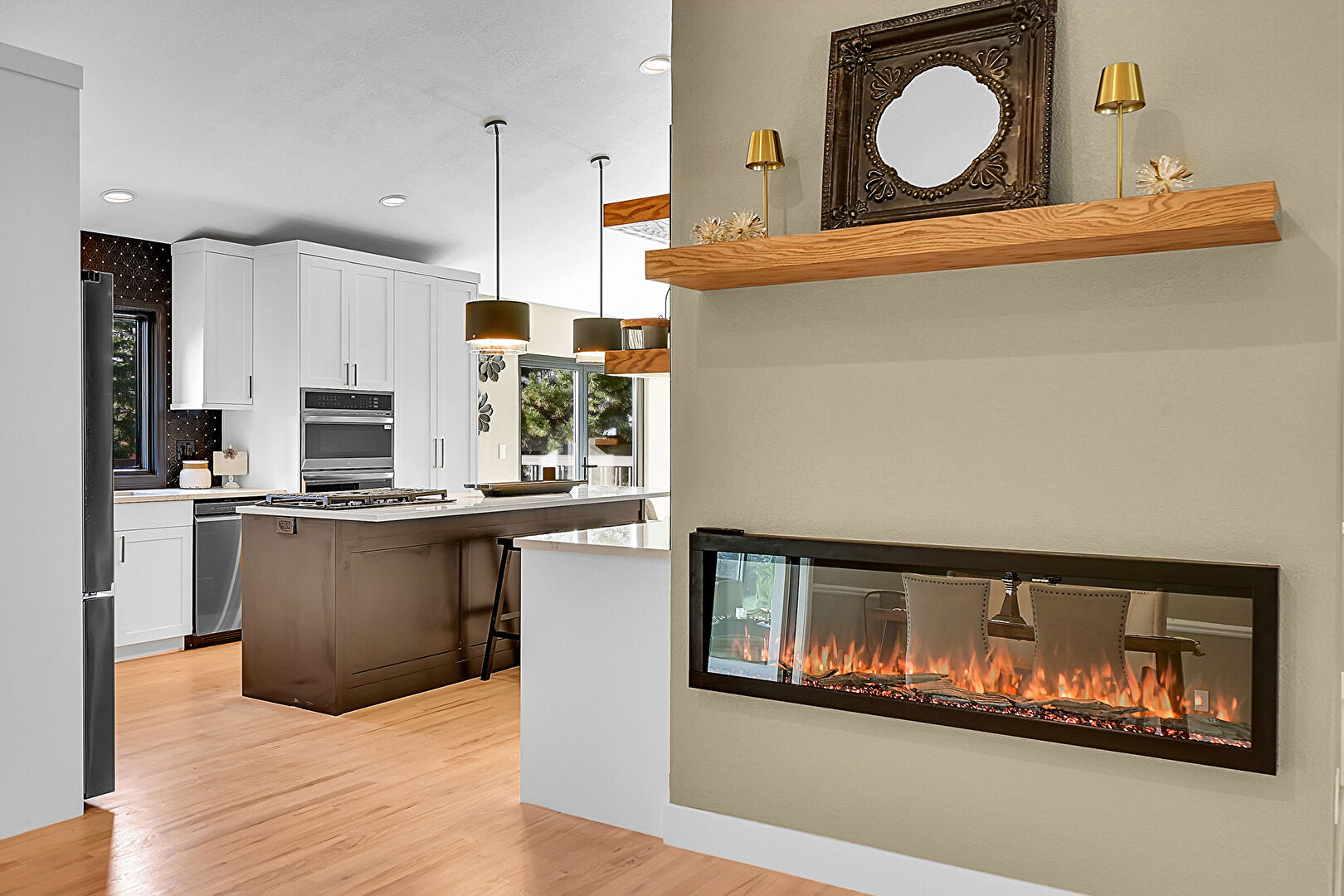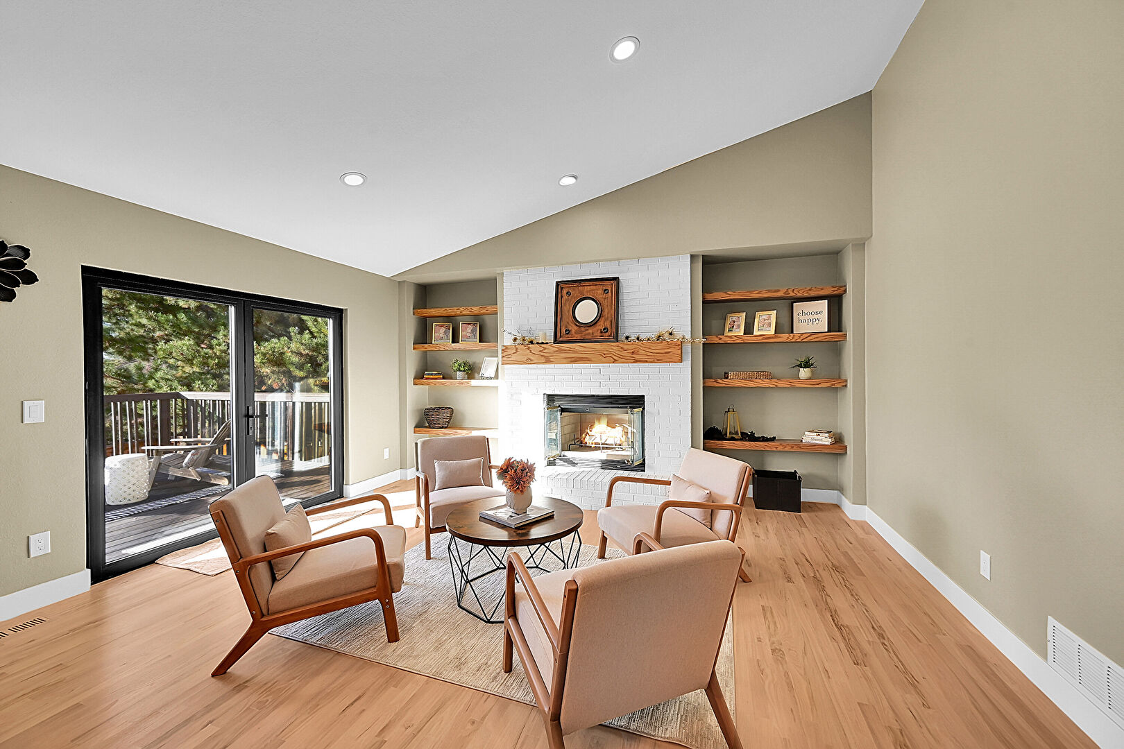 Baseboards Wall, Double Oven, Drywall, Fireplace, High Ceiling, Natural Light, Recessed Lighting, Vaulted Ceiling, Vent, Wood Finish Floor, Built In Shelves, Recessed Lighting