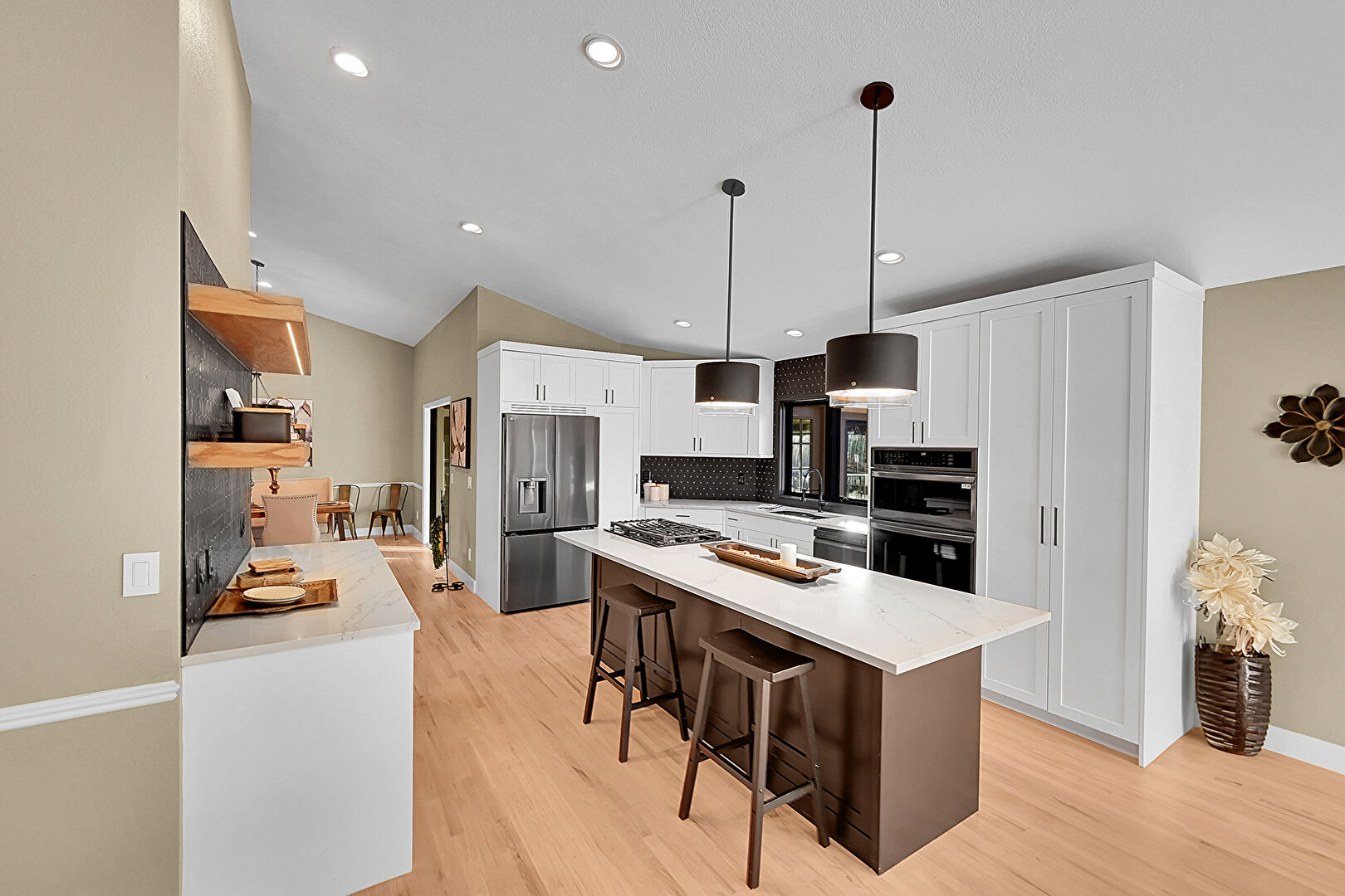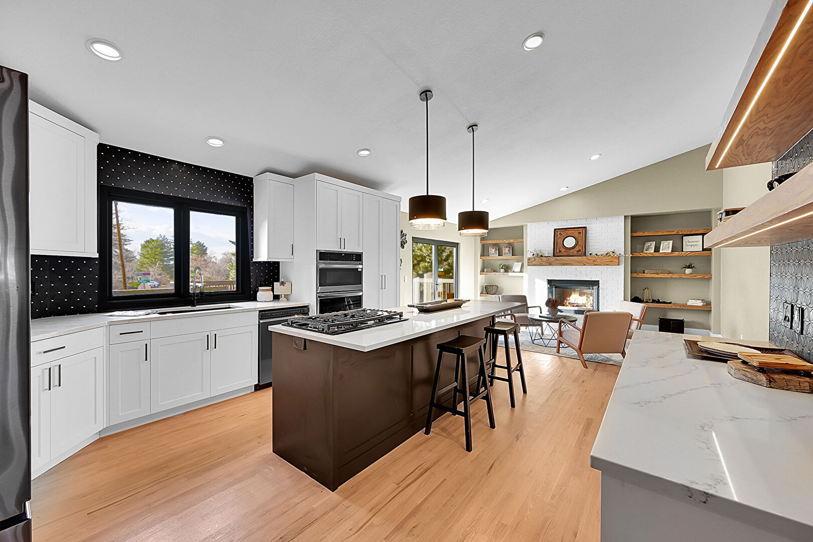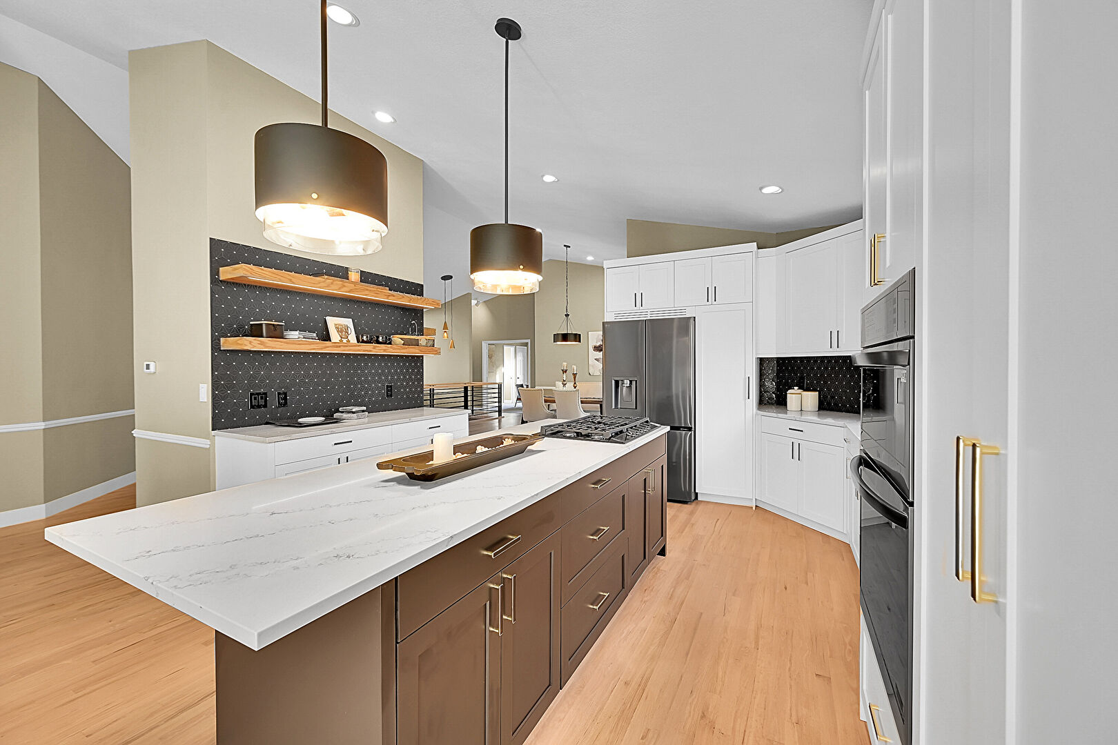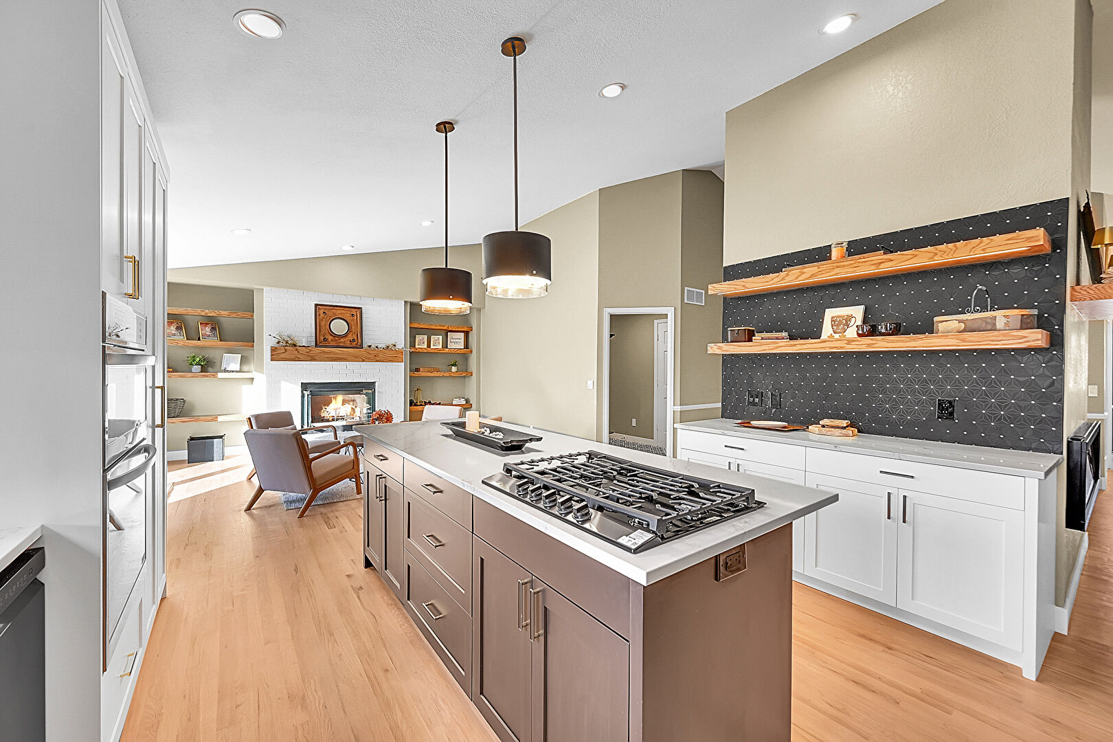 Baseboards Wall, Built In Shelves, Crown Molding Cabinets, Dark Brown Cabinets, Double Oven, Drywall, Fireplace, Kitchen Bar, Kitchen Island, L Shaped Kitchen, Natural Light, Open Shelves, Opens To Living Area, Pendant Lighting, Recessed Lighting, Shaker Cabinets, Stone Countertops, U Shaped Kitchen, Vaulted Ceiling, Vent, Wood Finish Floor, Drywall, Kitchen Bar, Kitchen Island, Natural Light, Shaker Cabinets