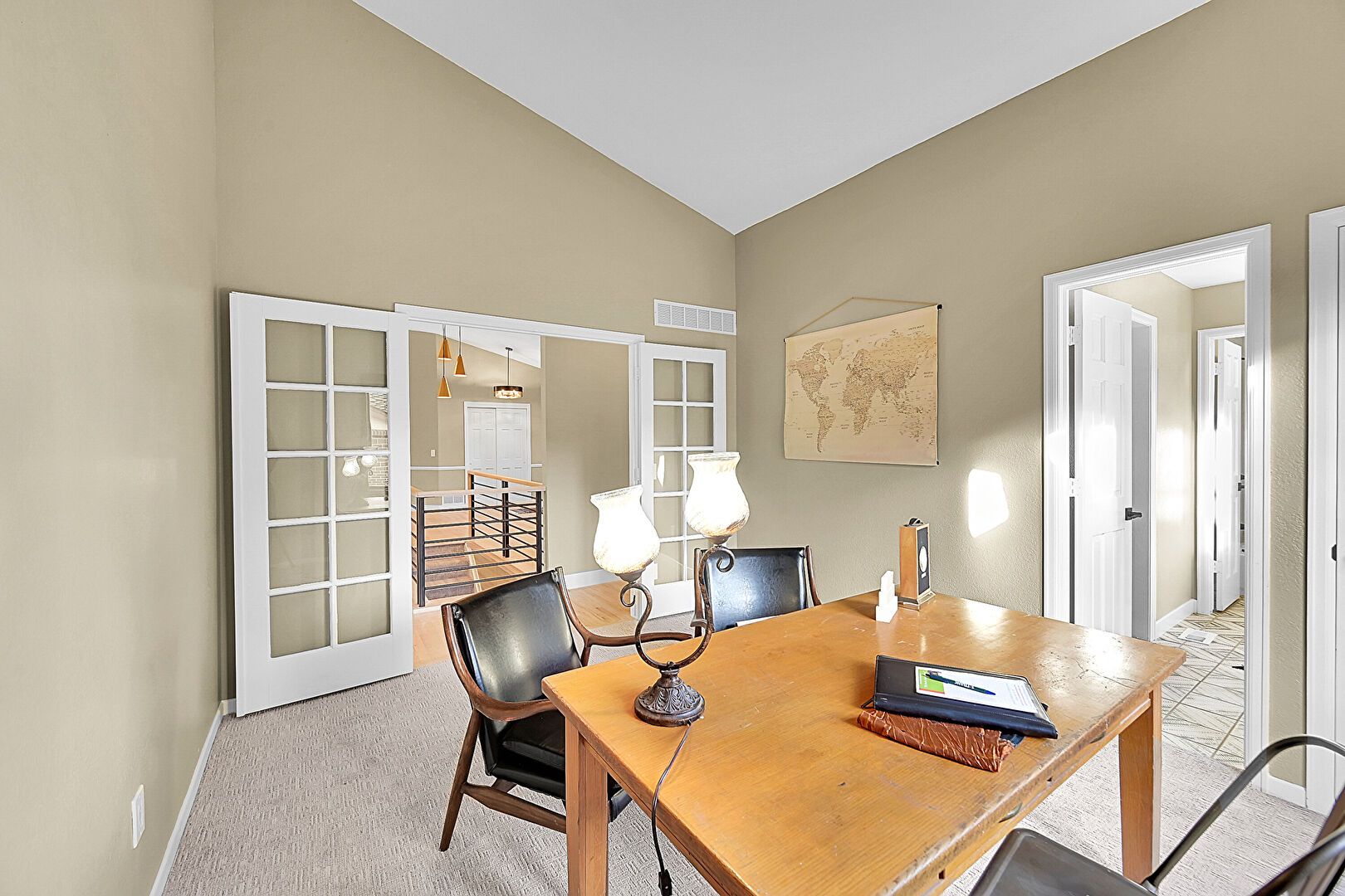 Baseboards Wall, Carpet, Drywall, French Doors, High Ceiling, Office Area, Textured Wall, Vaulted Ceiling, Vent, Natural Light, Vaulted Ceiling