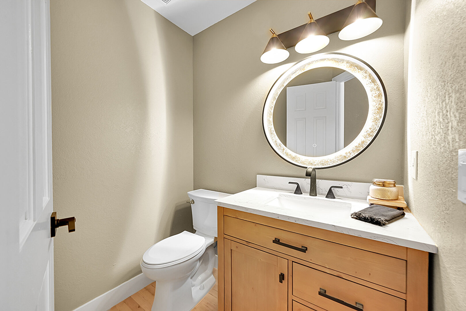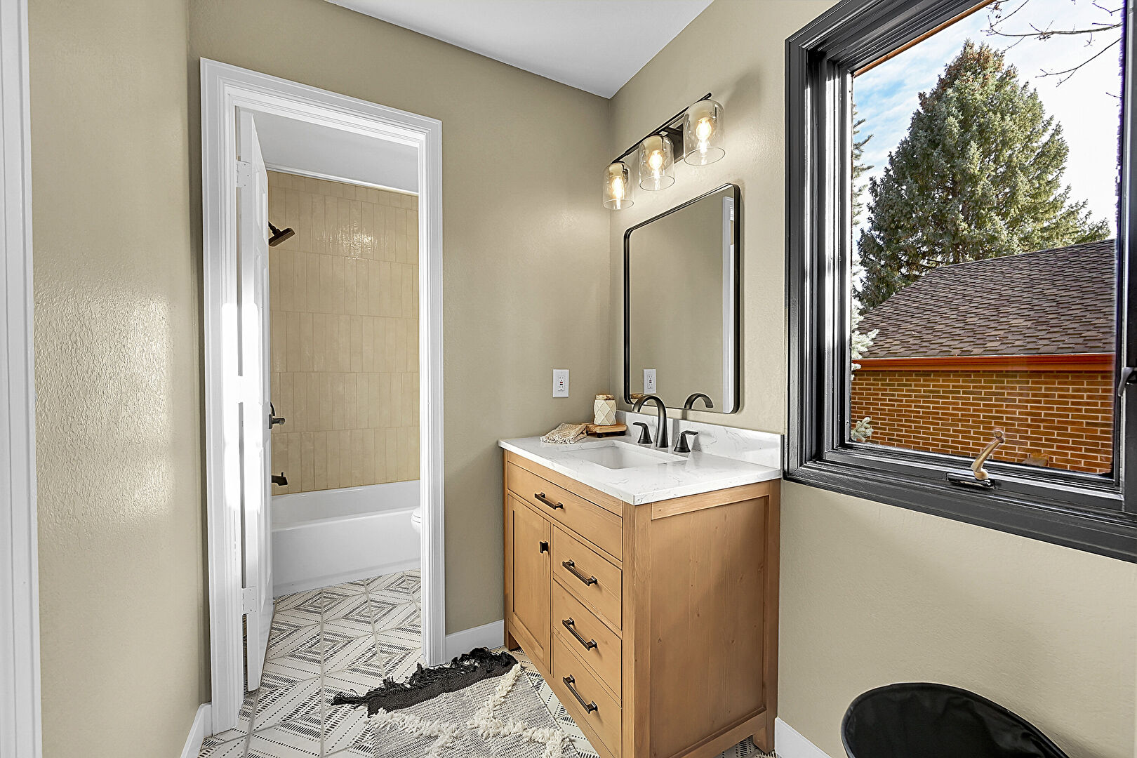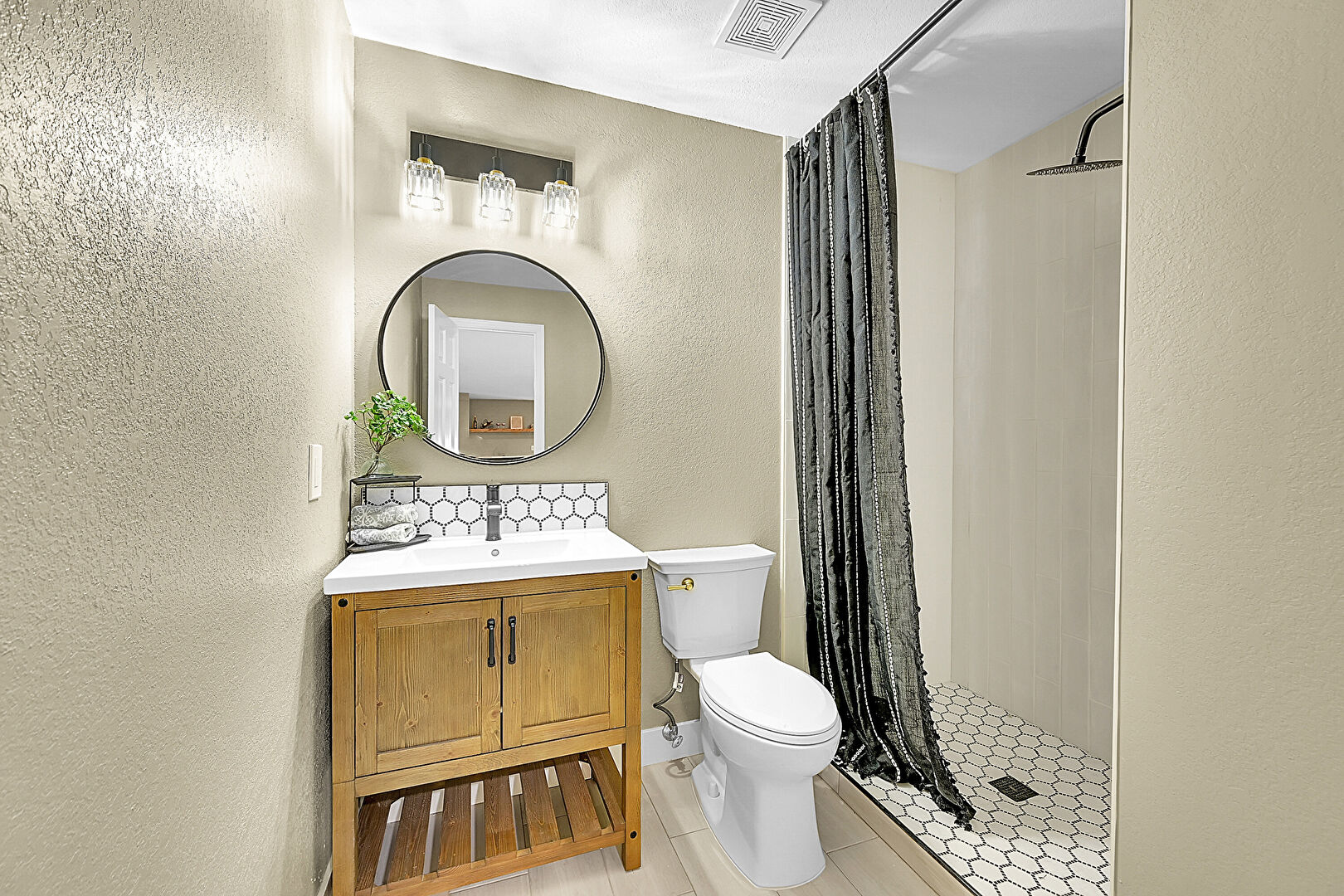 Baseboards Wall, Combined Bath Shower, Drywall, Full Bathroom, Half Bathroom, Textured Wall, Tile Floor, Vanity, Vinyl Floor, Full Bathroom, Natural Light, Vent, Wood Finish Floor