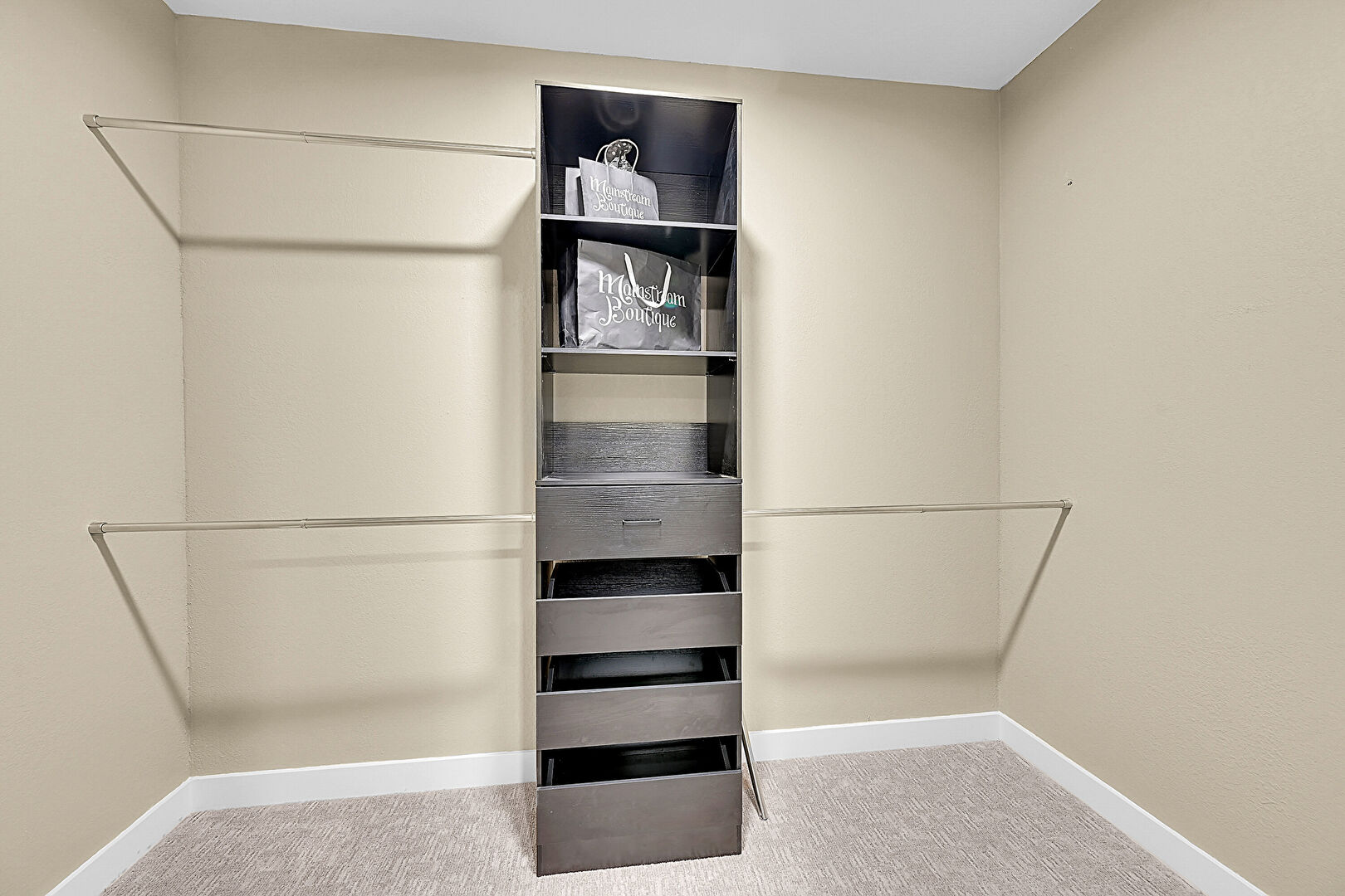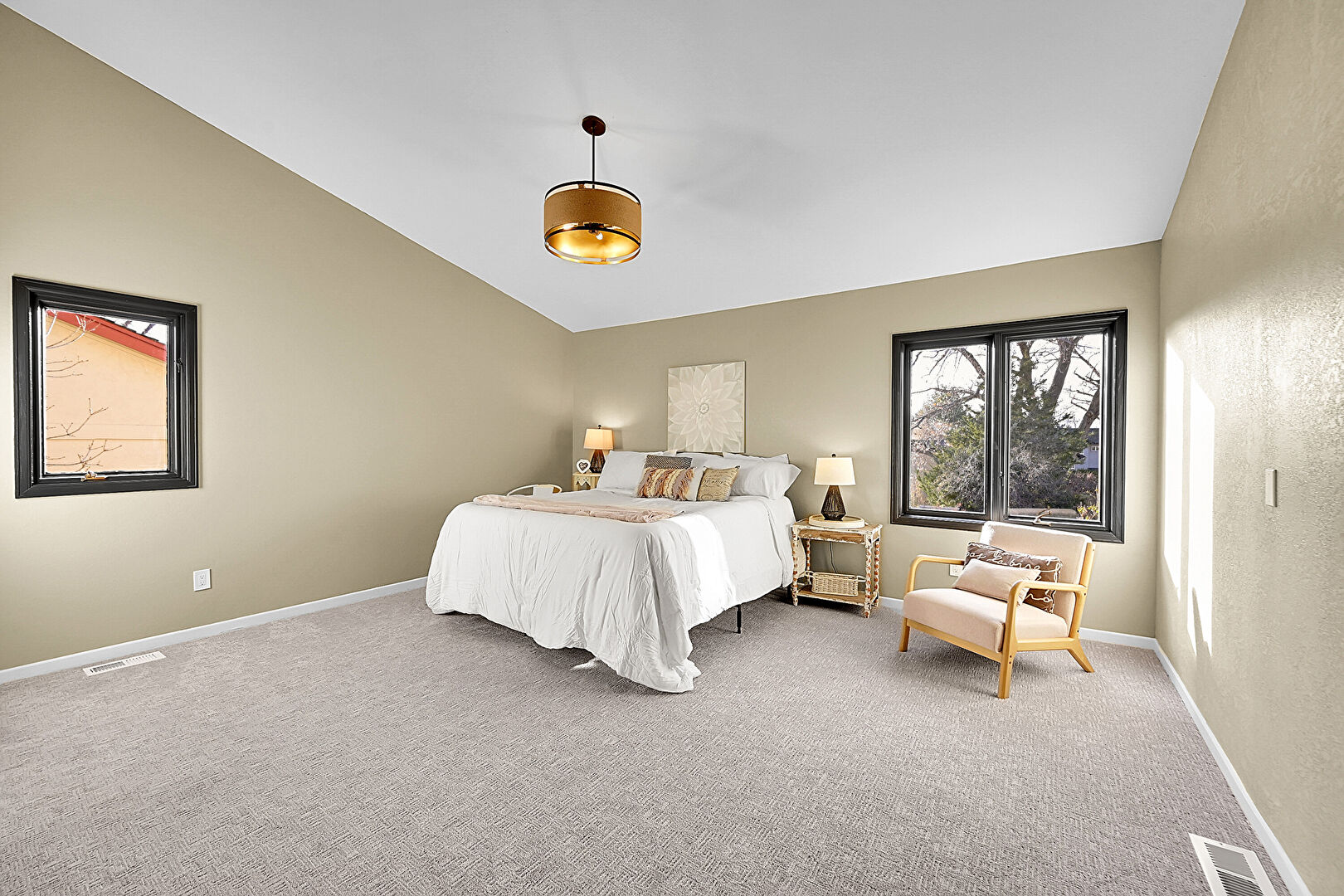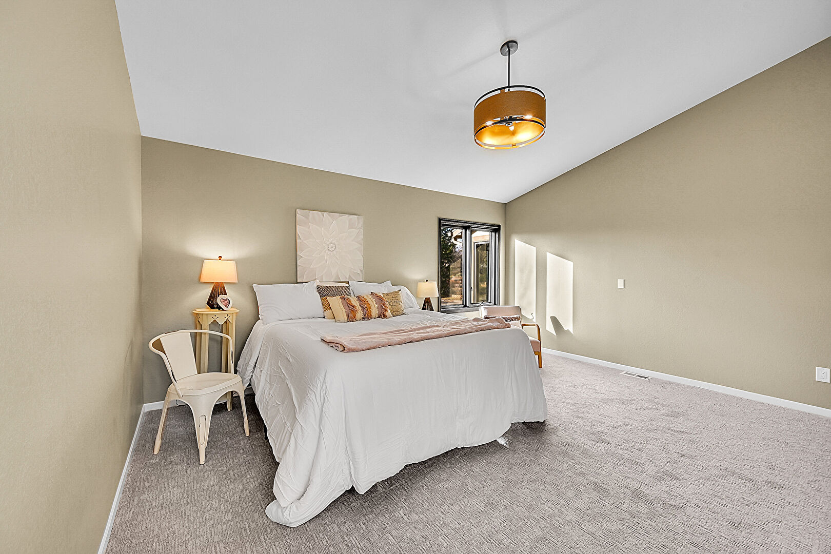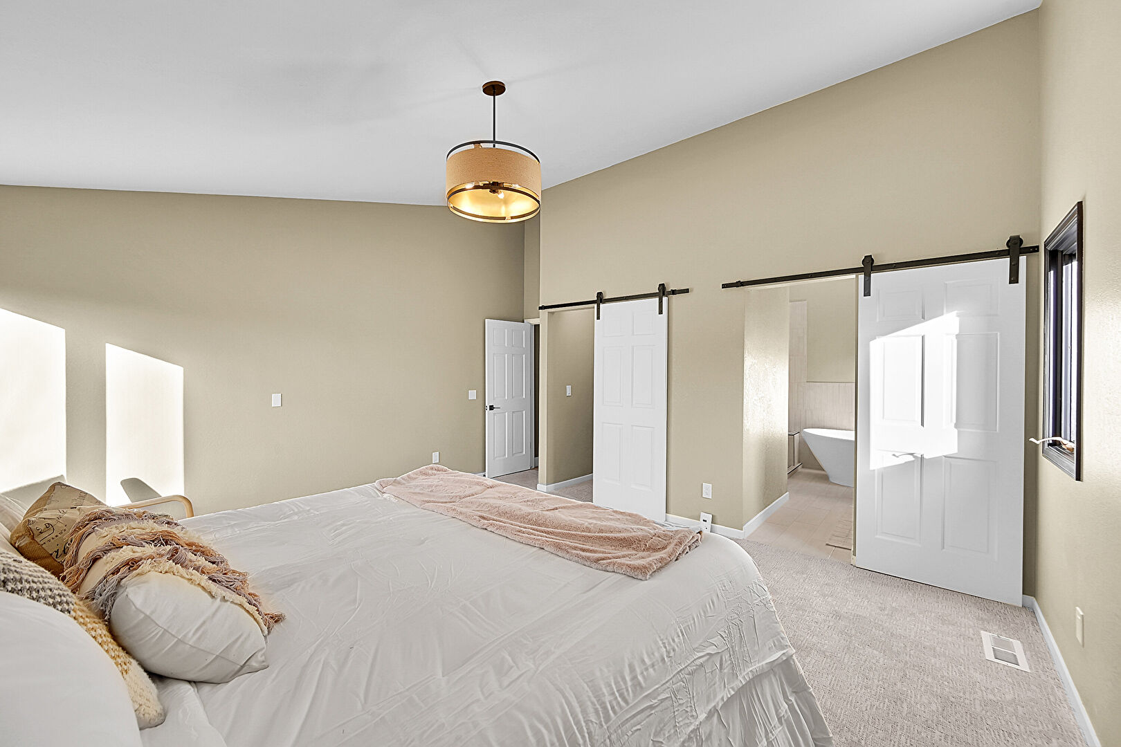 Barn Door, Baseboards Wall, Carpet, Drywall, Ensuite Bathroom, High Ceiling, Natural Light, Vaulted Ceiling, Vent, Drywall, Vaulted Ceiling, Vent