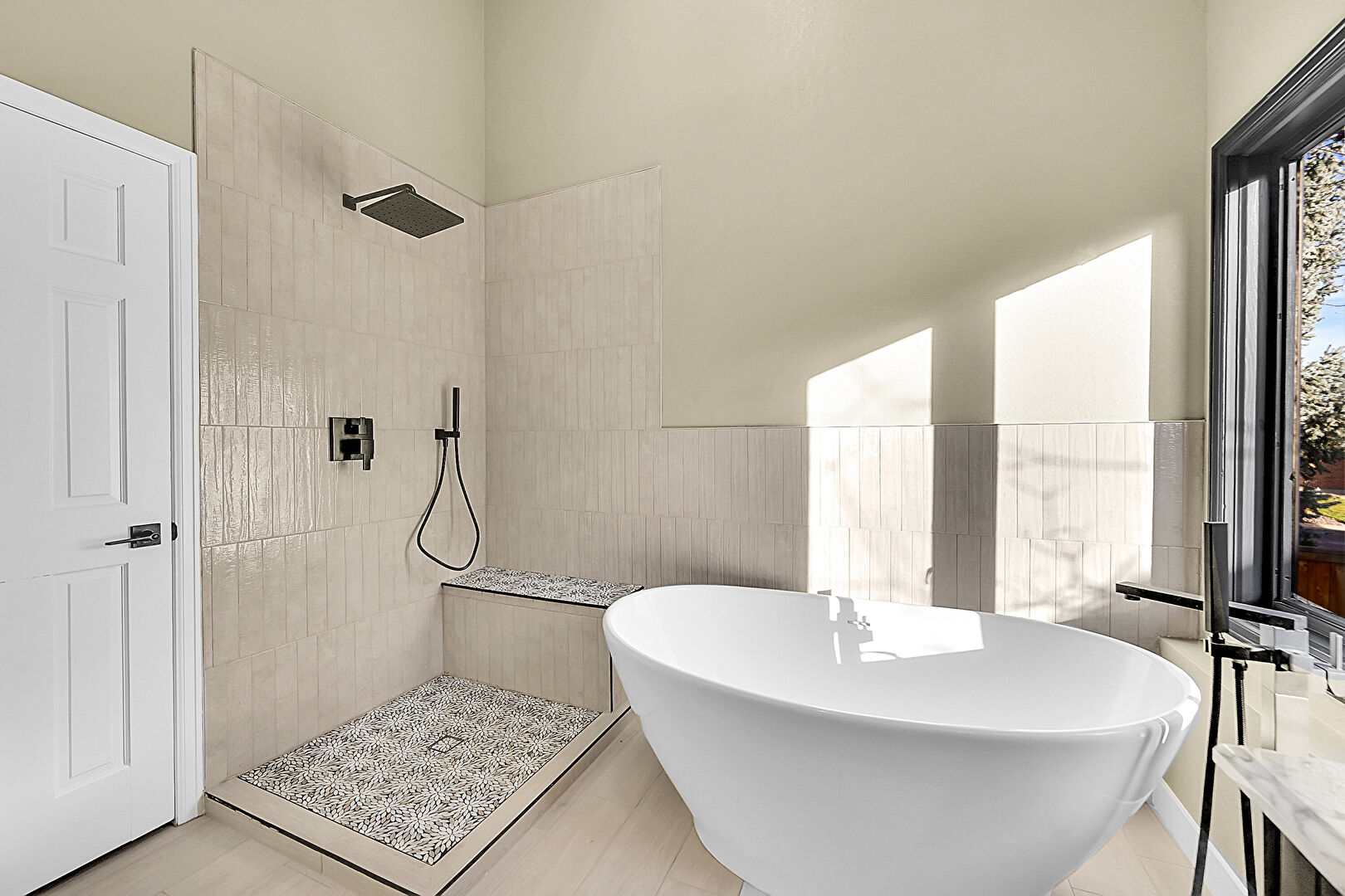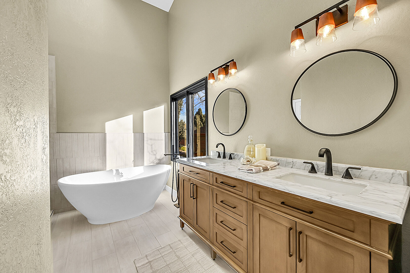 Double Vanity, Drywall, Full Bathroom, Natural Light, Tile Wall, Wainscot Wall, High Ceiling, Tile Wall