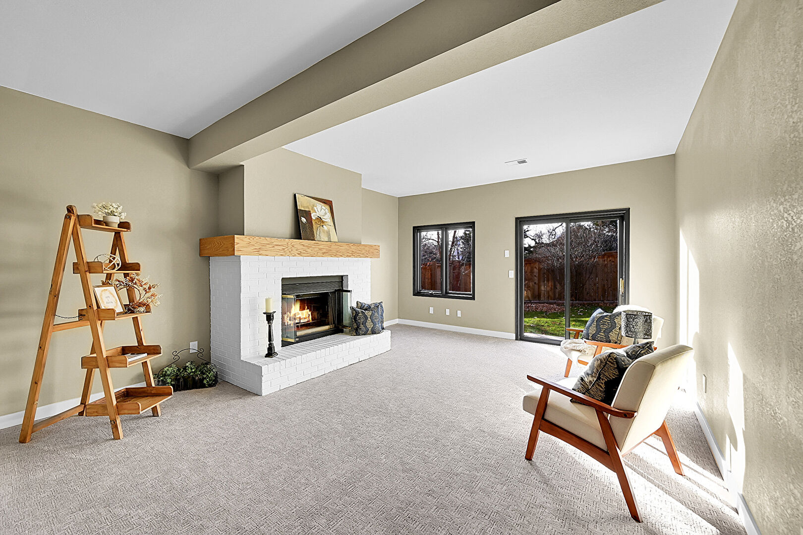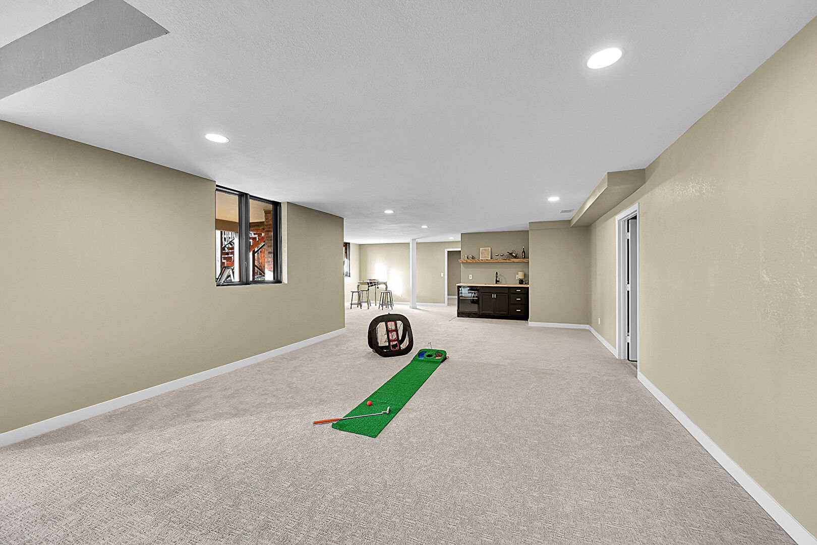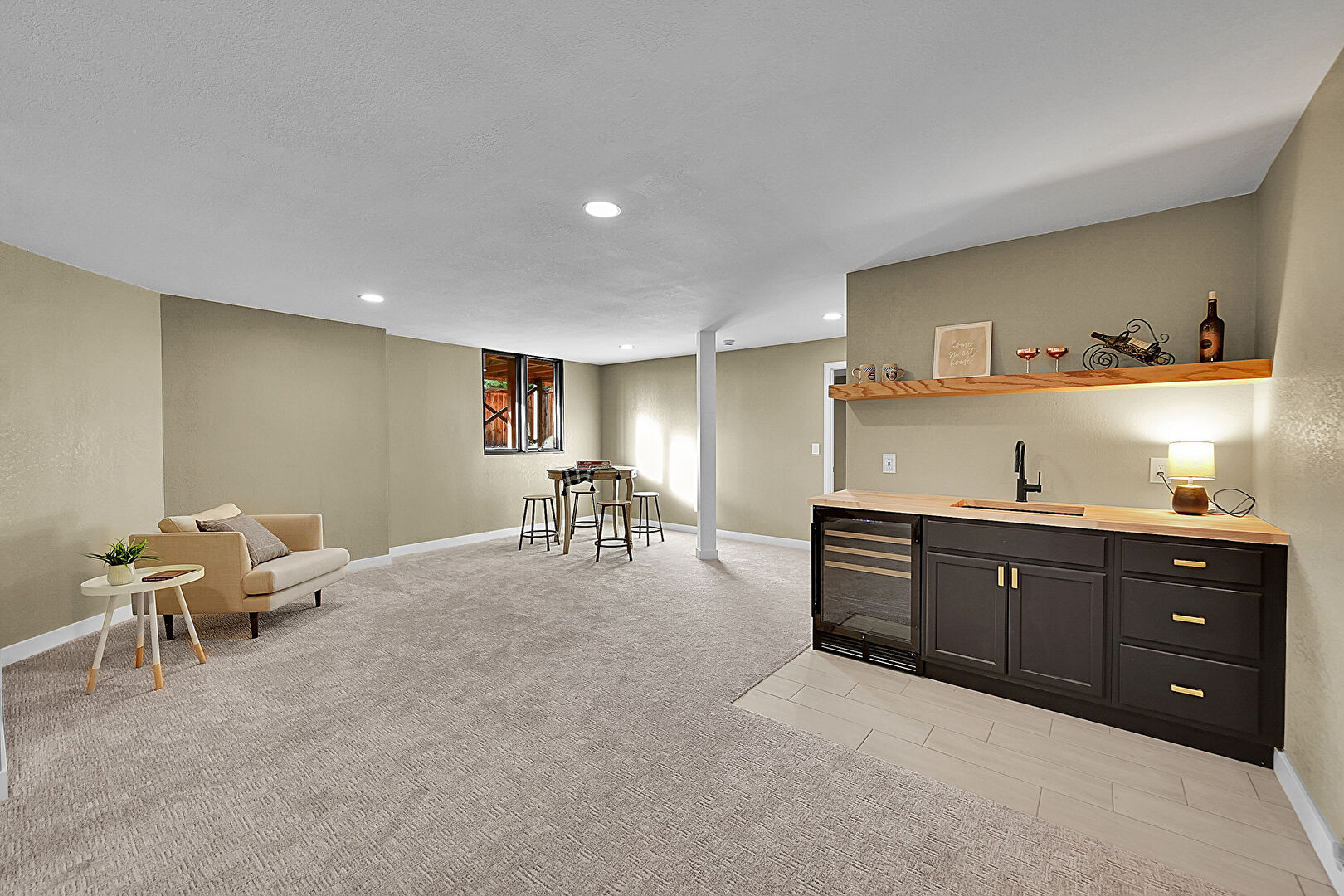Baseboards Wall, Basement, Carpet, Dark Brown Cabinets, Drywall, Fireplace, Indoor Bar, Natural Light, Open Shelves, Recessed Lighting, Shaker Cabinets, Vent, Wine Cooler, Baseboards Wall, Drywall, Fireplace, Indoor Bar, Smoke Carbon Monoxide Detector