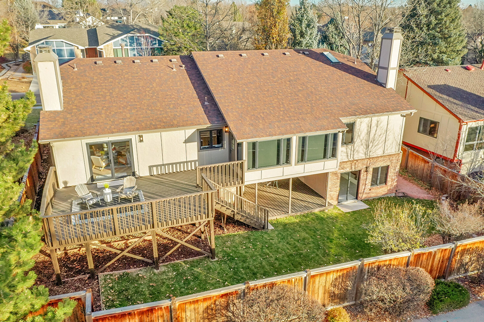 Chimney, Deck, Downspout, Fence, Gutters, Lawn, Patio, Shingle Roof, Stairs, Stone Siding, Sunroom, Woods View, Chimney, Vertical Siding