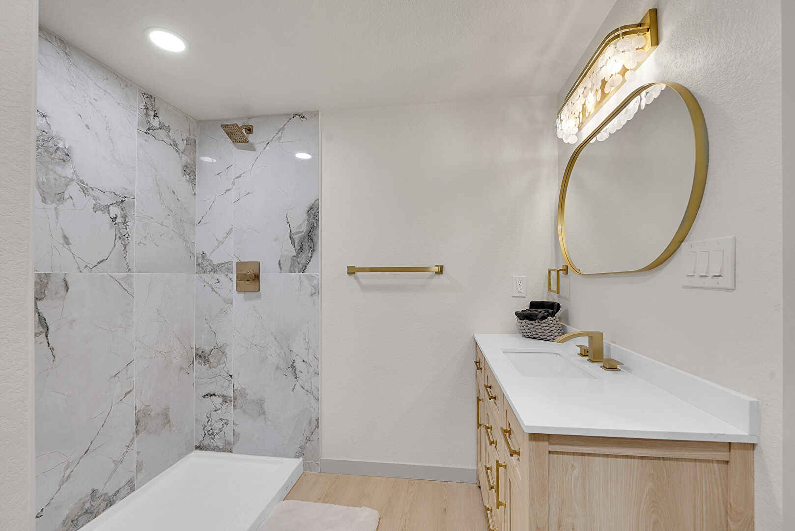 Baseboards Wall, Full Bathroom, Notable Chandelier, Vanity, Wood Finish Floor, Combined Bath Shower, Drywall