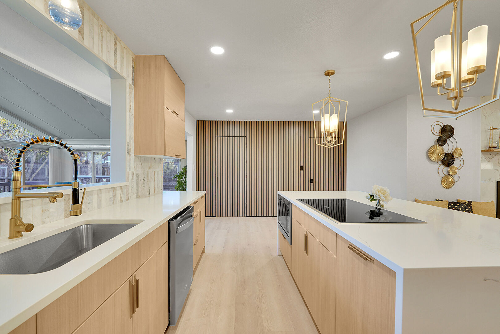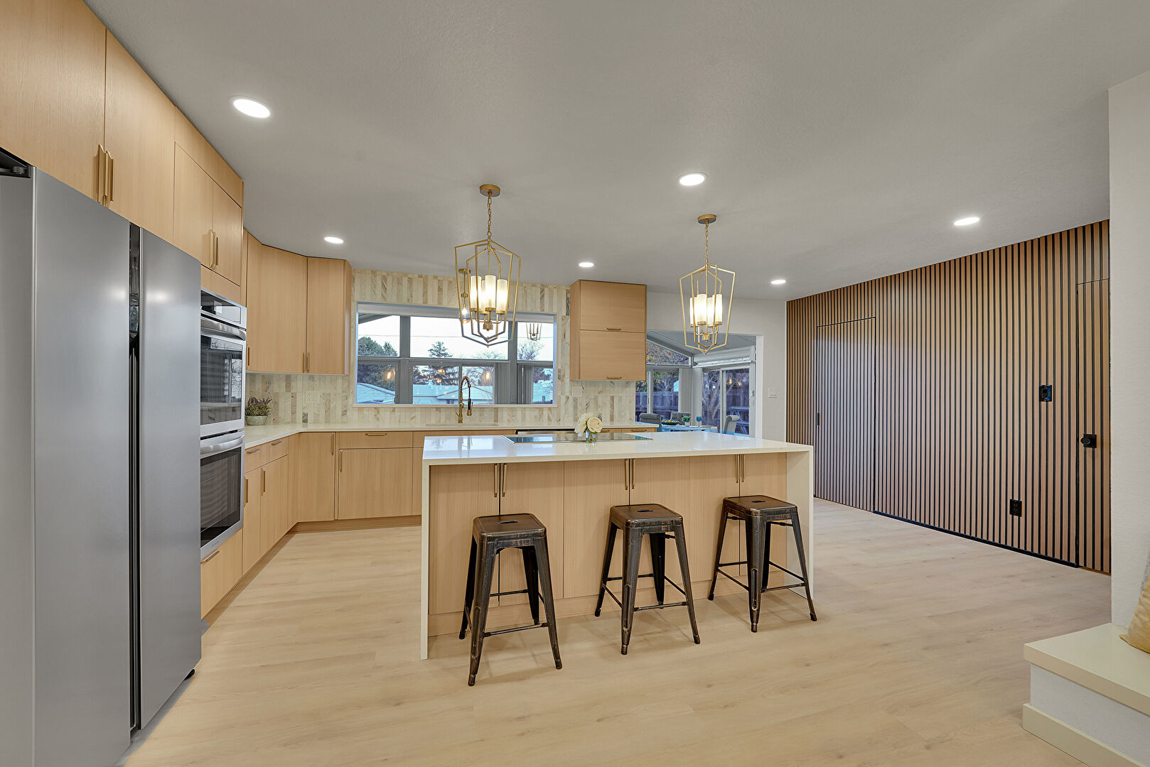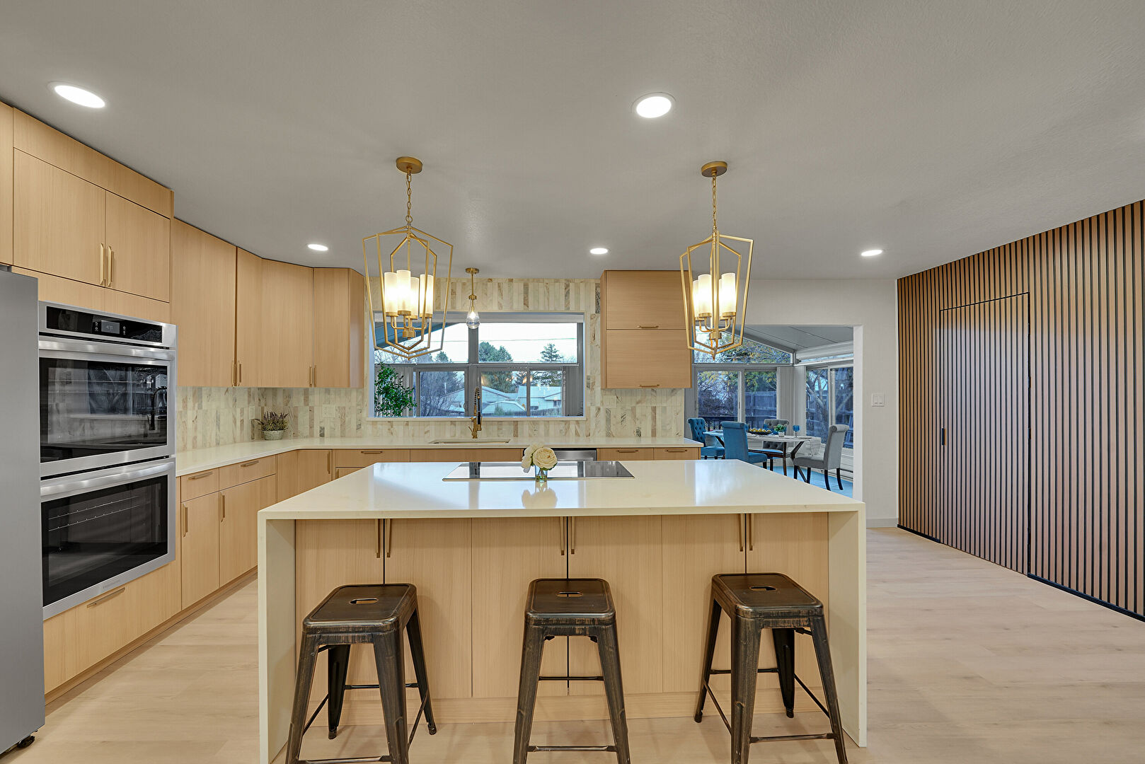 Baseboards Wall, Double Oven, Drywall, Flat Panel Cabinets, Kitchen Bar, Kitchen Island, L Shaped Kitchen, Natural Light, Notable Chandelier, Opens To Living Area, Pass Through Window, Pendant Lighting, Recessed Lighting, Stone Countertops, Vent, Wood Finish Floor, Wood Wall, Drywall, Kitchen Bar, Notable Chandelier, Stone Countertops, Vaulted Ceiling