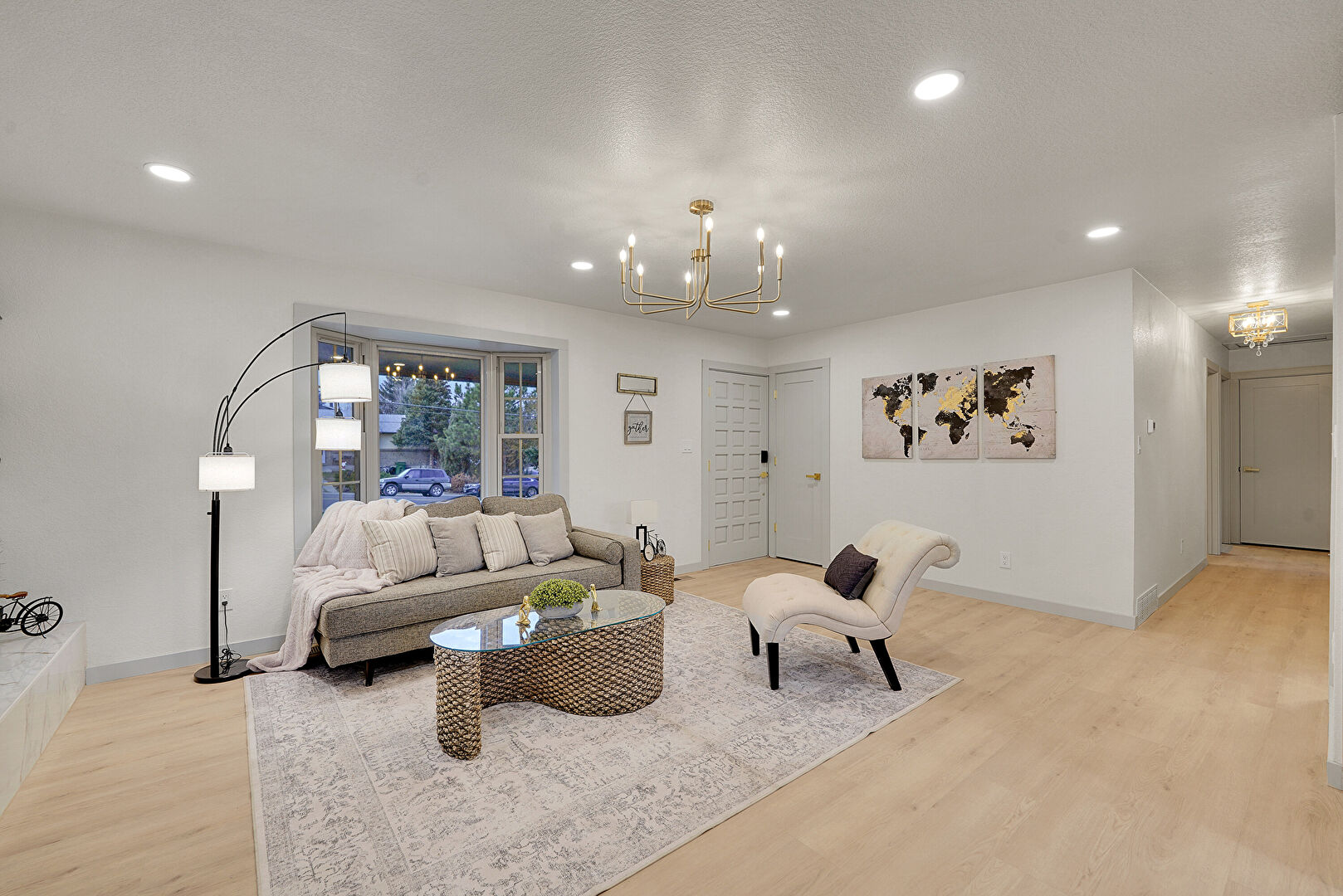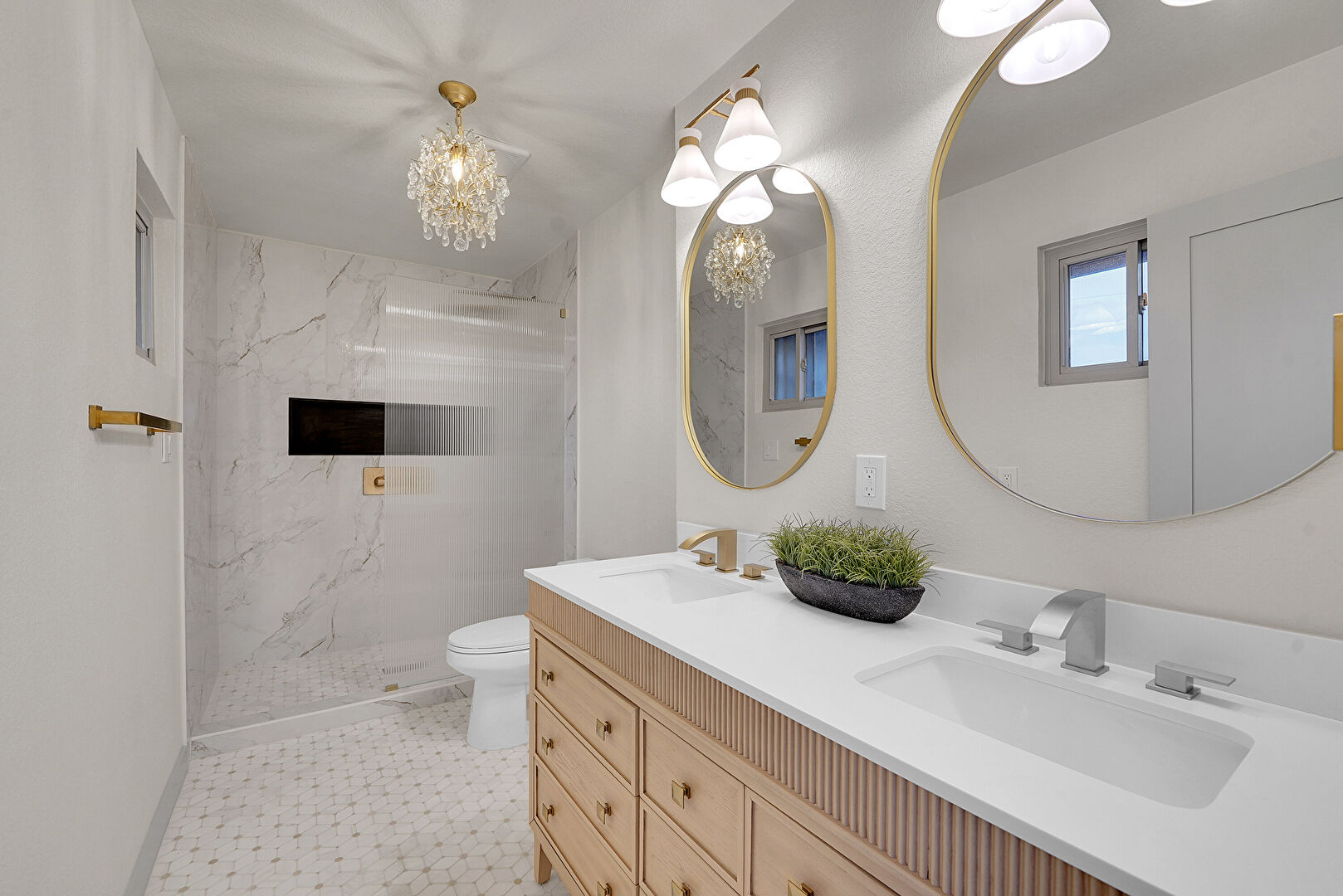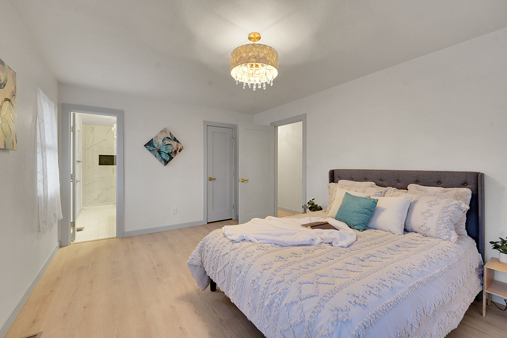Baseboards Wall, Drywall, Ensuite Bathroom, Notable Chandelier, Vent, Wood Finish Floor, Drywall, Natural Light