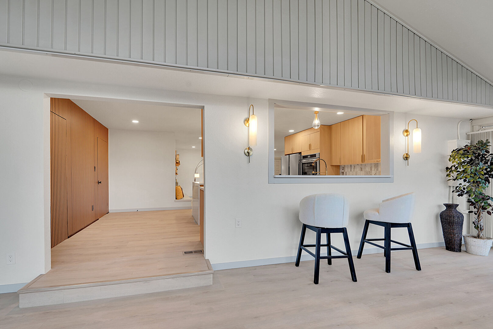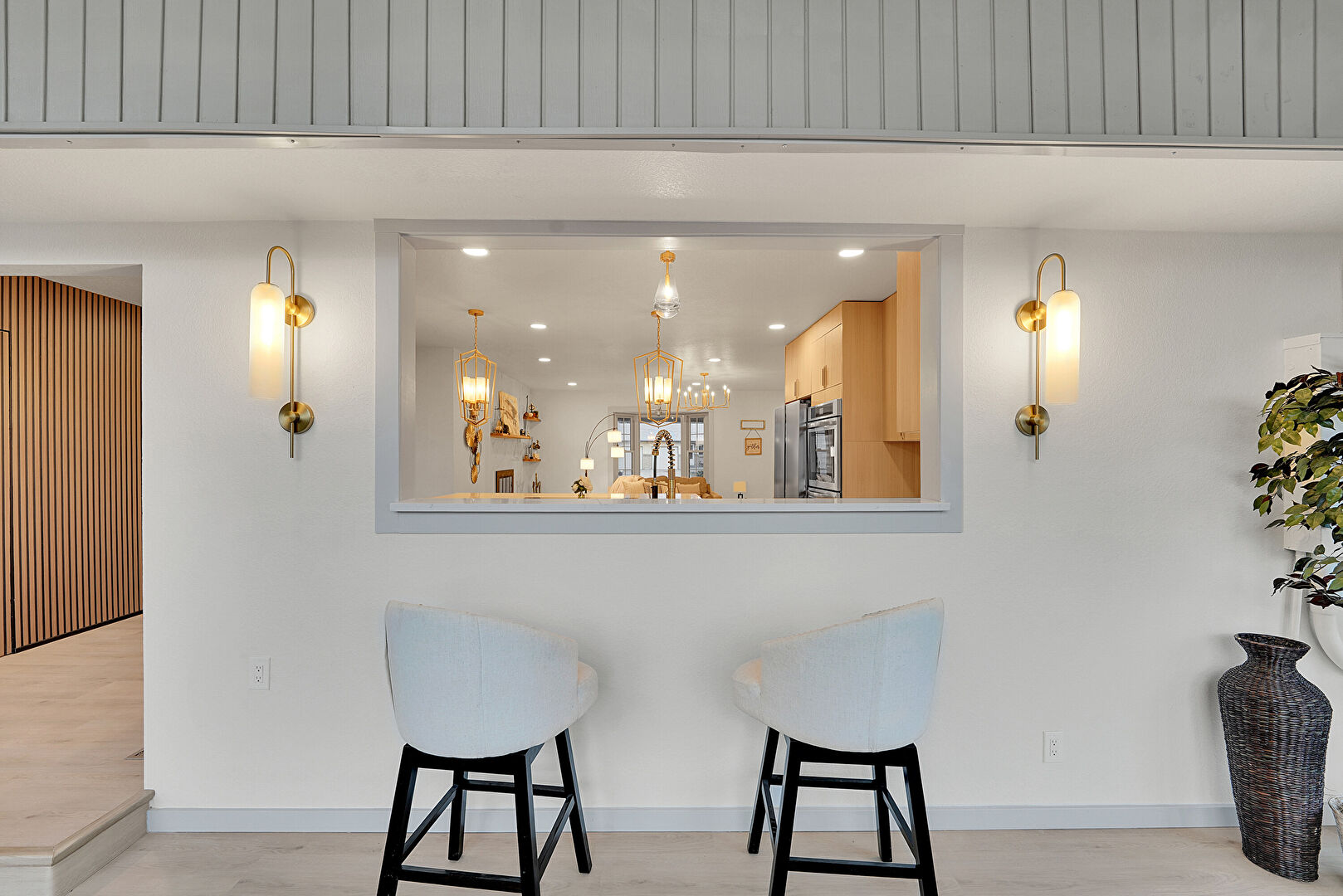 Baseboards Wall, Beamed Ceiling, Drywall, Gray Cabinets, Indoor Bar, Natural Light, Pendant Lighting, Recessed Lighting, Shaker Cabinets, Wine Cooler, Wood Ceiling, Wood Finish Floor, Wood Wall, Baseboards Wall, Notable Chandelier