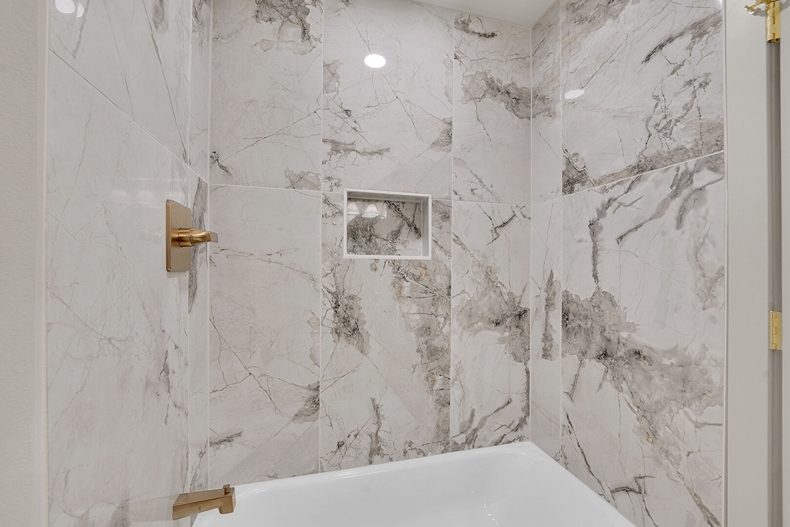 Baseboards Wall, Double Vanity, Drywall, Full Bathroom, Notable Chandelier, Recessed Lighting, Tile Floor, Vanity, Walk In Closet, Wood Finish Floor, Baseboards Wall, Drywall, Textured Ceiling
