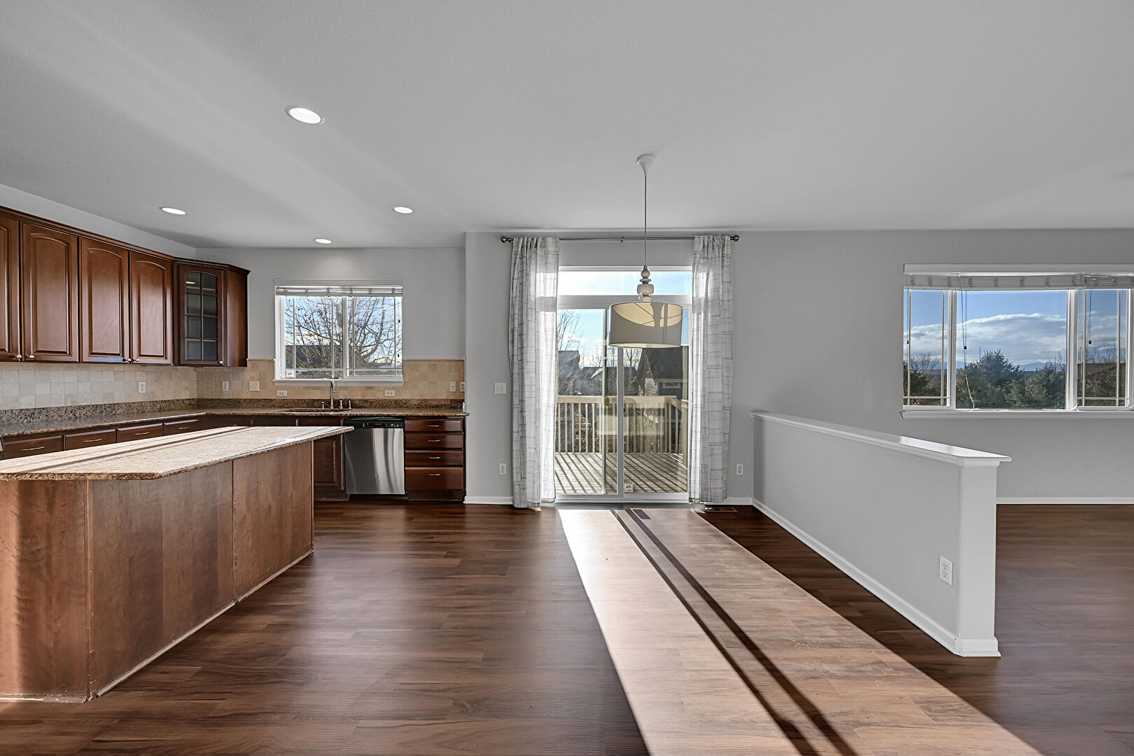 Arched Cabinets, Baseboards Wall, Crown Molding Cabinets, Dark Brown Cabinets, Drywall, Glass Insert Cabinets, Kitchen Island, L Shaped Kitchen, Medium Brown Cabinets, Natural Light, Opens To Living Area, Pendant Lighting, Raised Cabinets, Recessed Lighting, Stone Countertops, Vent, Wood Finish Floor, Baseboards Wall, Kitchen Island