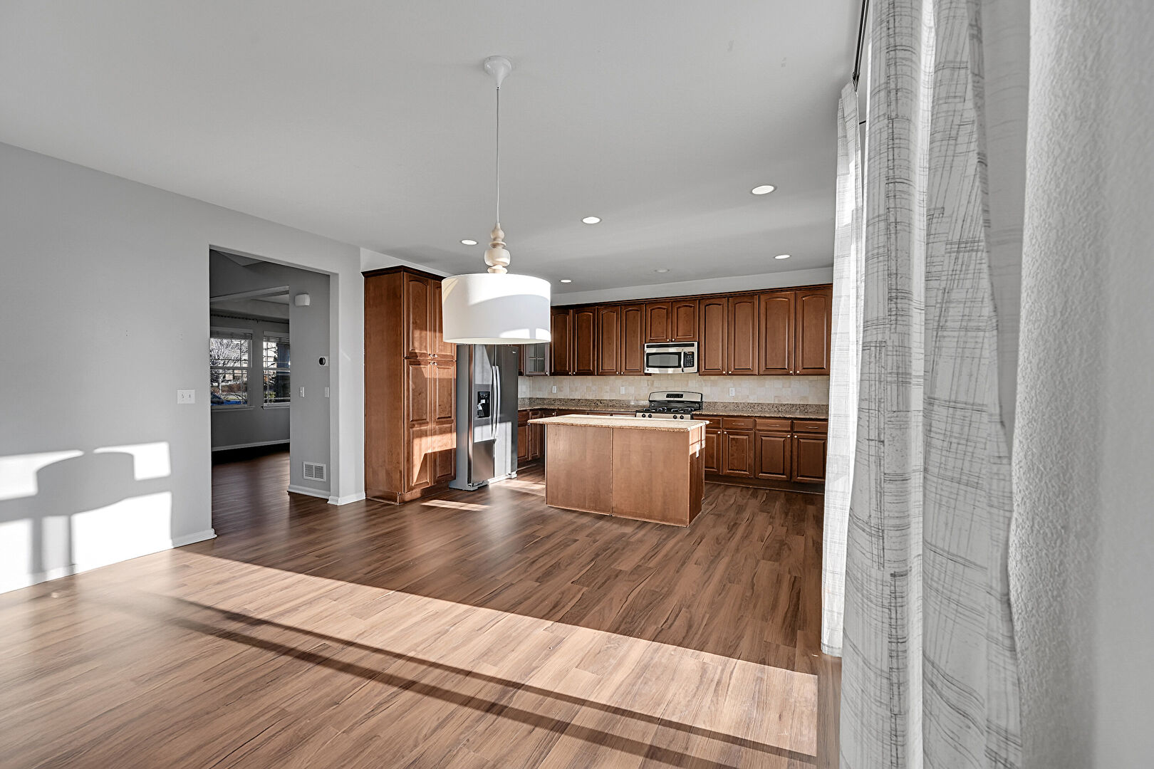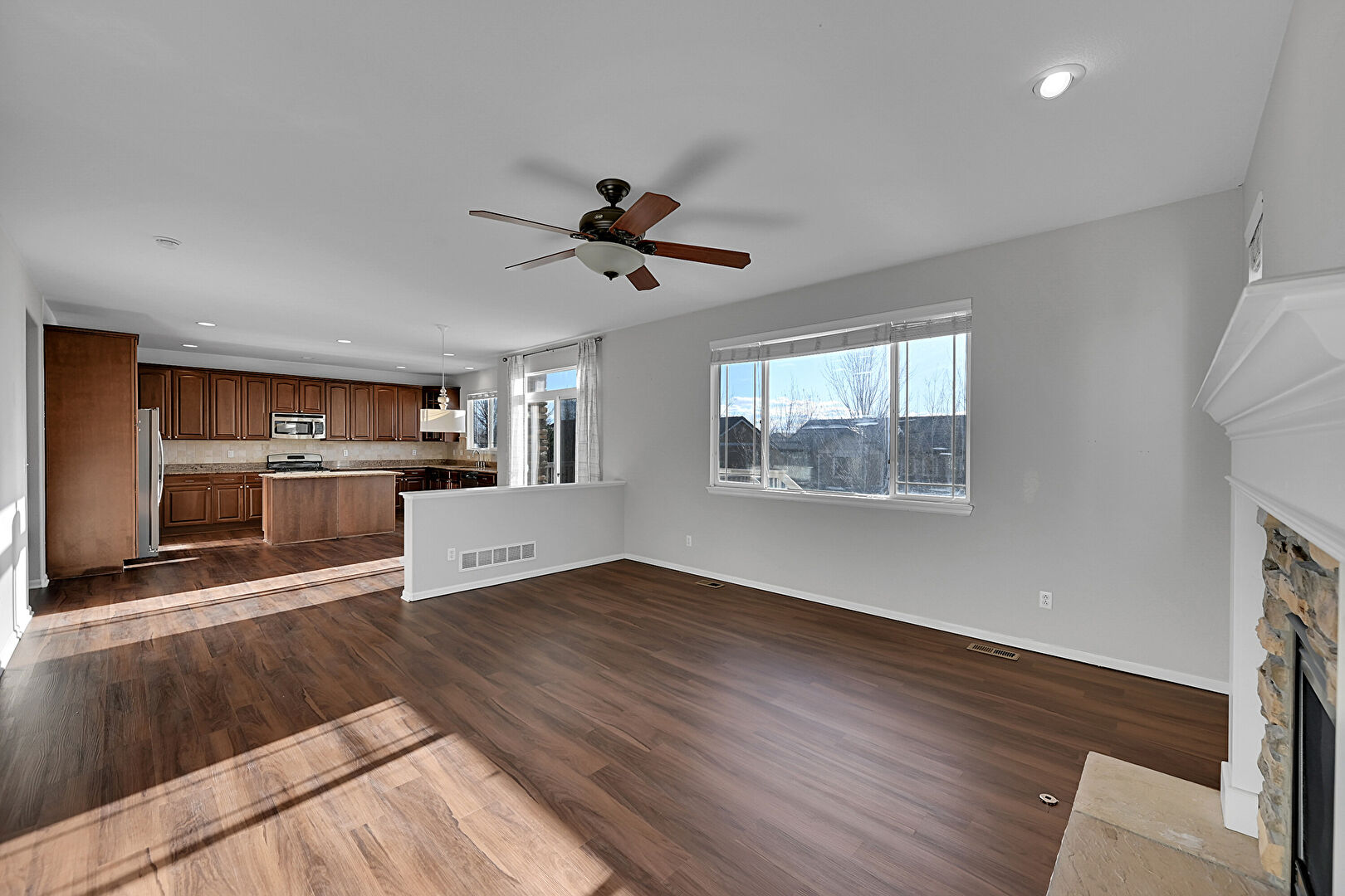 Baseboards Wall, Ceiling Fan, Drywall, Fireplace, Natural Light, Recessed Lighting, U Shaped Kitchen, Vent, Wood Finish Floor, Natural Light, Wood Finish Floor