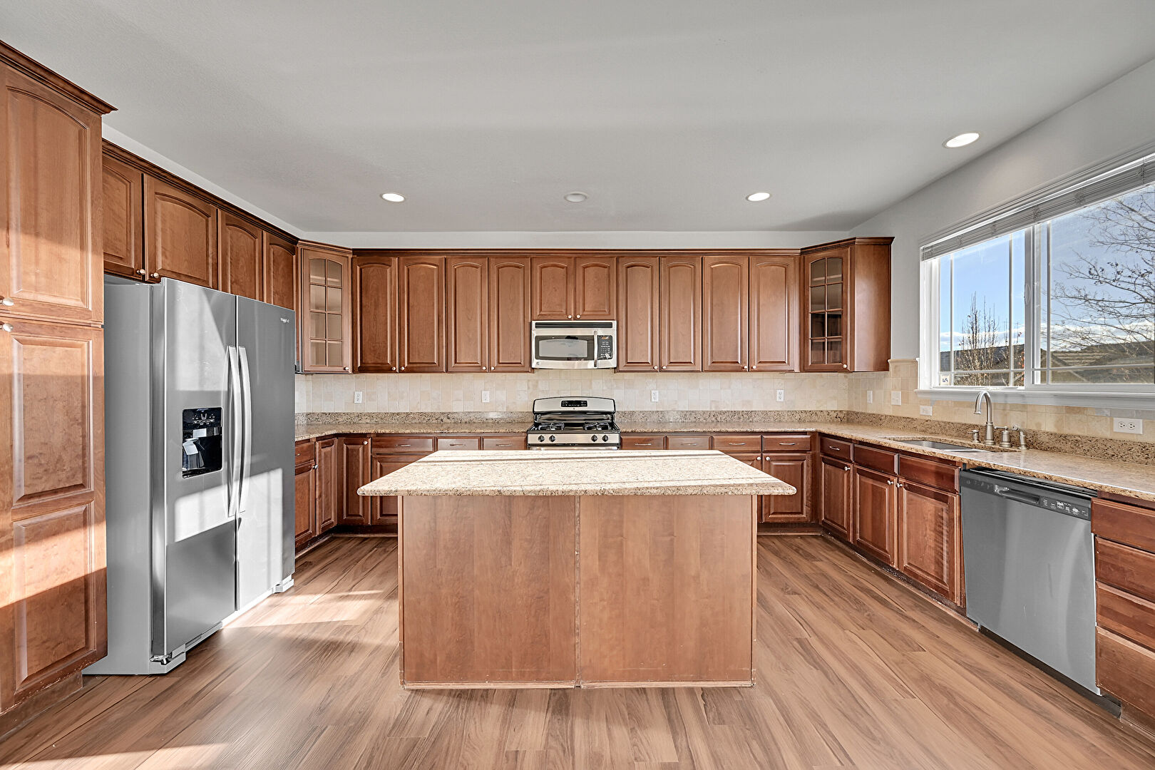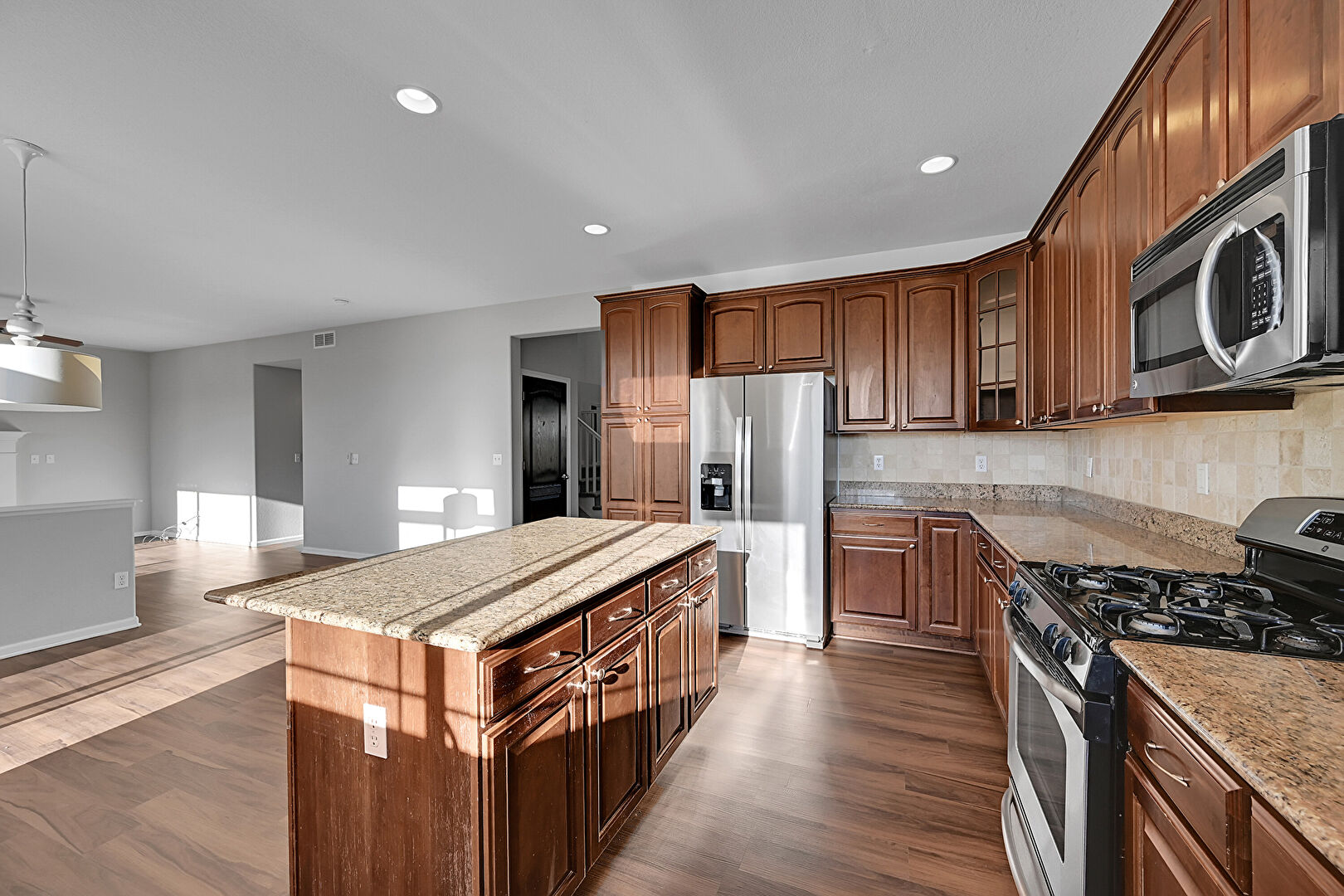 Arched Cabinets, Baseboards Wall, Crown Molding Cabinets, Drywall, Glass Insert Cabinets, Kitchen Island, Medium Brown Cabinets, Natural Light, Opens To Living Area, Pendant Lighting, Raised Cabinets, Recessed Lighting, Stone Countertops, U Shaped Kitchen, Vent, Wood Finish Floor, Ceiling Fan, Medium Brown Cabinets