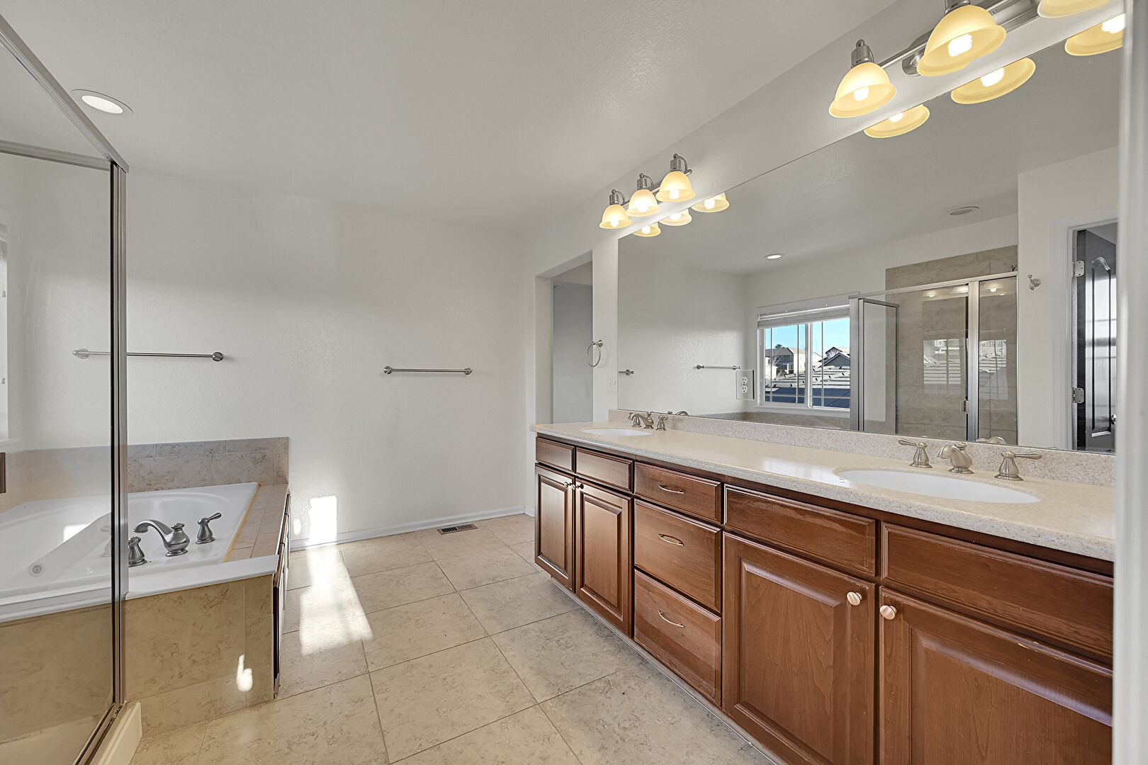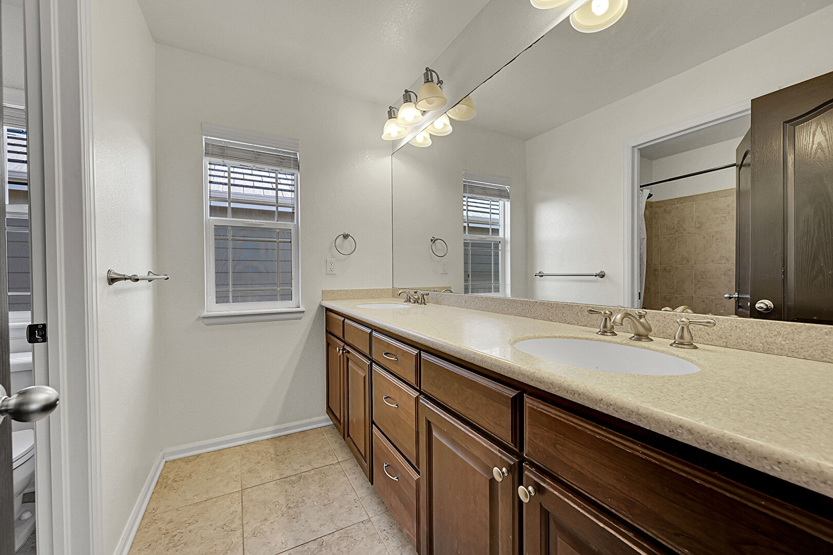 Baseboards Wall, Double Vanity, Drywall, Full Bathroom, Natural Light, Tile Floor