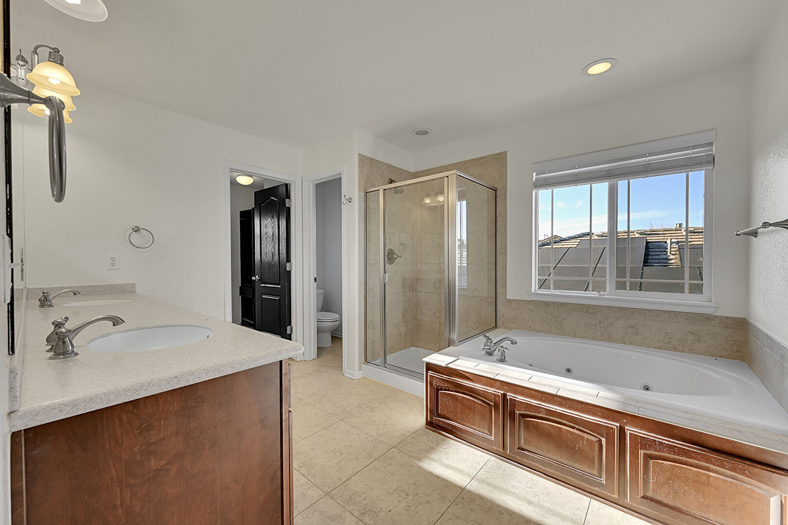 Baseboards Wall, Double Vanity, Drywall, Full Bathroom, Natural Light, Recessed Lighting, Tile Floor, Vent, Water Closet, Full Bathroom, Recessed Lighting