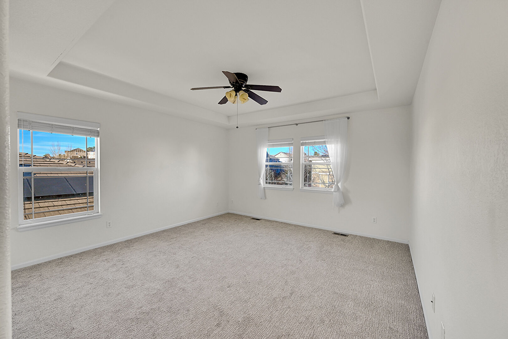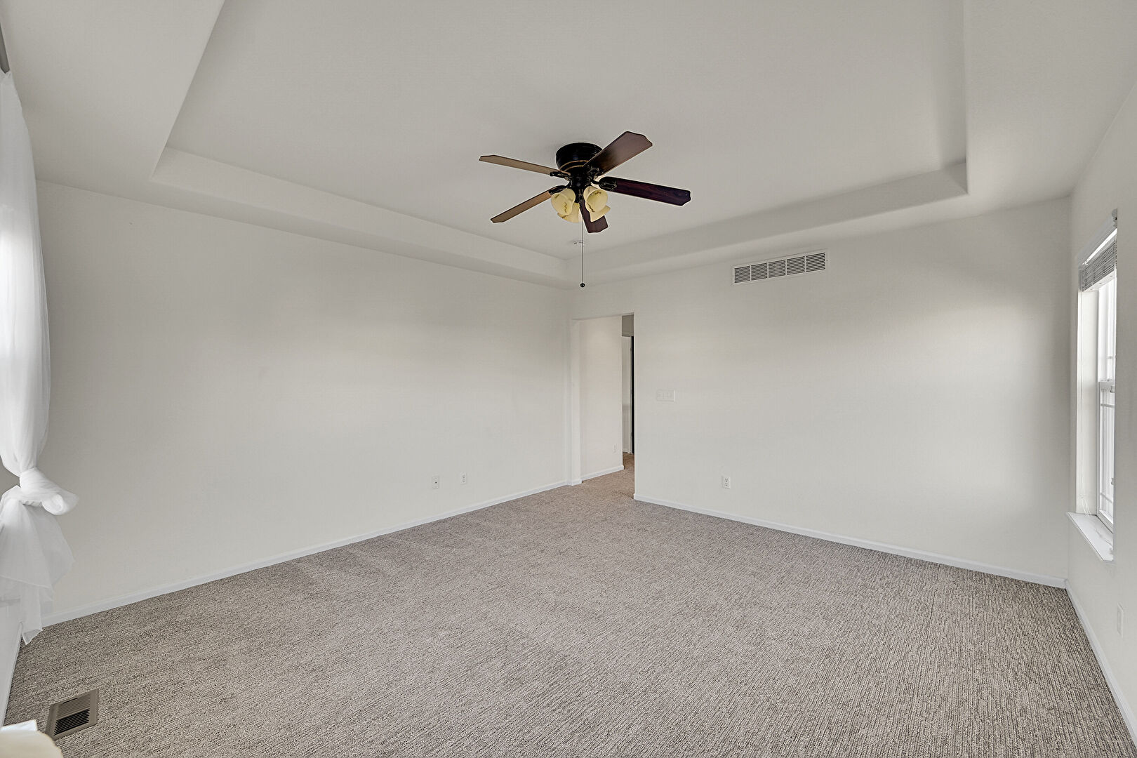 Baseboards Wall, Carpet, Ceiling Fan, Drywall, Natural Light, Tray Ceiling, Vent, Carpet, Vent