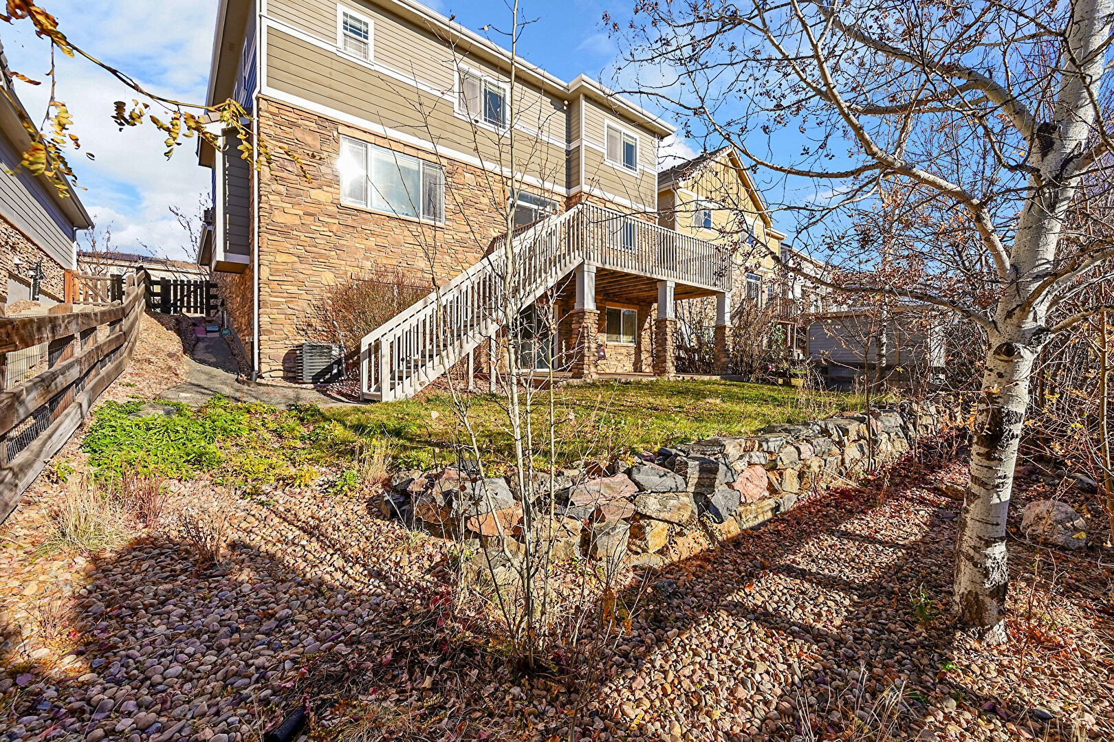 Central Ac, Downspout, Fence, Gutters, Horizontal Siding, Lawn, Stairs, Stone Siding, Deck