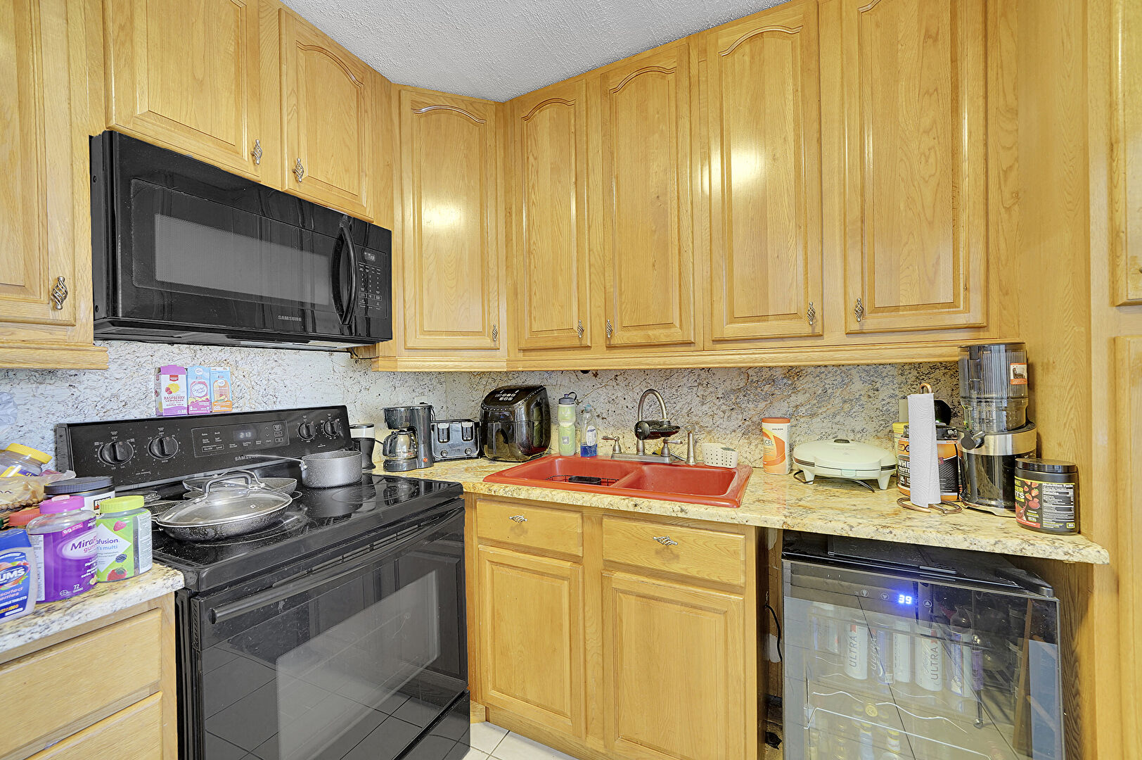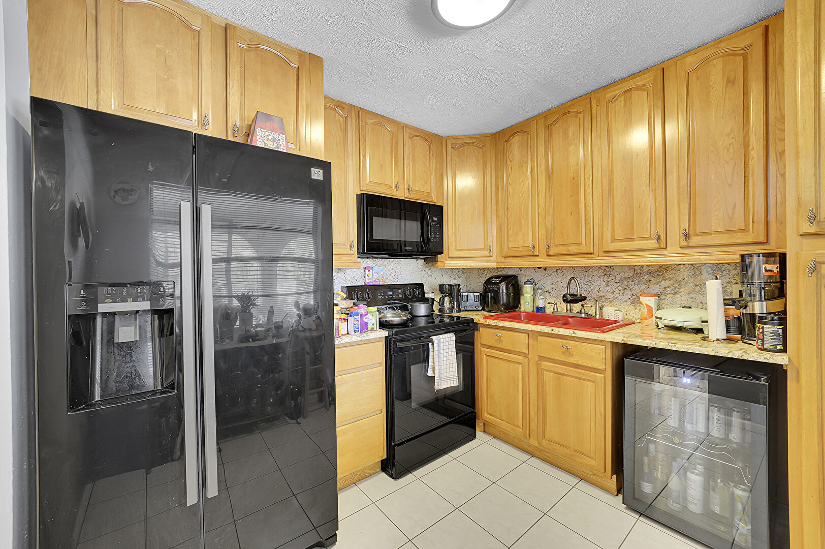 Baseboards Wall, Electric Panel, Medium Brown Cabinets, Natural Light, Raised Cabinets, Stone Countertops, Textured Ceiling, Tile Floor, Vent, Wine Cooler, Arched Cabinets, Drywall