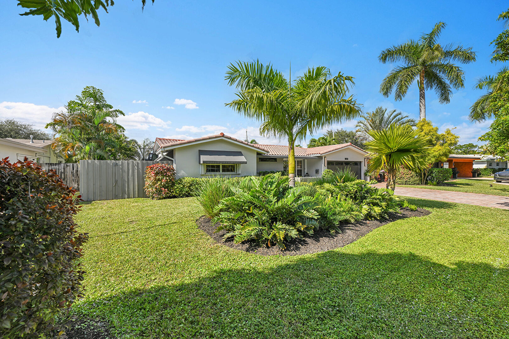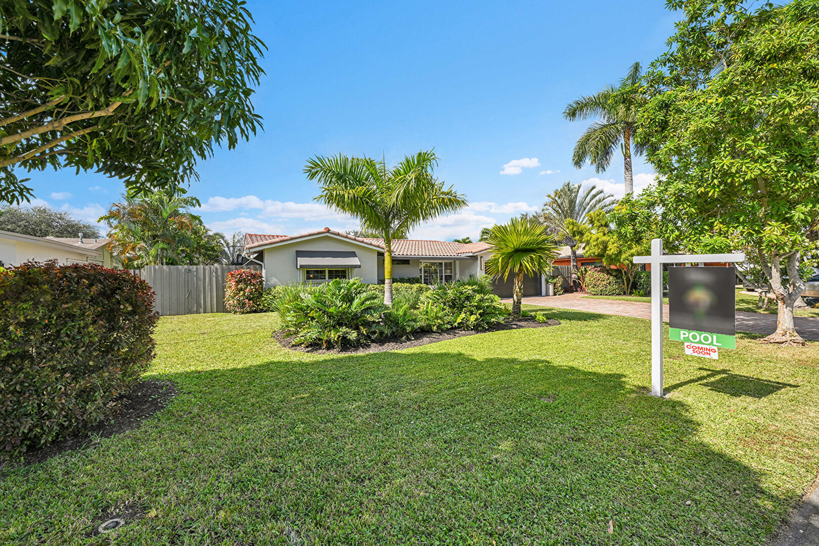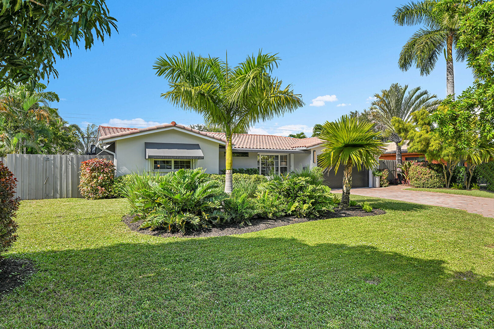 Awning, Downspout, Driveway, Fence, Gutters, Lawn, Stucco Siding, Tile Roof, Fence, Lawn, Stucco Siding