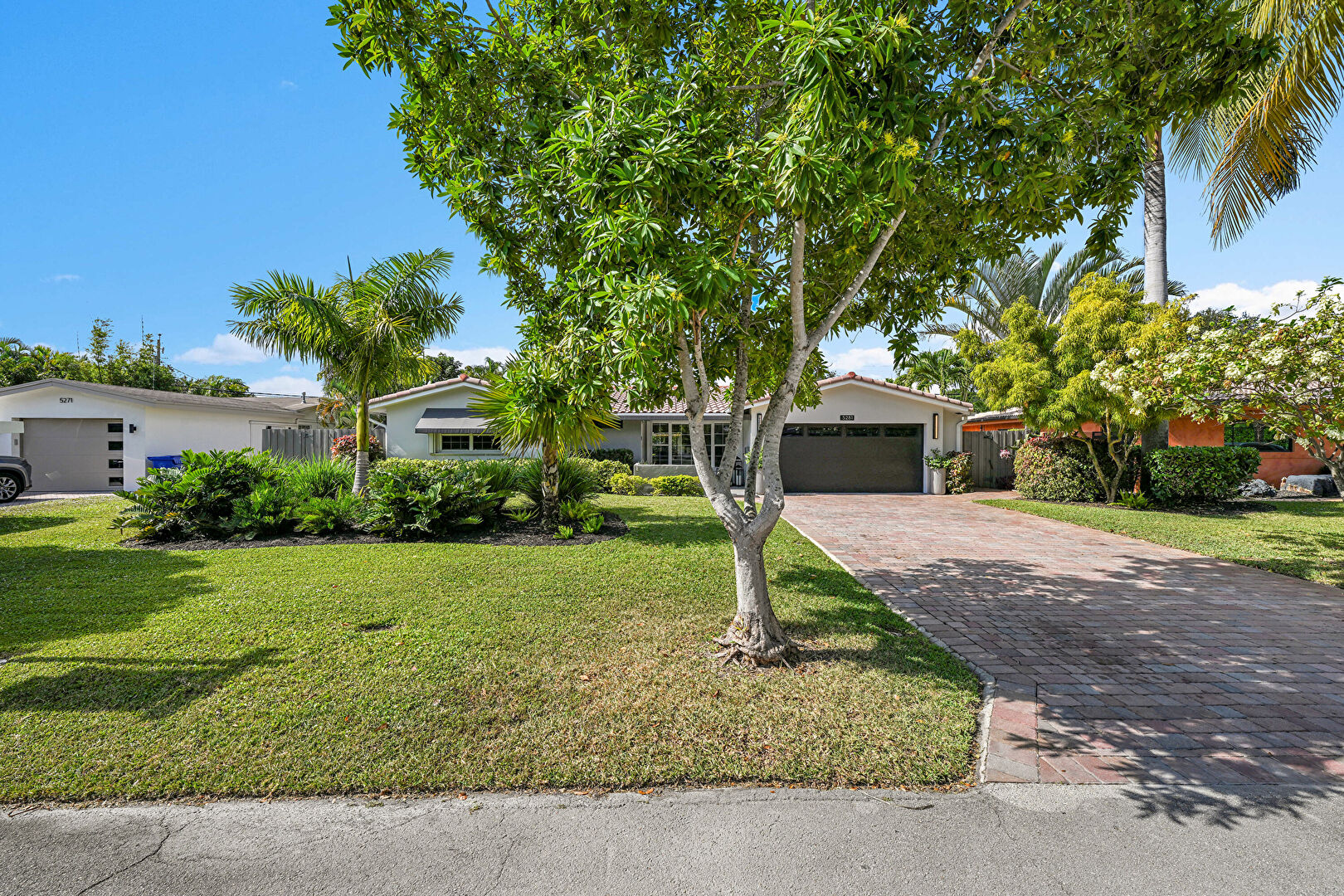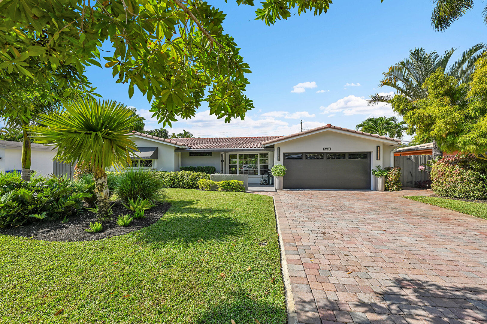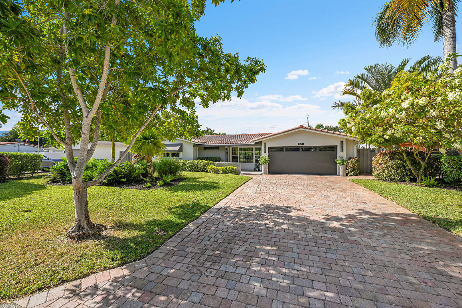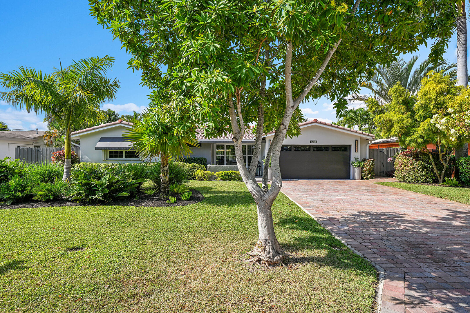 Awning, Downspout, Driveway, Fence, Gutters, Lawn, Stucco Siding, Tile Roof, Fence, Lawn, Stucco Siding