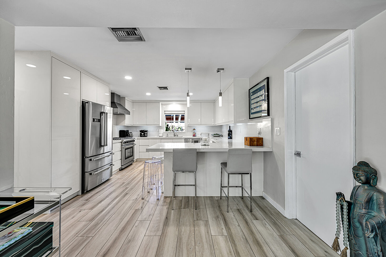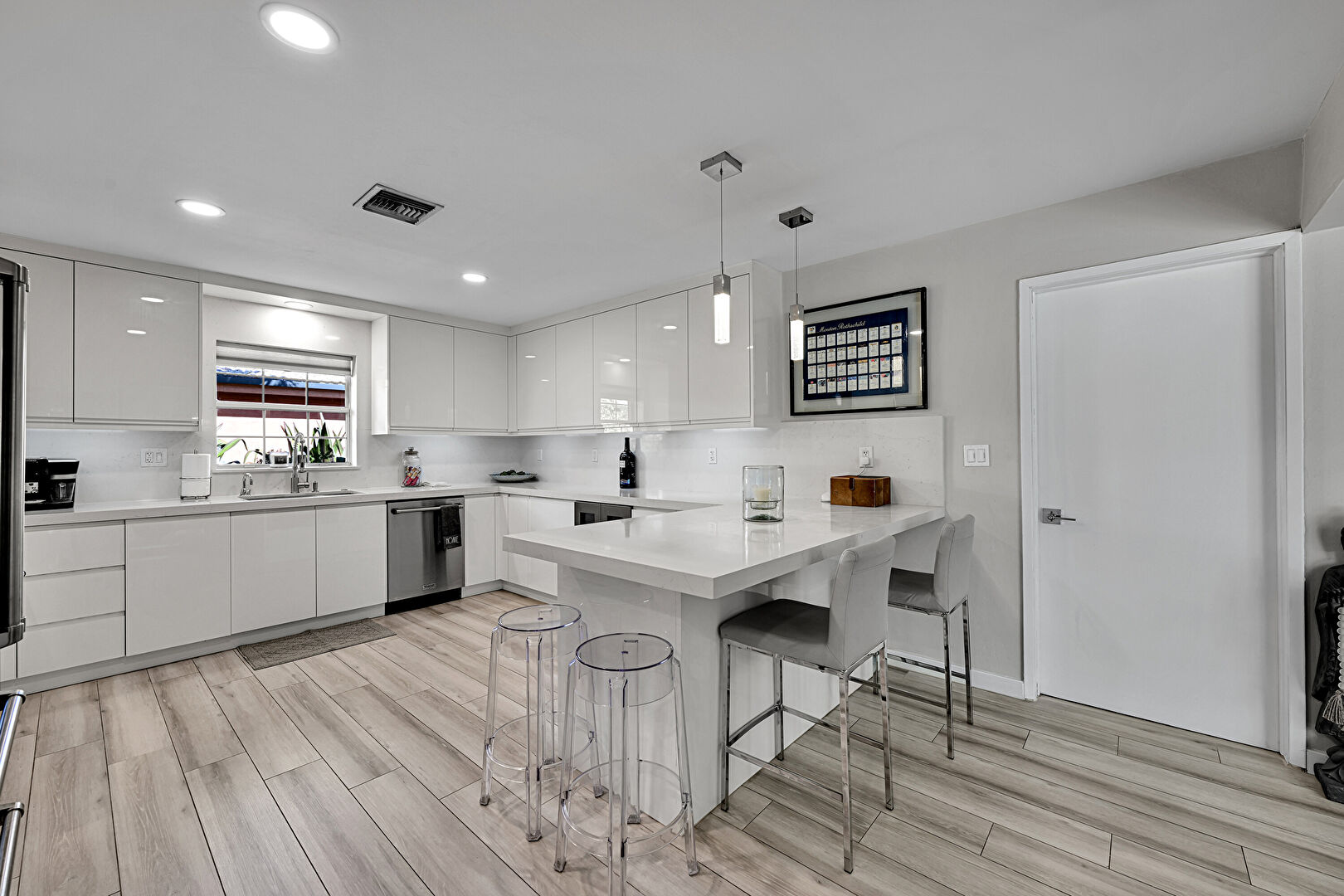Baseboards Wall, Drywall, Flat Panel Cabinets, G Shaped Kitchen, Kitchen Bar, Kitchen Peninsula, Natural Light, Pendant Lighting, Pot Filler, Recessed Lighting, Stone Countertops, Vent, Wine Cooler, Wood Finish Floor, Drywall, Flat Panel Cabinets, G Shaped Kitchen, Kitchen Peninsula, Pot Filler