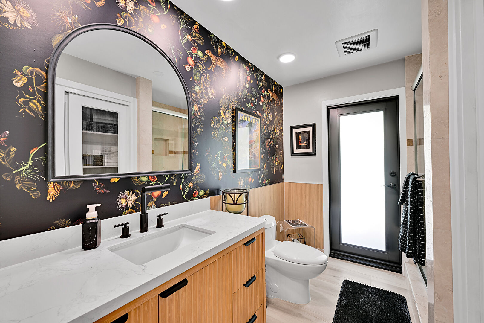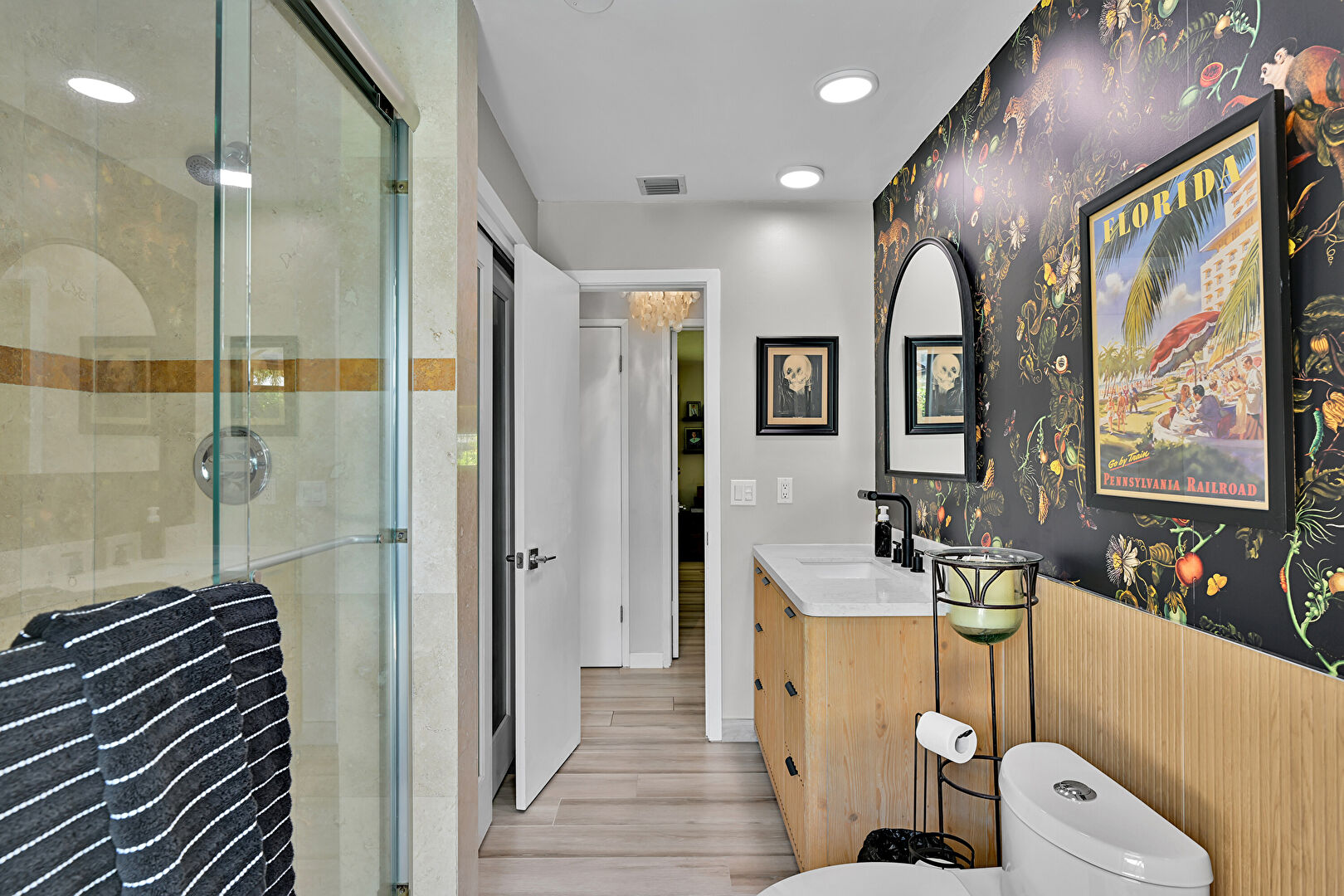 Accent Wall, Baseboards Wall, Double Vanity, Drywall, Full Bathroom, Natural Light, Recessed Lighting, Vanity, Vent, Wainscot Wall, Wallpaper Wall, Wood Finish Floor, Drywall, Full Bathroom, Vanity