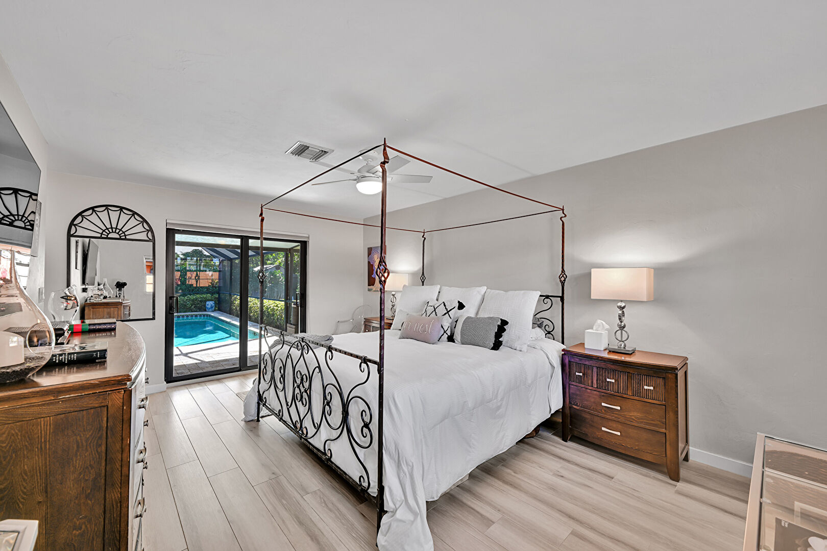 Access To Exterior, Baseboards Wall, Ceiling Fan, Drywall, Natural Light, Pool View, Vent, Wood Finish Floor, Baseboards Wall, Drywall, Natural Light, Vent, Wood Finish Floor
