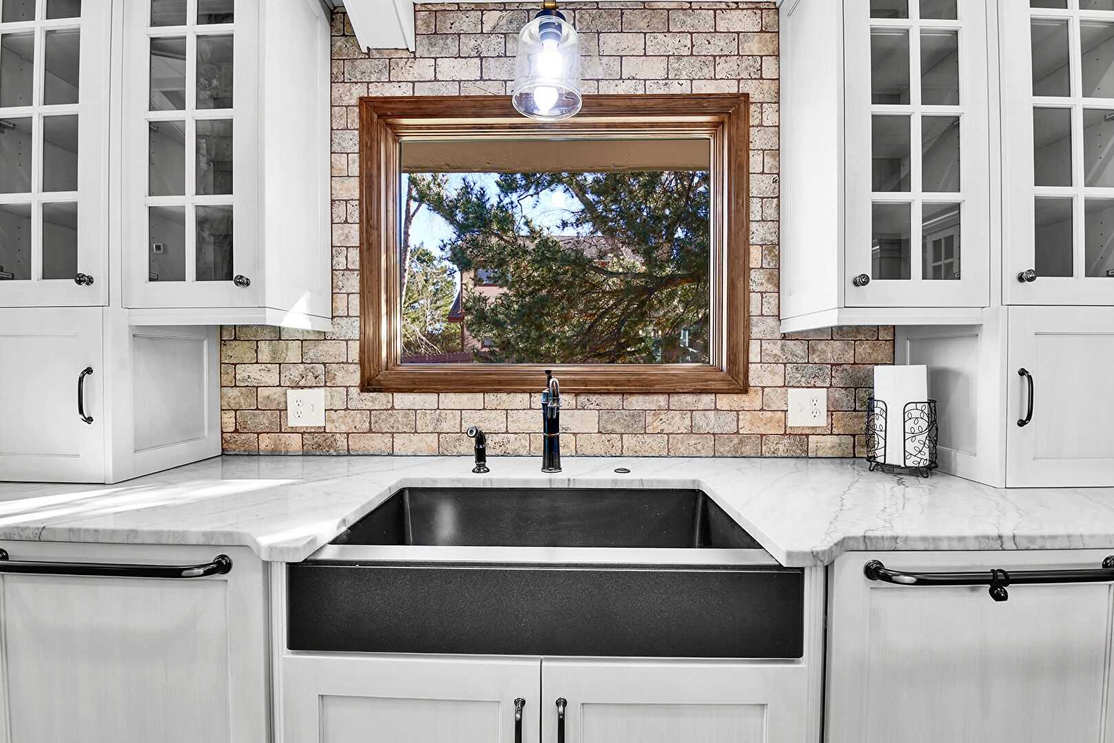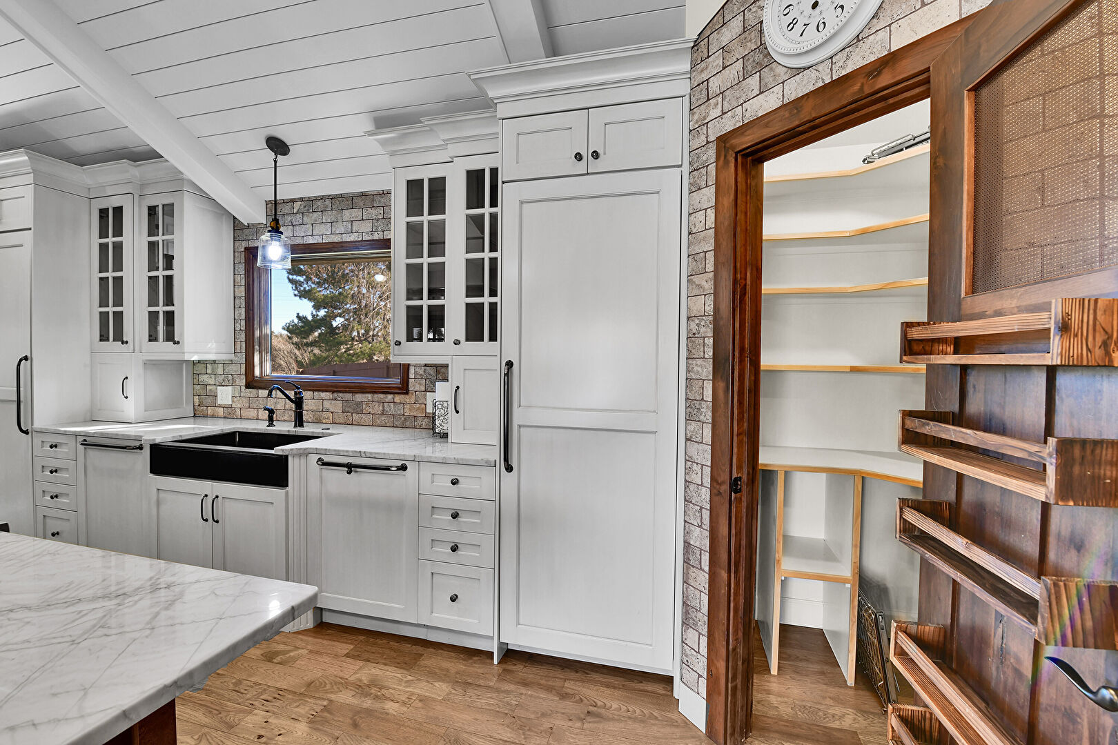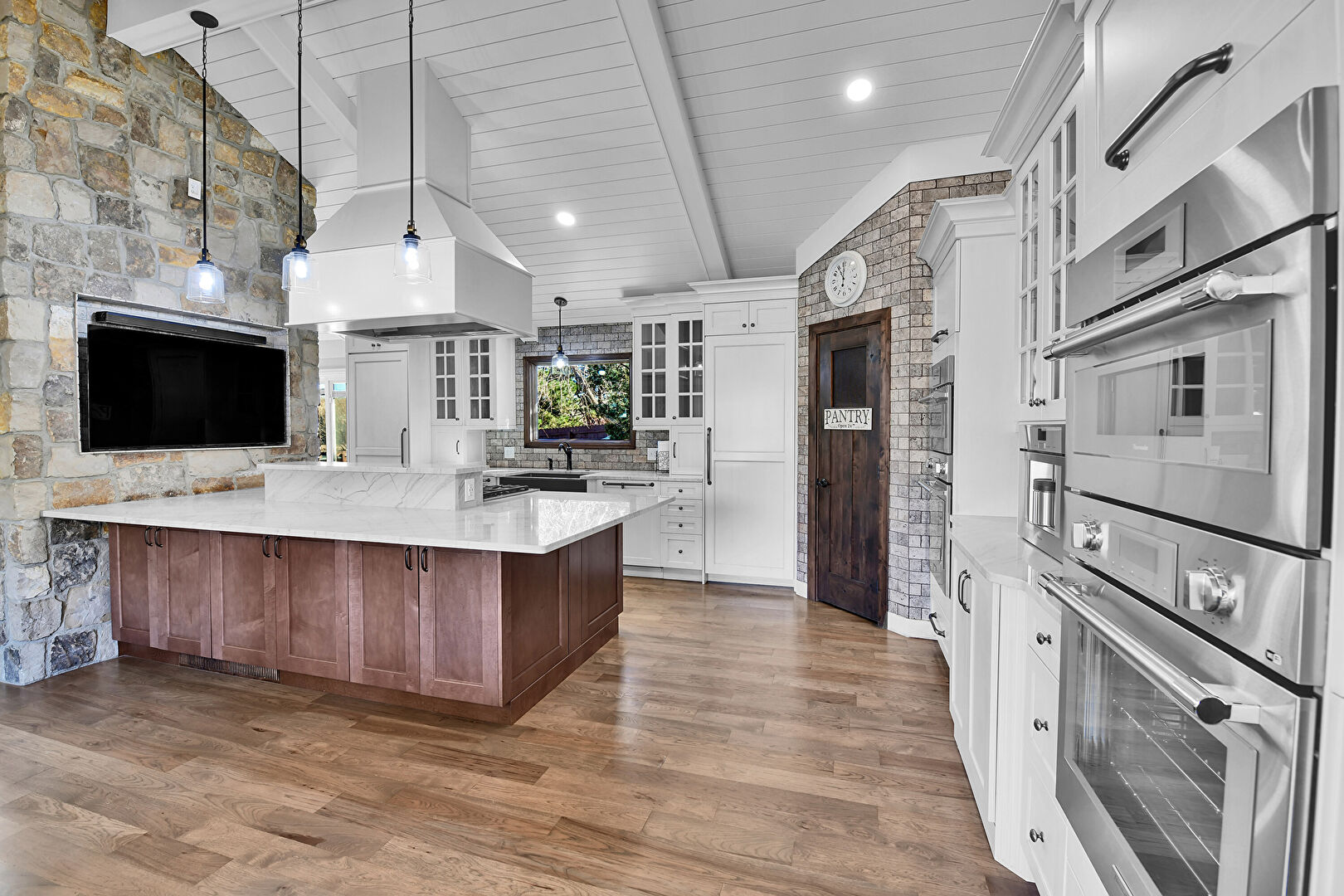 Baseboards Wall, Beamed Ceiling, Brick Wall, Cathedral Ceiling, Crown Molding Cabinets, Dark Brown Cabinets, Double Oven, Drywall, Glass Insert Cabinets, High Ceiling, Kitchen Bar, Kitchen Island, Kitchen Peninsula, Medium Brown Cabinets, Natural Light, Notable Chandelier, Opens To Living Area, Pass Through Window, Pendant Lighting, Recessed Lighting, Shaker Cabinets, Stone Countertops, Stone Wall, Tile Countertops, Vaulted Ceiling, Wood Ceiling, Wood Finish Floor, Beamed Ceiling, Drywall, Kitchen Bar, Shaker Cabinets, Vaulted Ceiling, Wood Ceiling, Wood Finish Floor