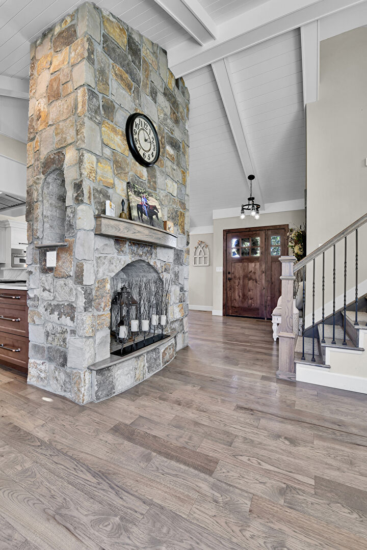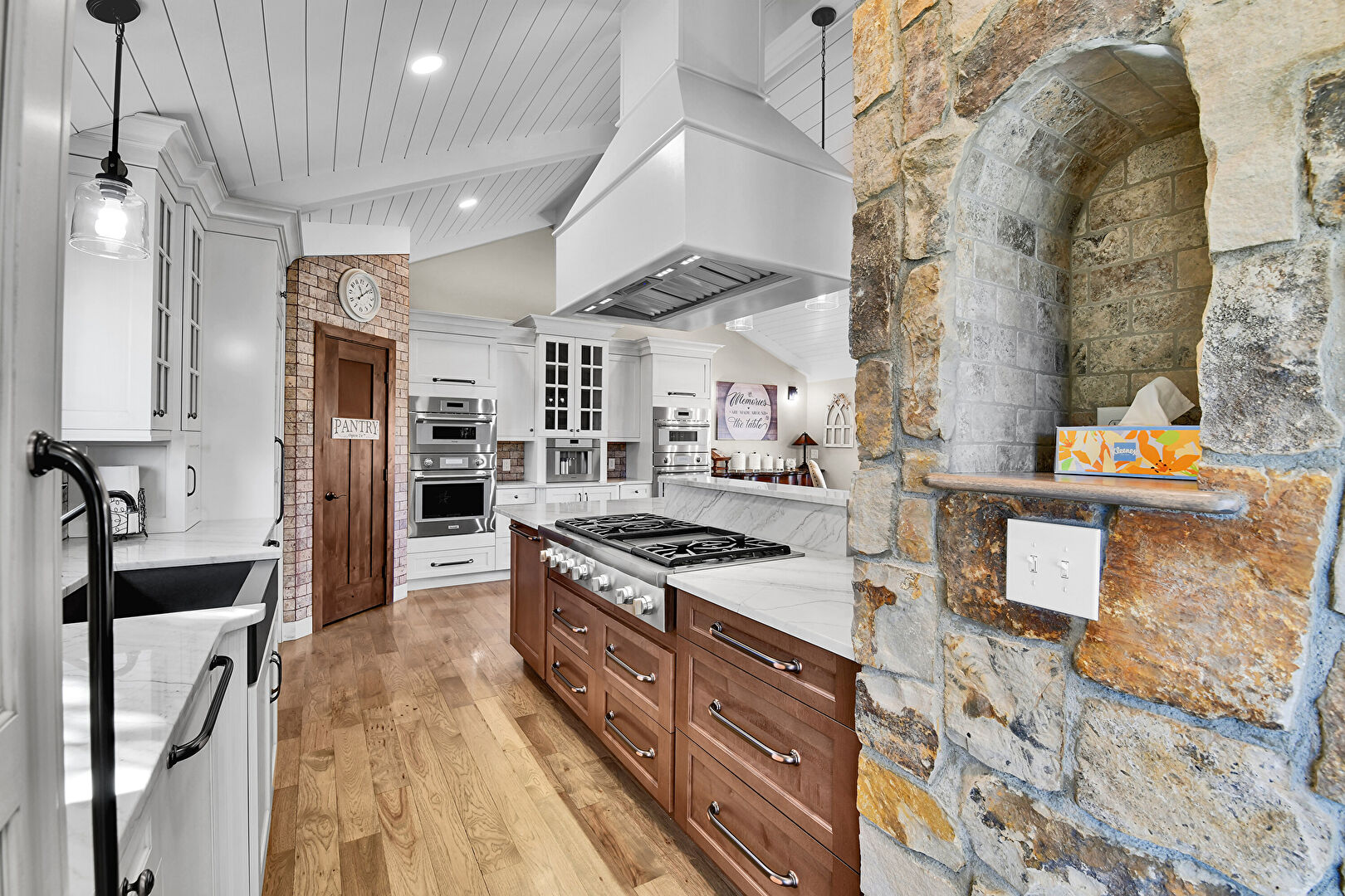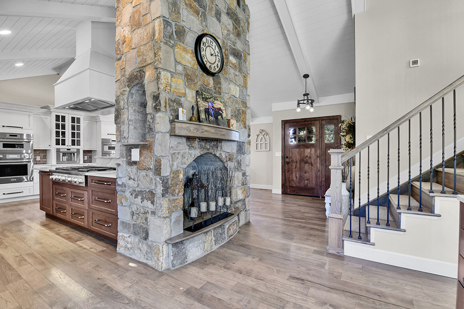 Beamed Ceiling, Cathedral Ceiling, Crown Molding Cabinets, Double Oven, Drywall, Fireplace, Glass Insert Cabinets, Kitchen Peninsula, Medium Brown Cabinets, Natural Light, Notable Chandelier, Opens To Living Area, Pendant Lighting, Recessed Lighting, Shaker Cabinets, Stairs, Stone Countertops, Stone Wall, Vaulted Ceiling, Vent, Wood Ceiling, Wood Finish Floor, Baseboards Wall, High Ceiling