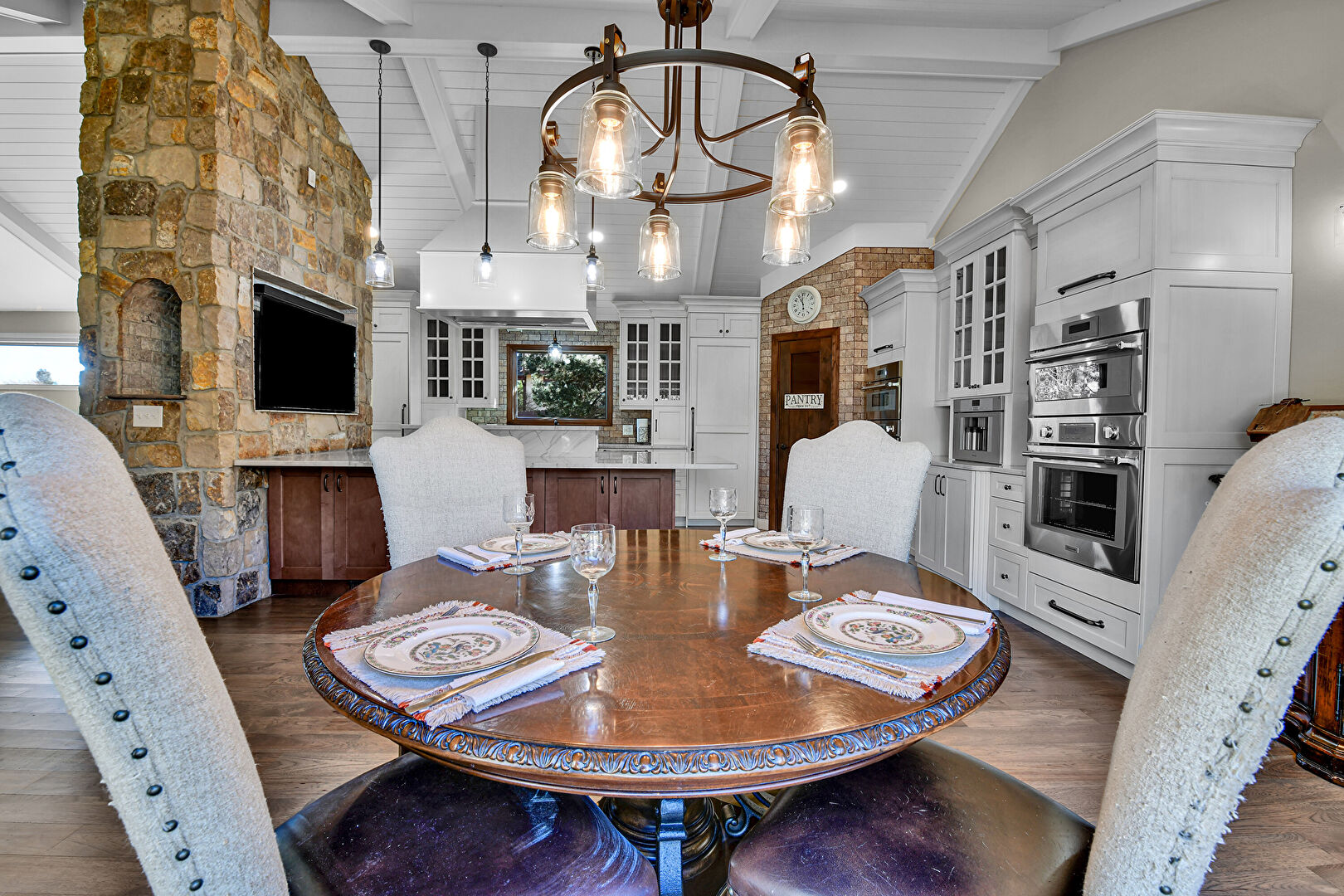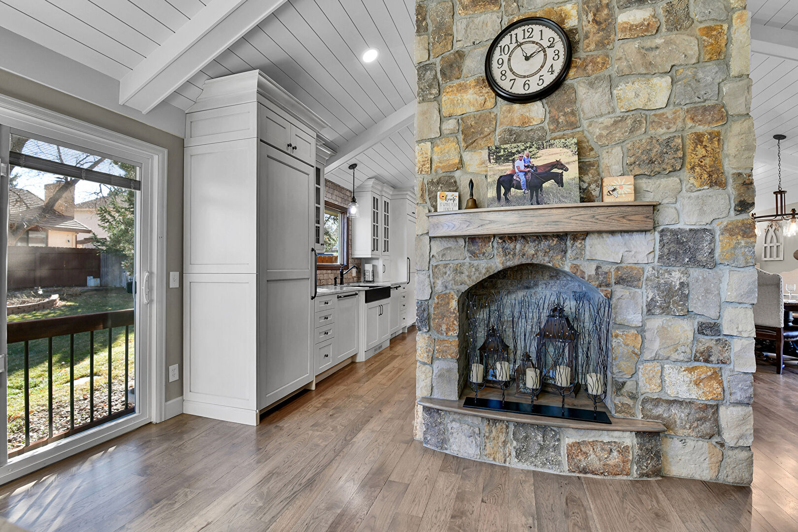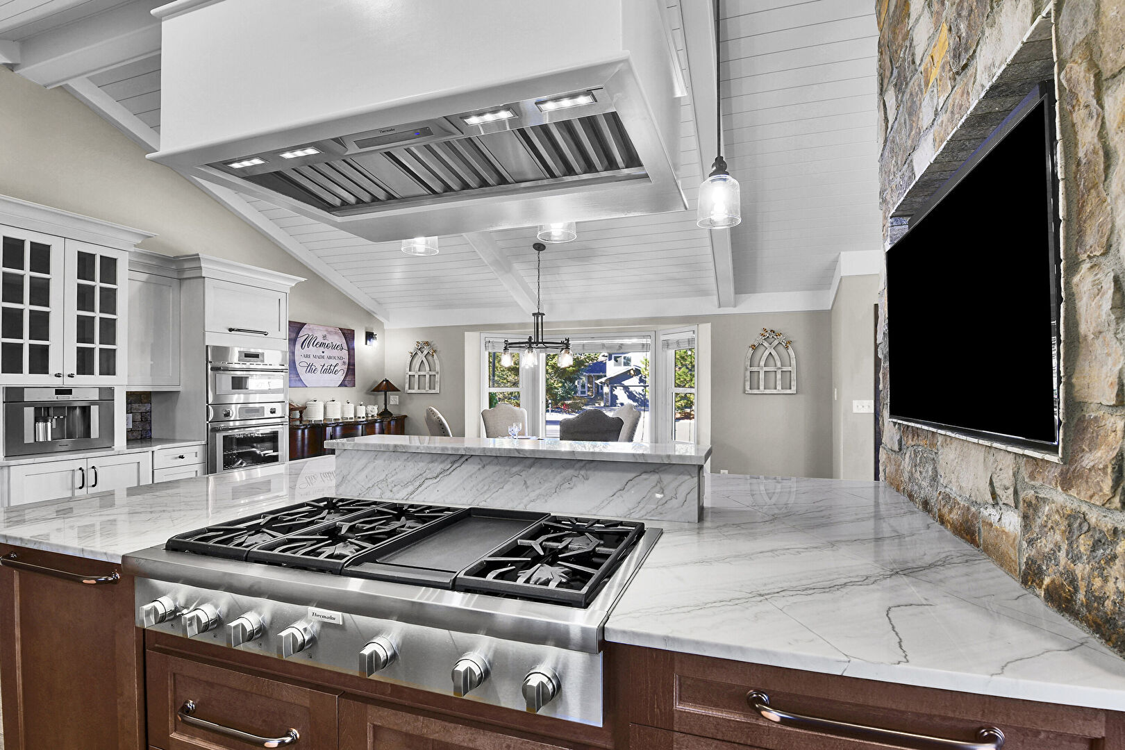 Beamed Ceiling, Cathedral Ceiling, Crown Molding Cabinets, Double Oven, Drywall, Fireplace, Glass Insert Cabinets, Kitchen Peninsula, Medium Brown Cabinets, Natural Light, Notable Chandelier, Opens To Living Area, Pendant Lighting, Recessed Lighting, Shaker Cabinets, Stairs, Stone Countertops, Stone Wall, Vaulted Ceiling, Vent, Wood Ceiling, Wood Finish Floor, Baseboards Wall, High Ceiling