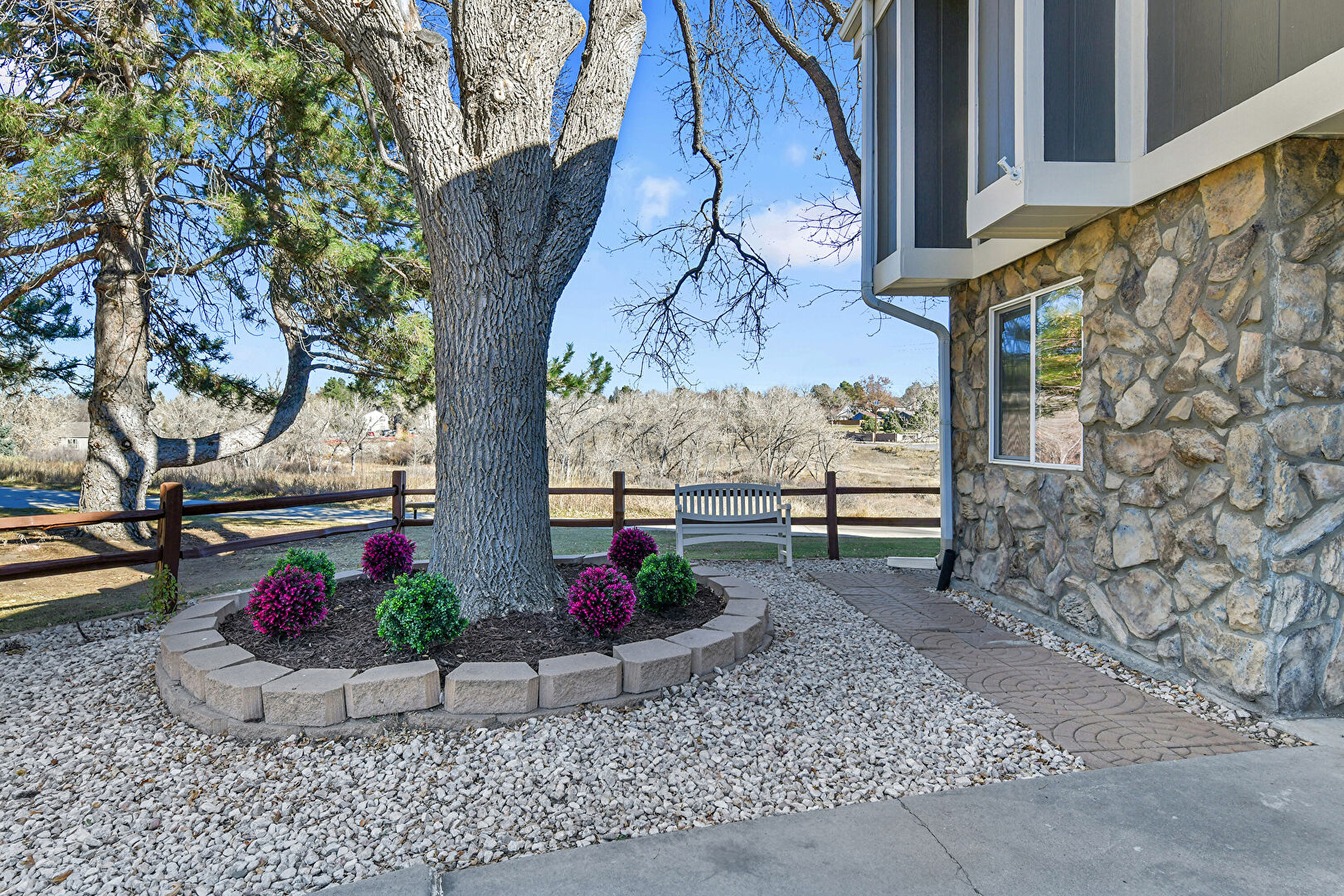 Concrete Foundation, Downspout, Fence, Gutters, Horizontal Siding, Lawn, Stone Siding, Vertical Siding, Stoop
