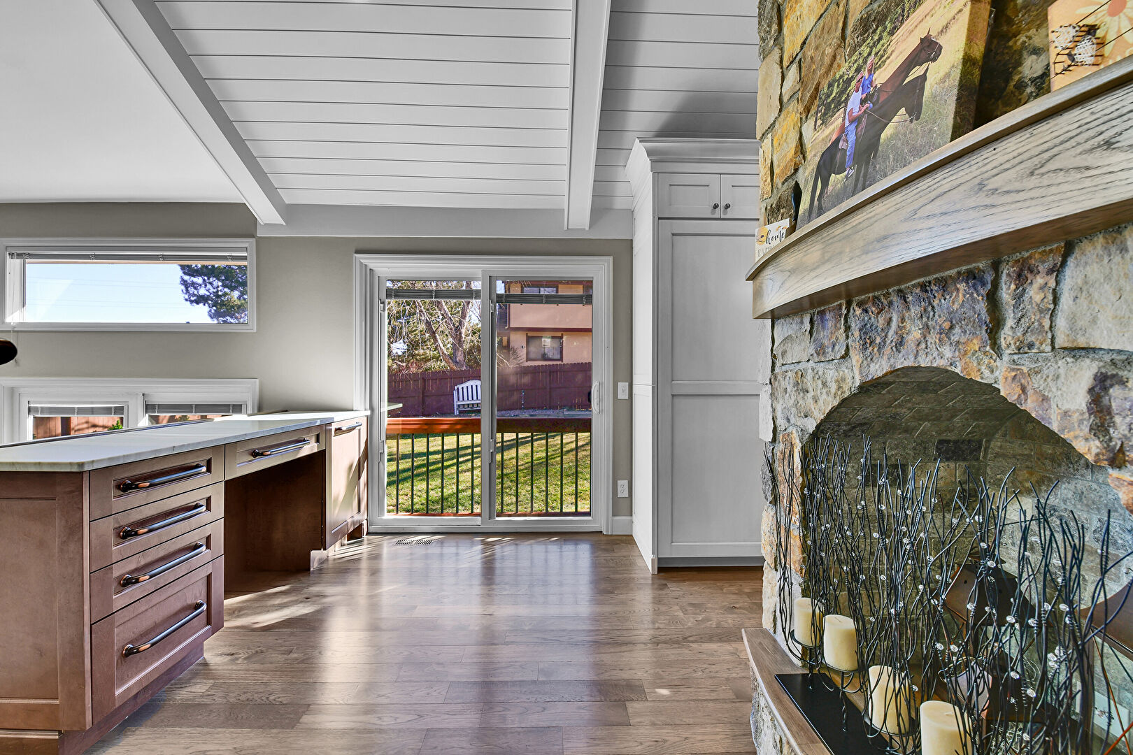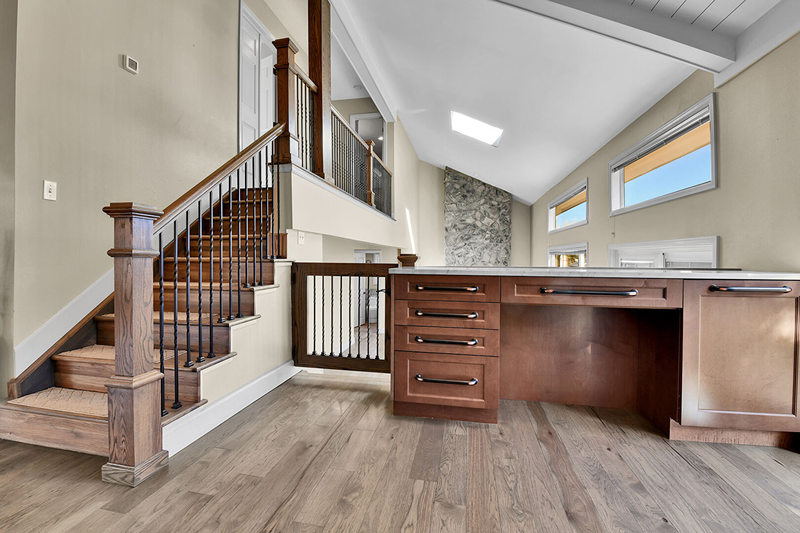 Baseboards Wall, Beamed Ceiling, Double Oven, Drywall, Fireplace, High Ceiling, Natural Light, Stairs, Vaulted Ceiling, Vent, Wood Ceiling, Wood Finish Floor, Beamed Ceiling, Drywall, High Ceiling, Office Area, Vaulted Ceiling