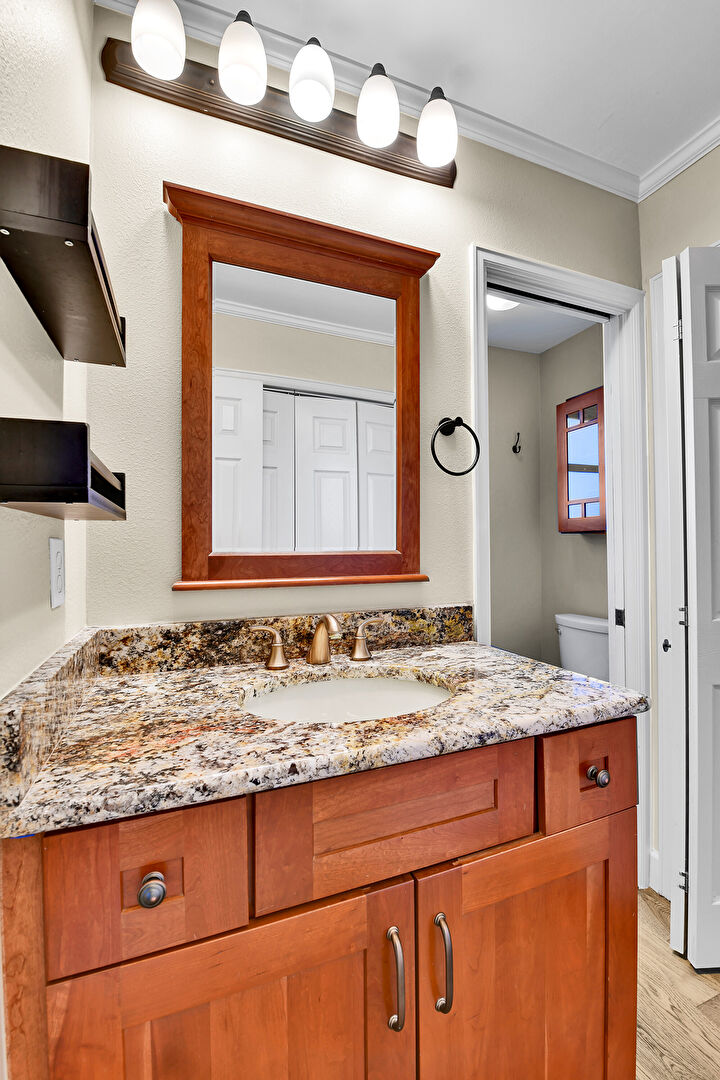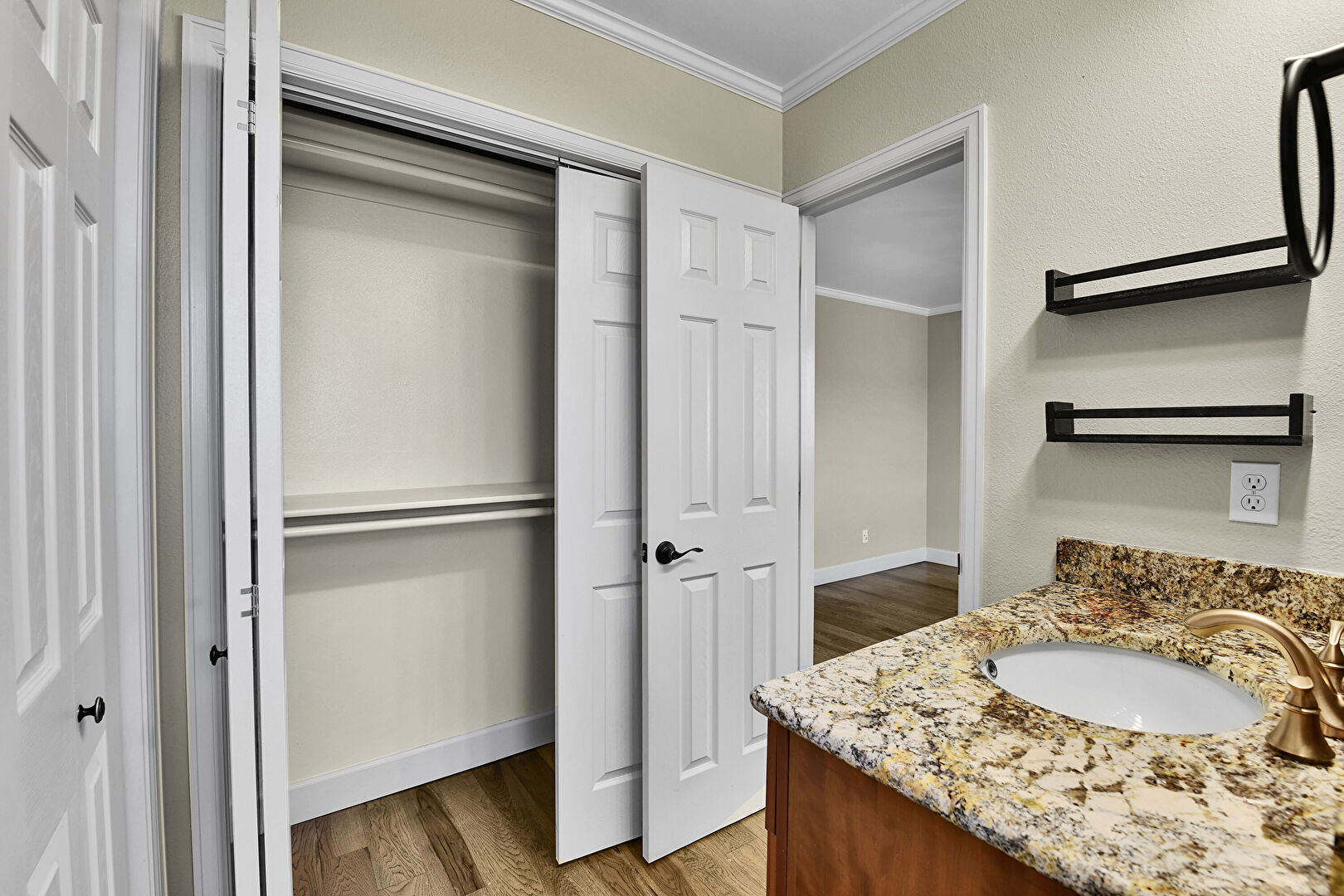 Baseboards Wall, Closet, Crown Molding, Drywall, Full Bathroom, Half Bathroom, Natural Light, Textured Wall, Vanity, Wood Finish Floor, Crown Molding, Drywall, Vanity