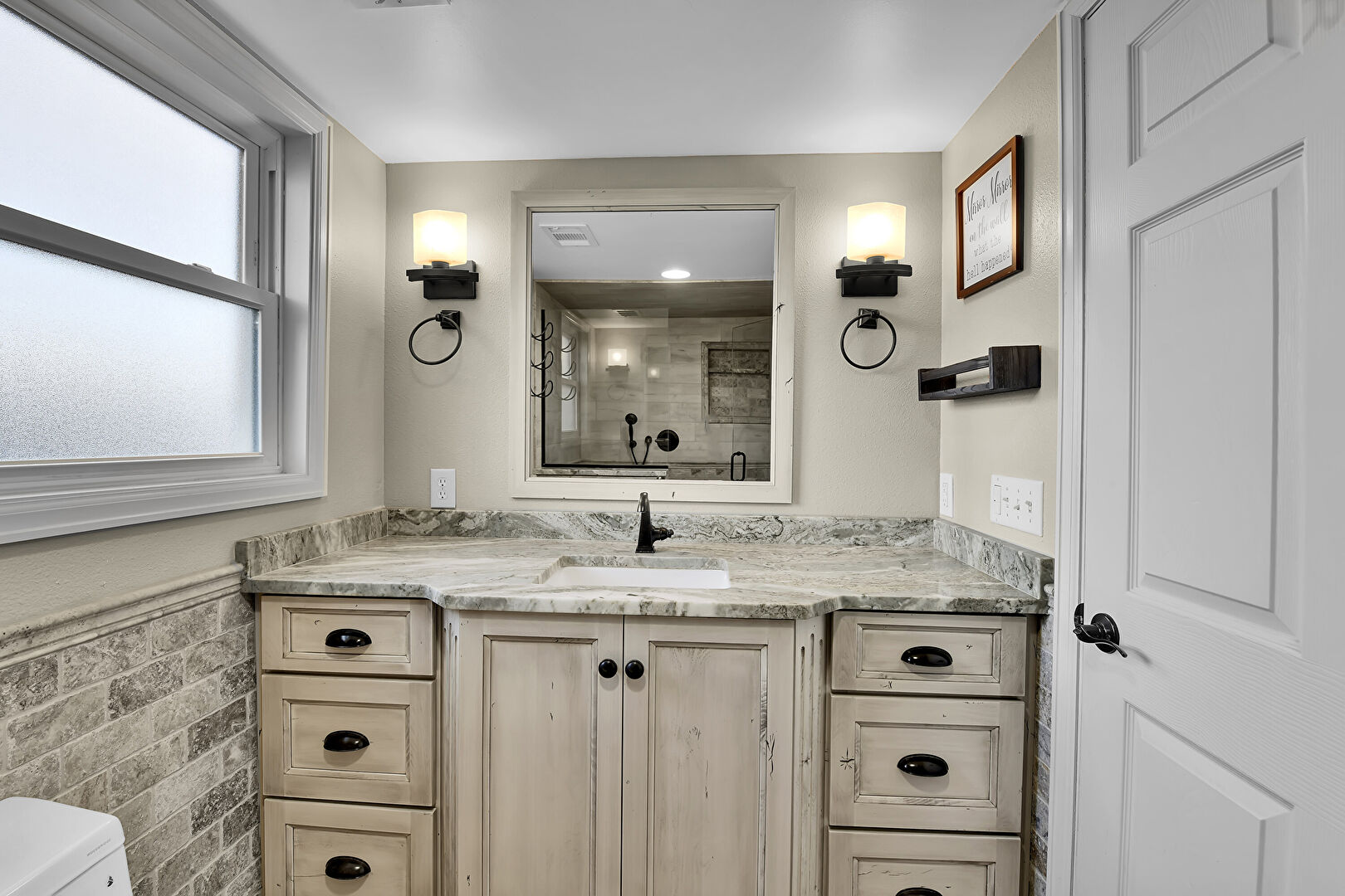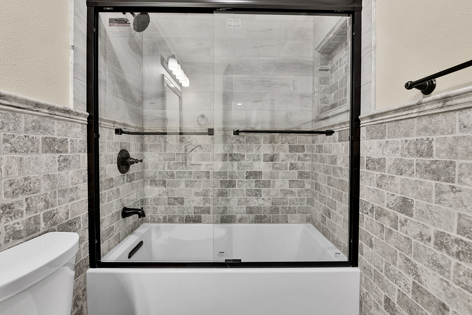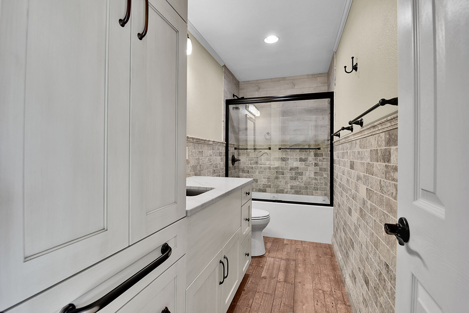 Brick Wall, Combined Bath Shower, Crown Molding, Drywall, Full Bathroom, Half Bathroom, Recessed Lighting, Tile Wall, Vanity, Vent, Wainscot Wall, Wood Finish Floor, Combined Bath Shower, Full Bathroom, Natural Light, Textured Wall, Tile Wall