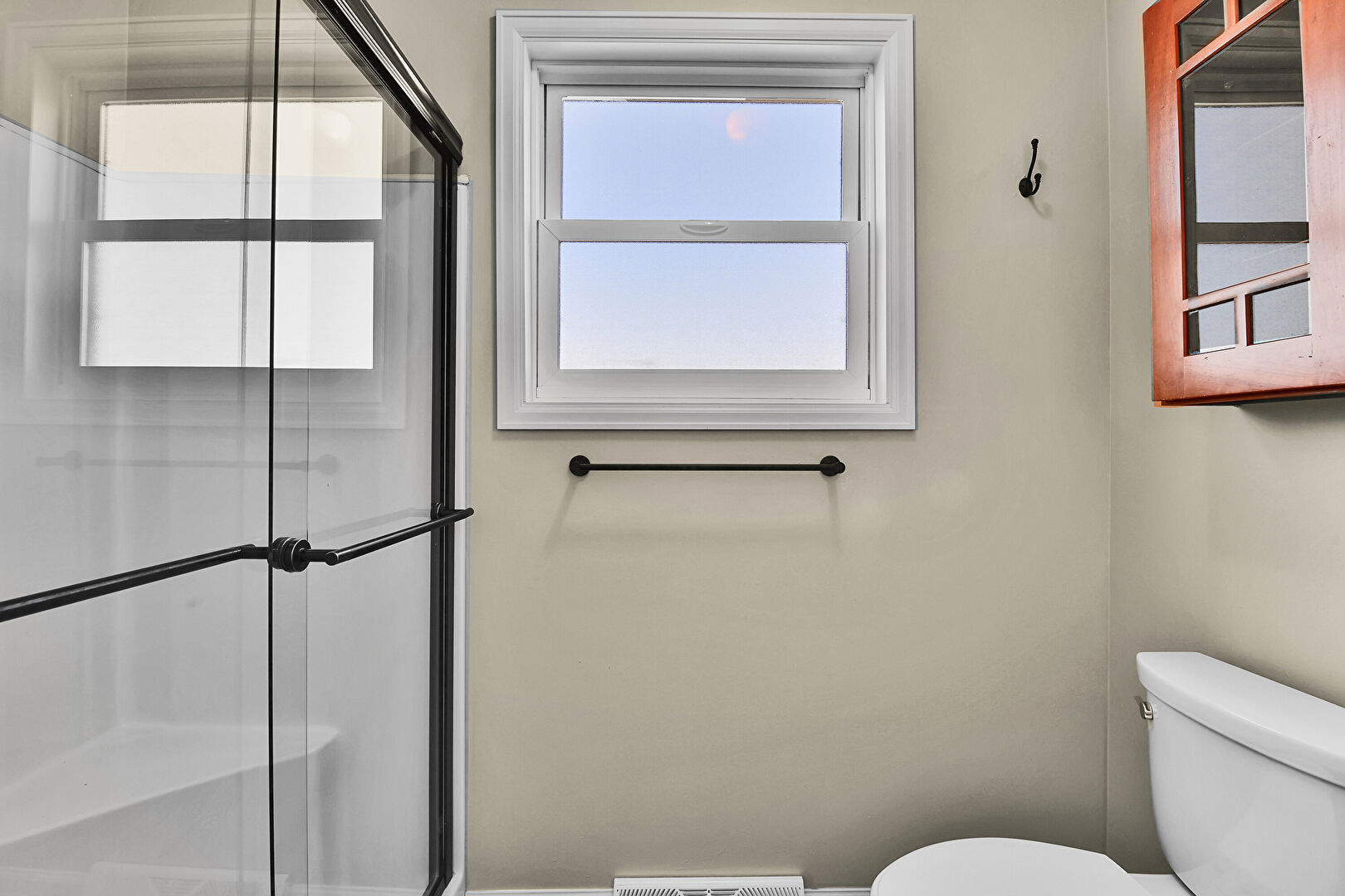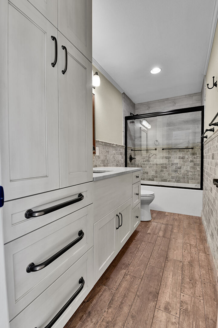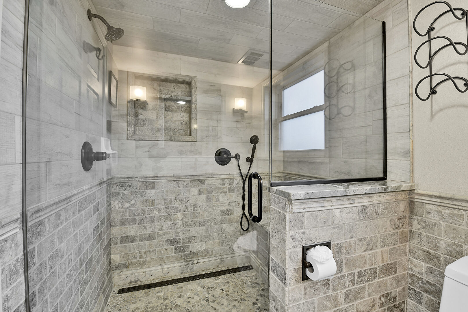 Brick Wall, Combined Bath Shower, Crown Molding, Drywall, Full Bathroom, Half Bathroom, Recessed Lighting, Tile Wall, Vanity, Vent, Wainscot Wall, Wood Finish Floor, Combined Bath Shower, Full Bathroom, Natural Light, Textured Wall, Tile Wall
