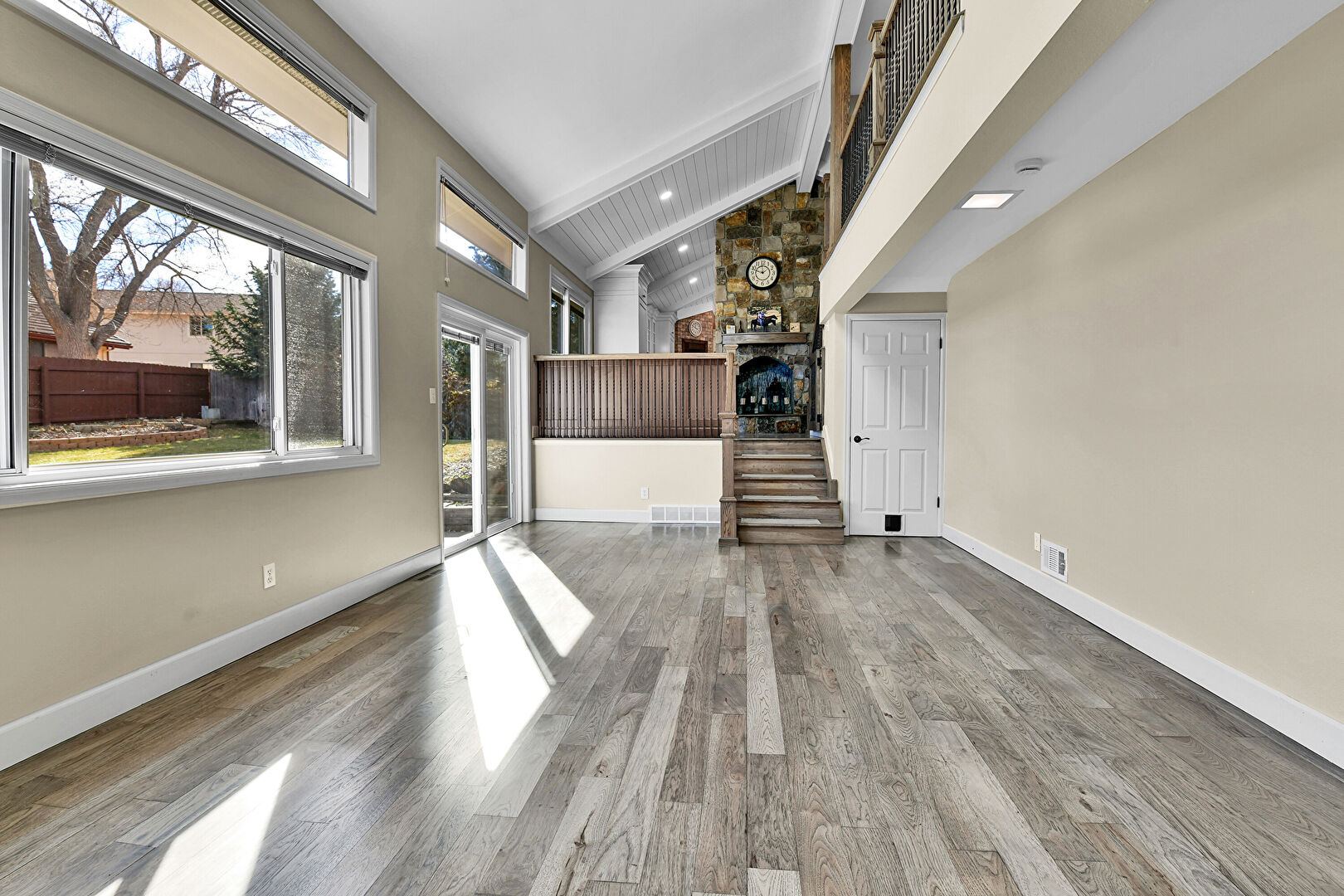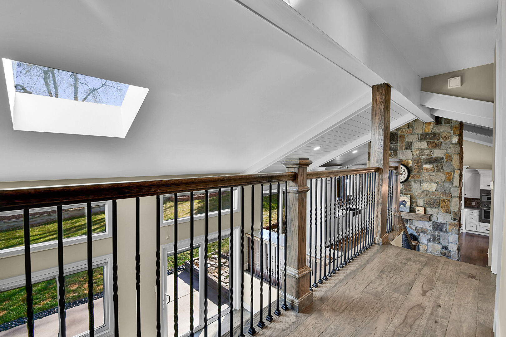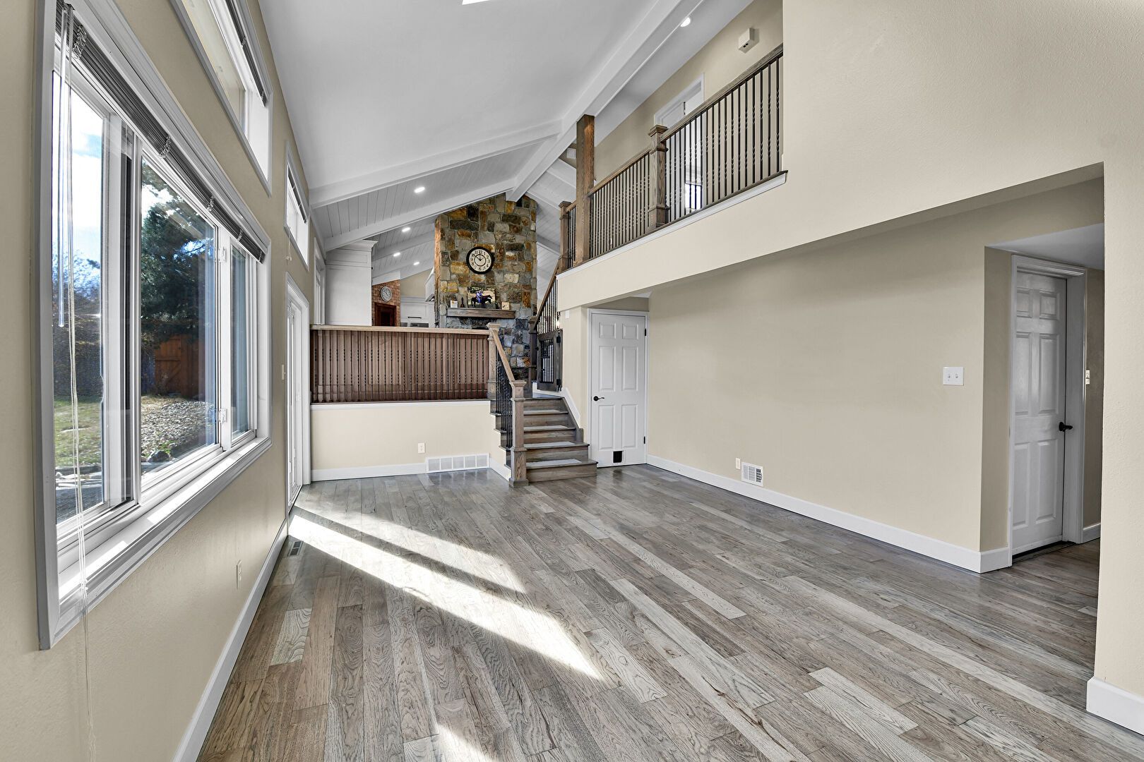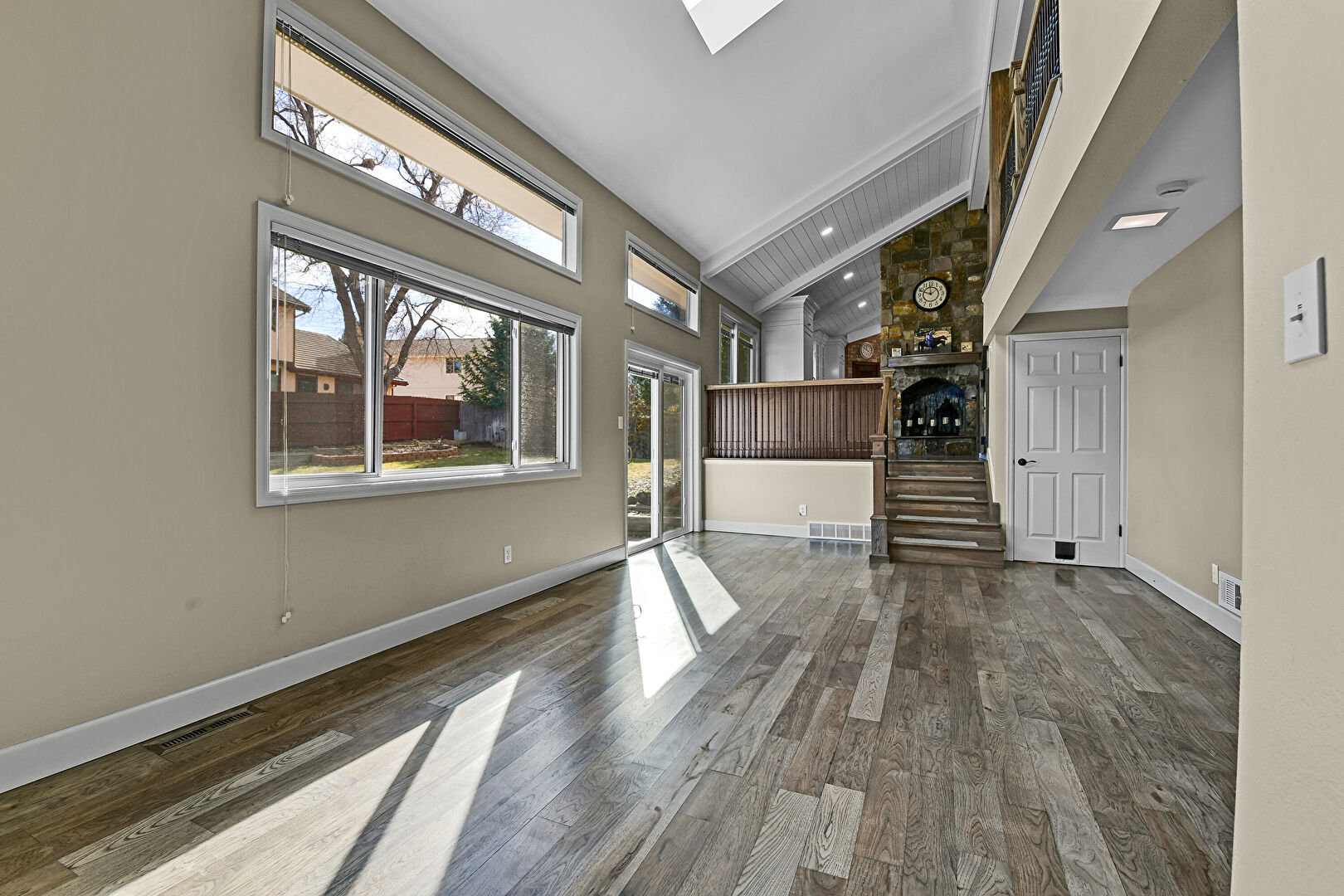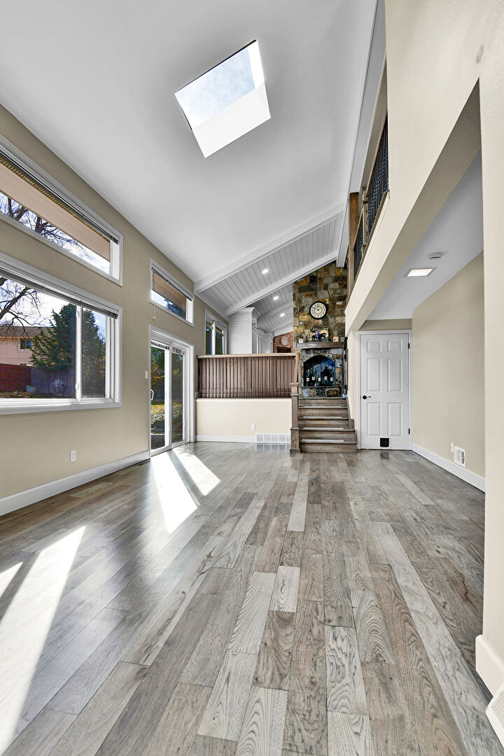Baseboards Wall, Beamed Ceiling, Drywall, Fireplace, High Ceiling, Natural Light, Recessed Lighting, Skylight, Smoke Carbon Monoxide Detector, Stairs, Vaulted Ceiling, Vent, Wood Finish Floor, Baseboards Wall, Fireplace, High Ceiling, Natural Light, Stairs, Vaulted Ceiling, Vent, Wood Finish Floor