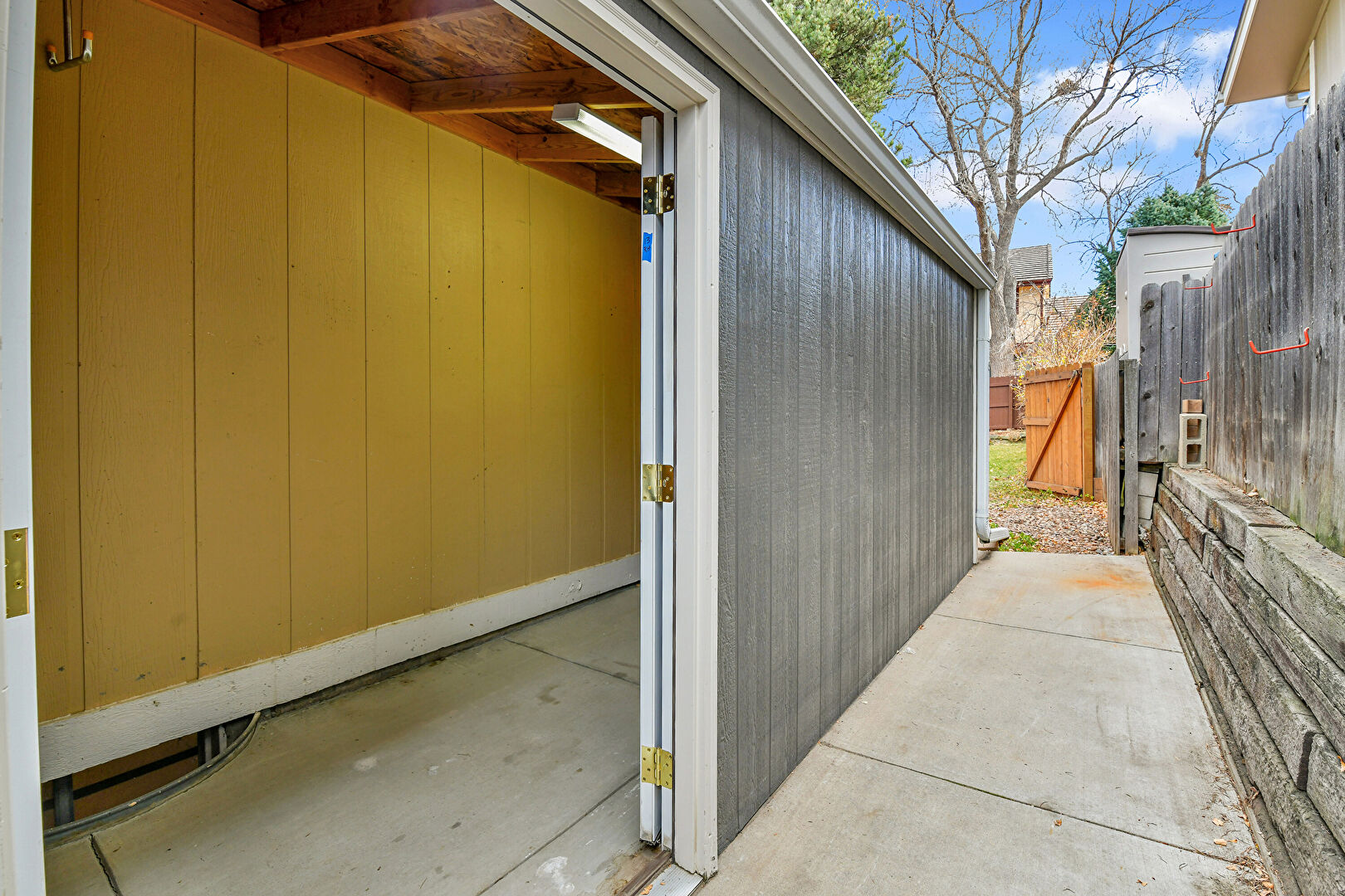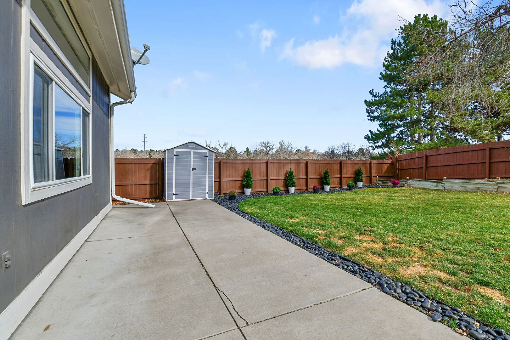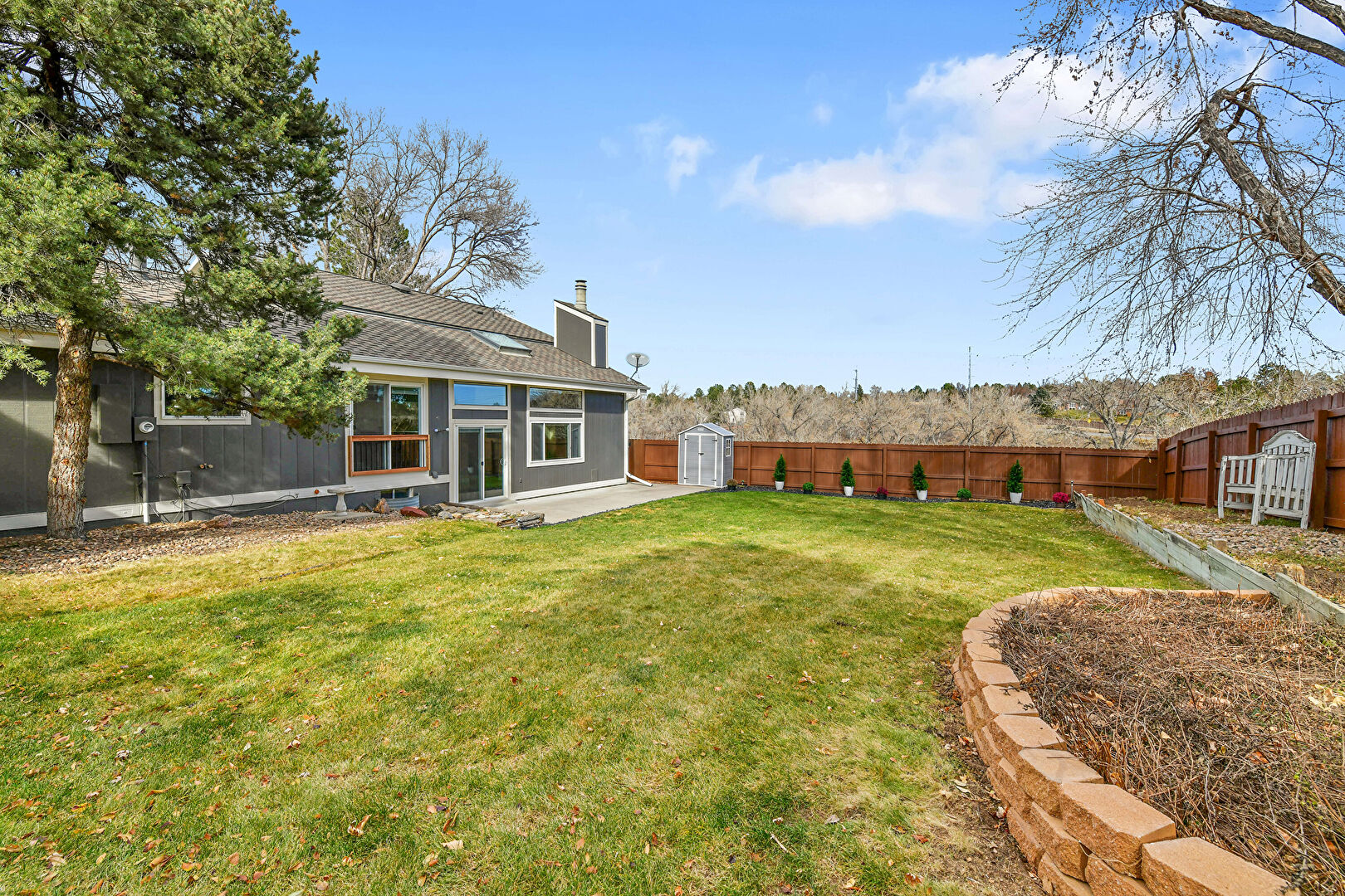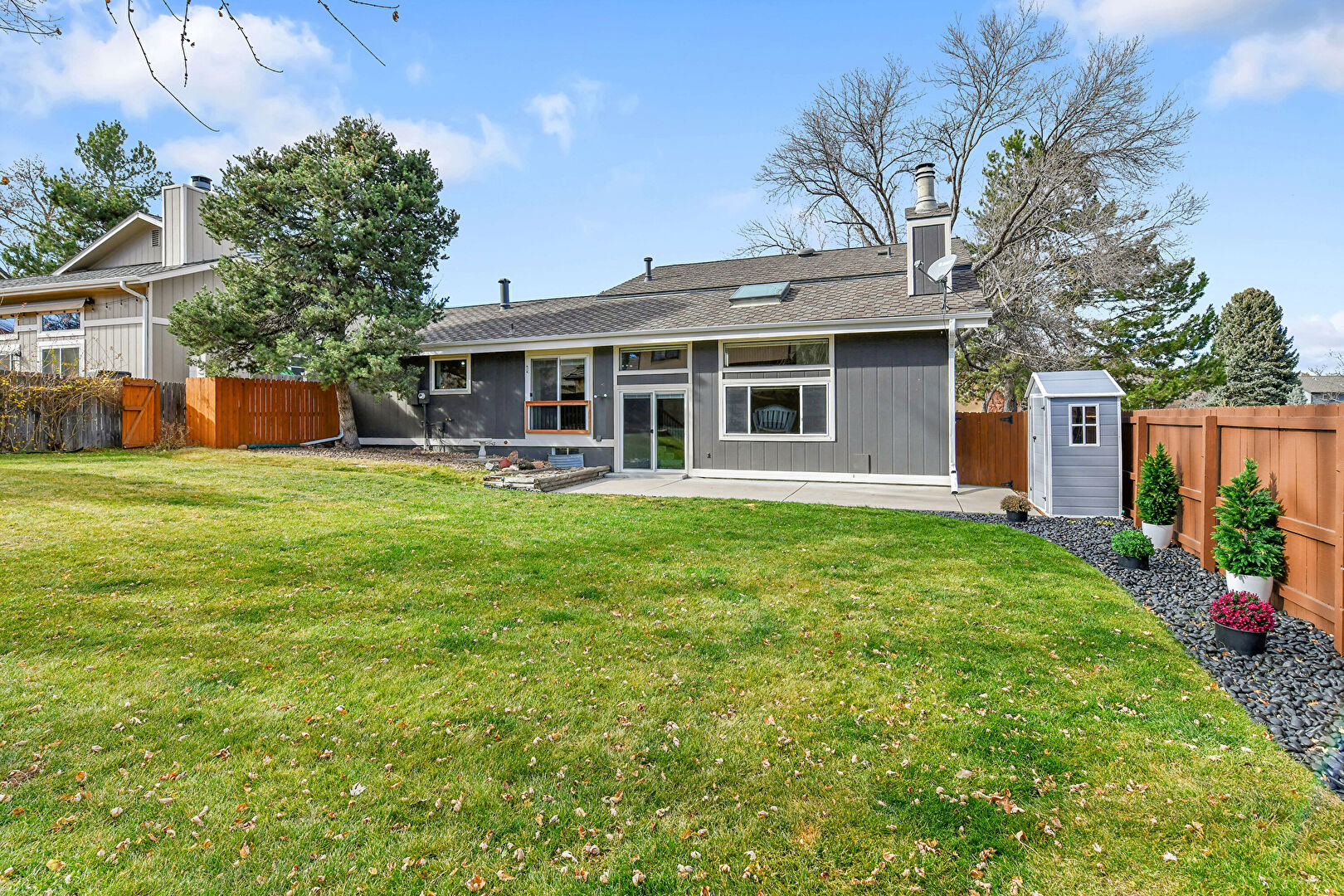 Chimney, Concrete Foundation, Downspout, Fence, Gutters, Lawn, Outdoor Structure, Patio, Satellite Dish, Shed, Shingle Roof, Vertical Siding