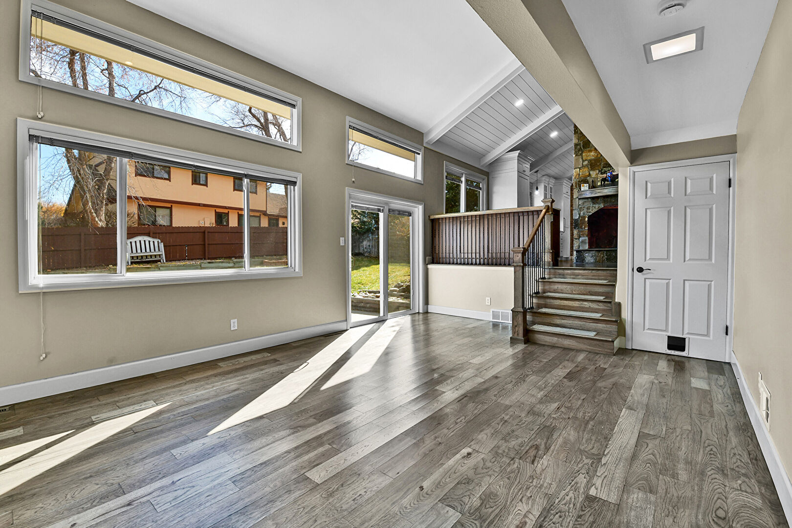 Baseboards Wall, Beamed Ceiling, Drywall, Fireplace, High Ceiling, Natural Light, Recessed Lighting, Smoke Carbon Monoxide Detector, Stairs, Vaulted Ceiling, Vent, Wood Finish Floor, Baseboards Wall, Fireplace, Wood Finish Floor
