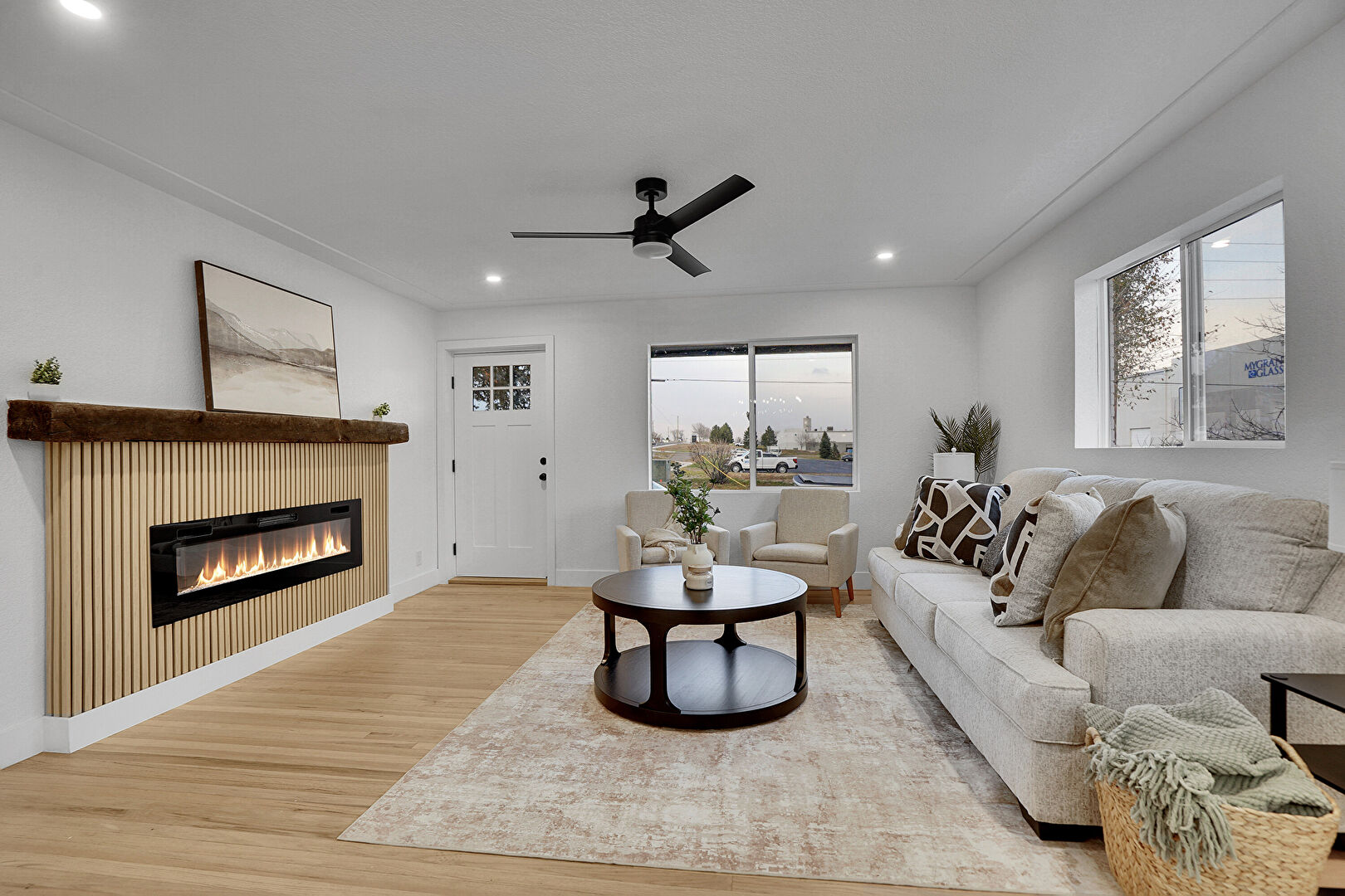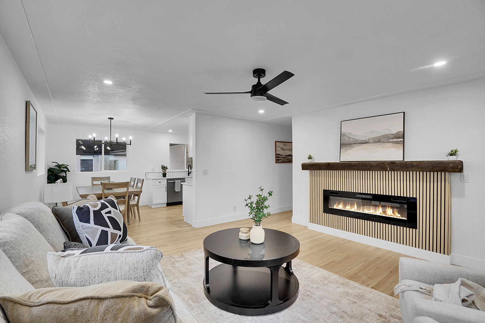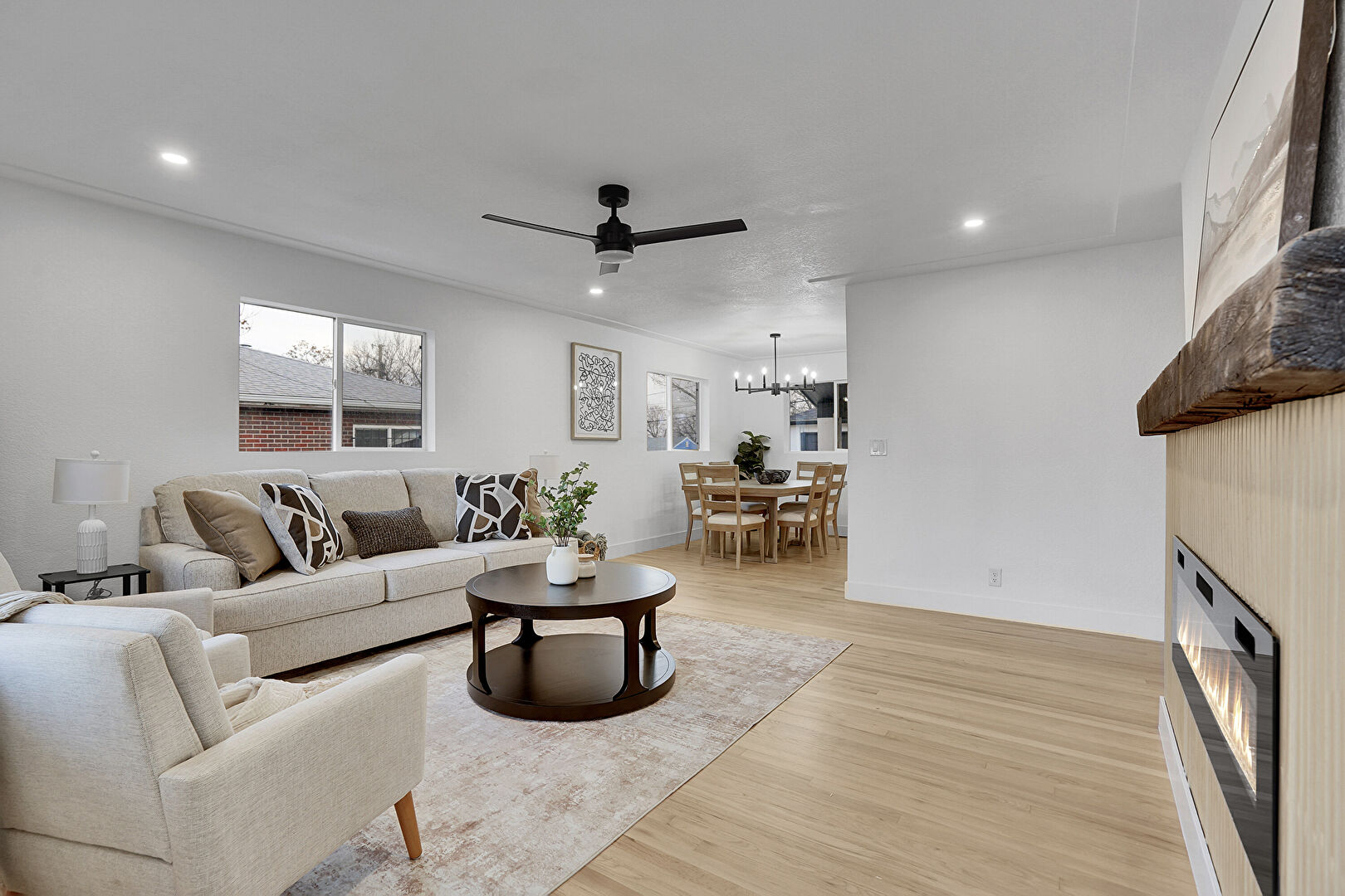 Baseboards Wall, Ceiling Fan, Drywall, Fireplace, Natural Light, Notable Chandelier, Recessed Lighting, Wood Finish Floor, Baseboards Wall, Natural Light, Recessed Lighting, Vent, Wood Finish Floor