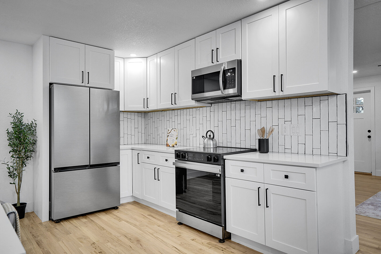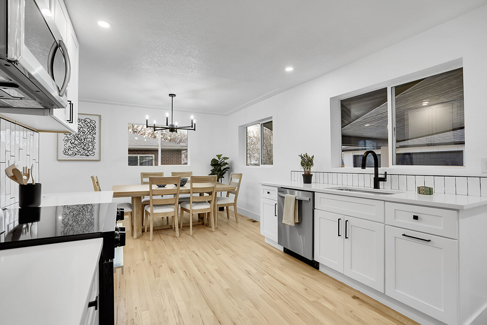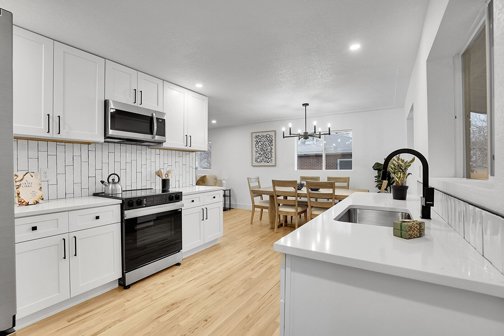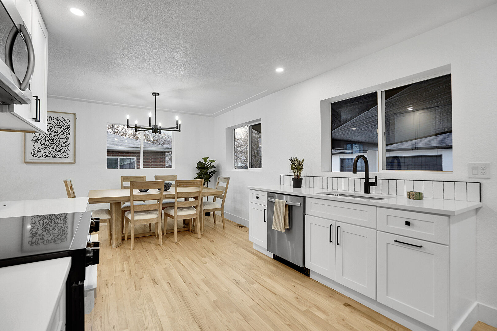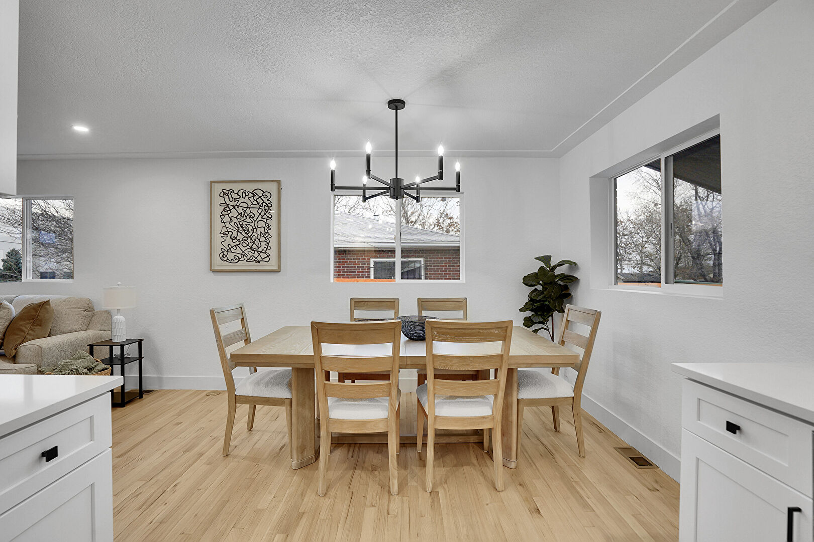Baseboards Wall, Crown Molding, Drywall, Natural Light, Notable Chandelier, Pendant Lighting, Recessed Lighting, Shaker Cabinets, Stone Countertops, Textured Ceiling, Wood Finish Floor, Baseboards Wall, Drywall, Natural Light, Pendant Lighting, Stone Countertops, U Shaped Kitchen