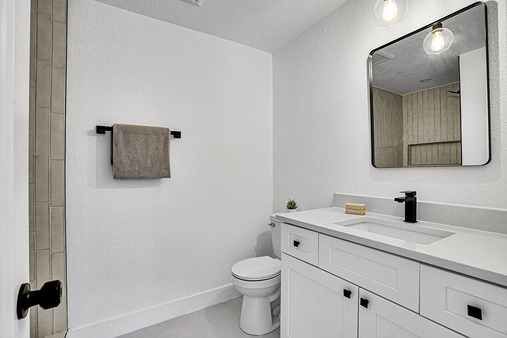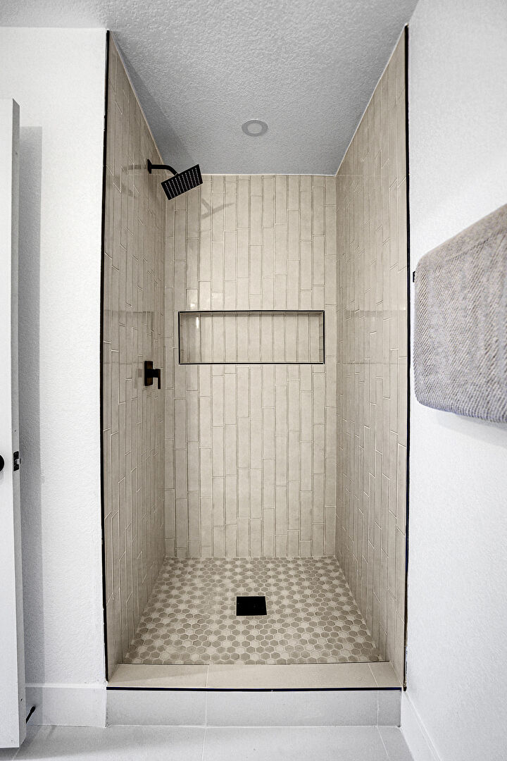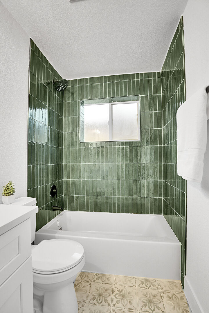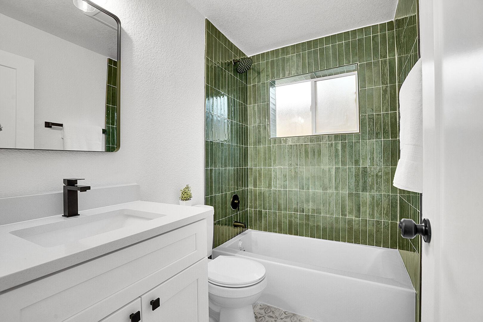 Baseboards Wall, Combined Bath Shower, Drywall, Full Bathroom, Natural Light, Textured Ceiling, Textured Wall, Tile Floor, Vanity, Vent, Vinyl Floor, Full Bathroom, Natural Light, Vanity