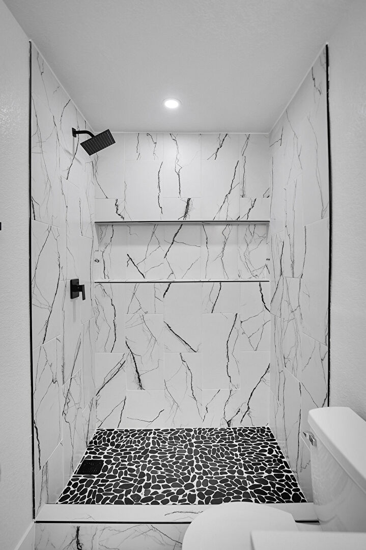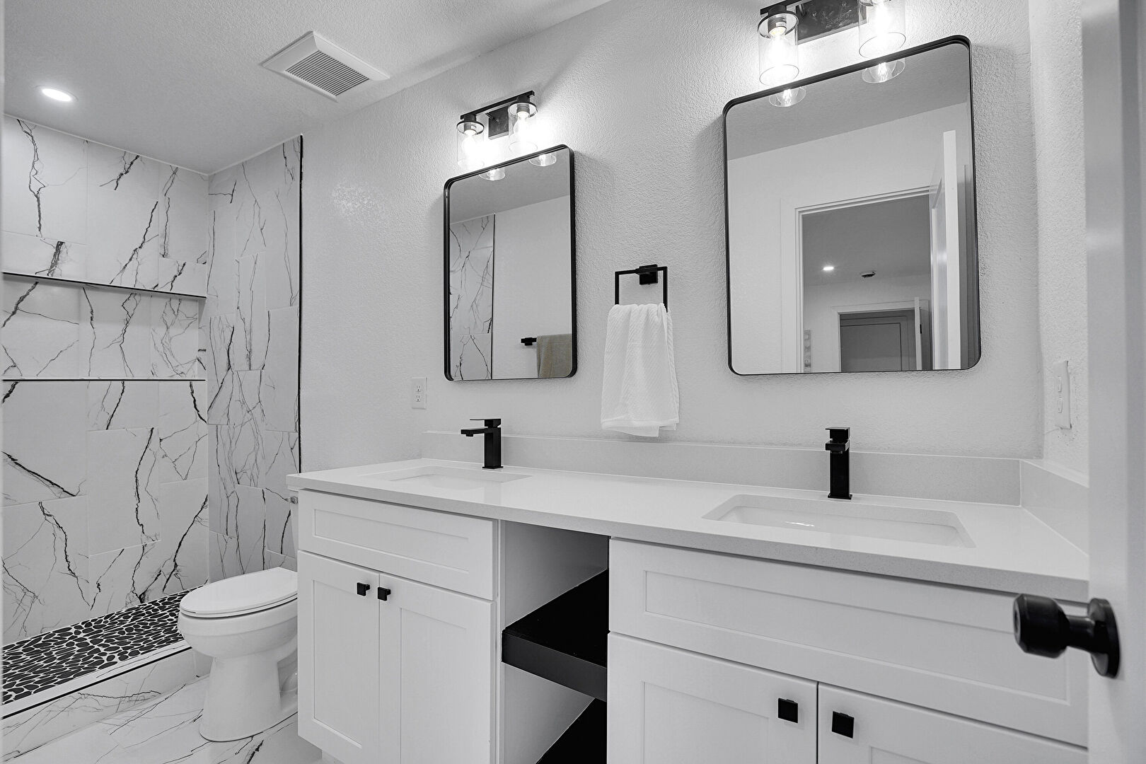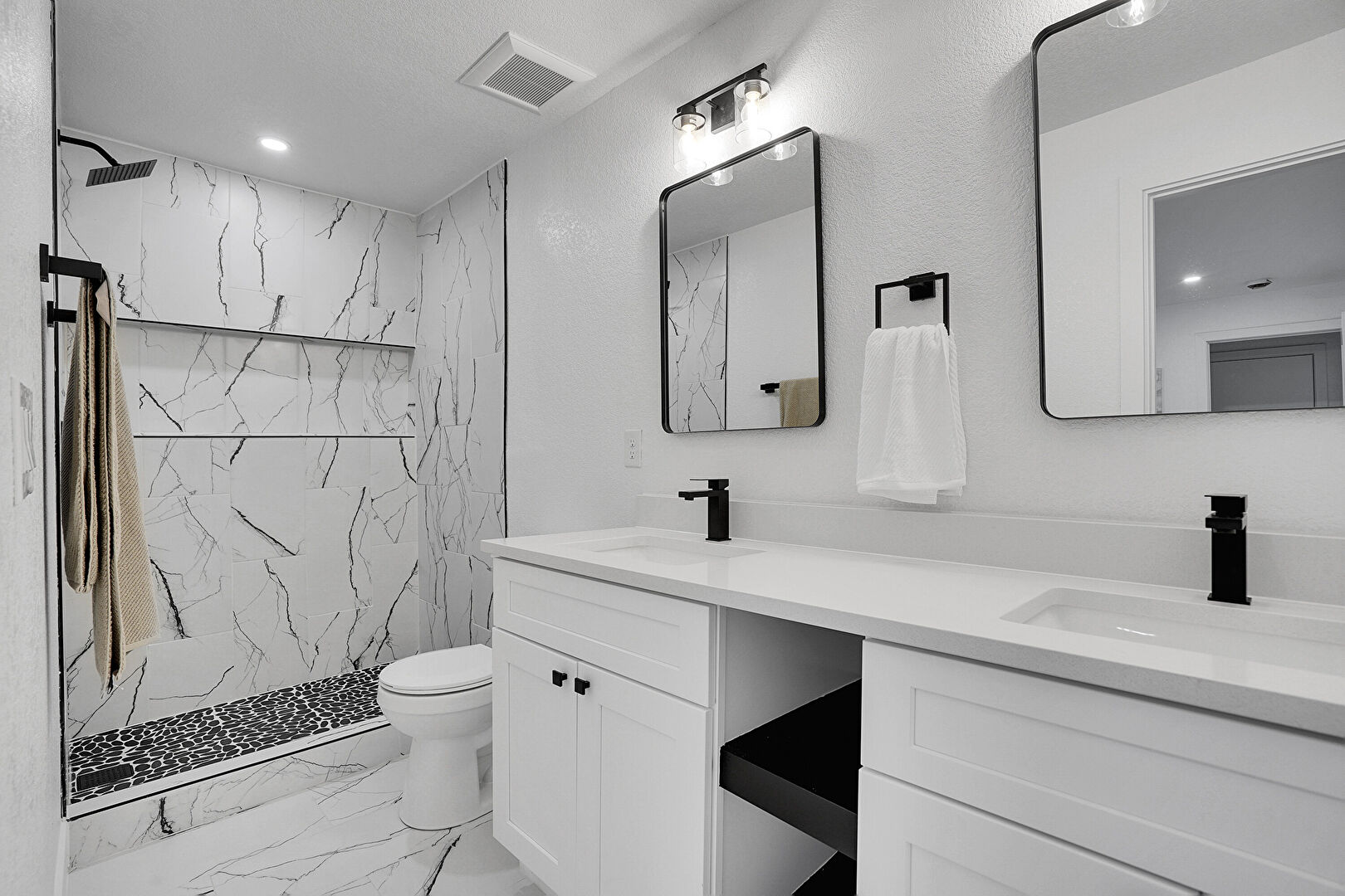 Double Vanity, Drywall, Full Bathroom, Marble Finish Floor, Recessed Lighting, Vent, Full Bathroom, Recessed Lighting