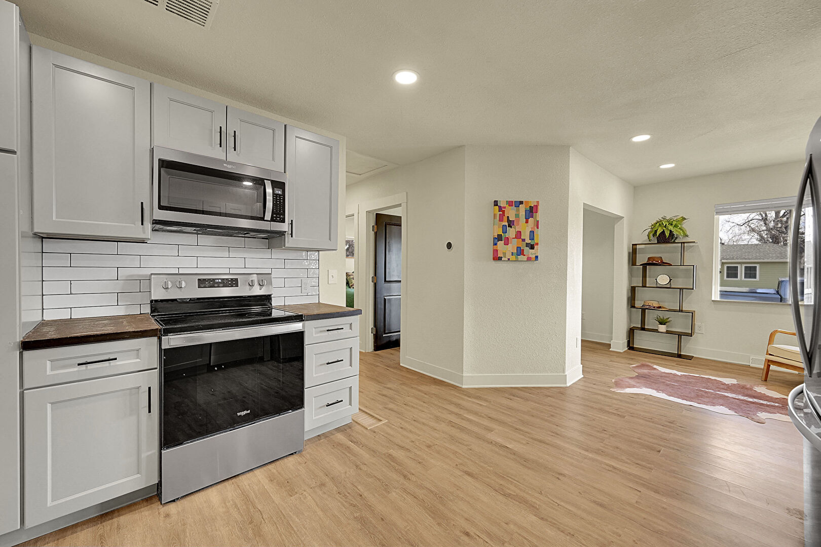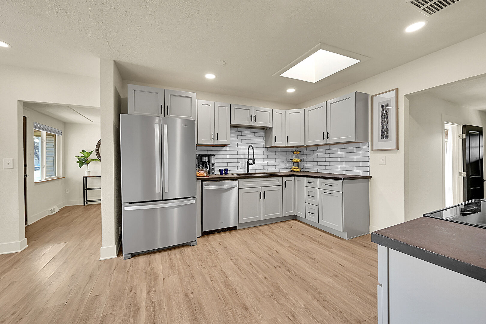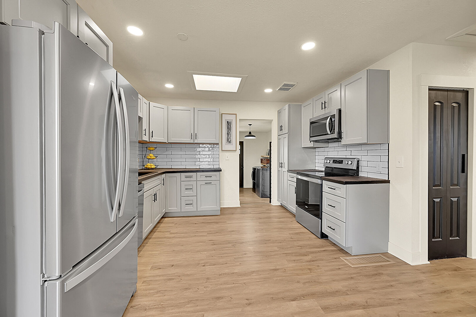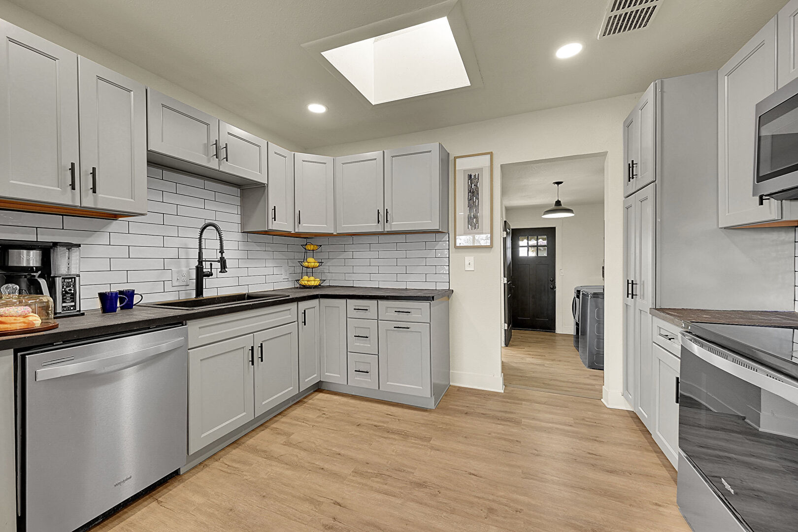 Baseboards Wall, Butcher Block Countertops, Drywall, Gray Cabinets, L Shaped Kitchen, Laundry, Natural Light, Pendant Lighting, Recessed Lighting, Shaker Cabinets, Skylight, U Shaped Kitchen, Vent, Wood Finish Floor, Baseboards Wall, Drywall, Skylight, U Shaped Kitchen, Wood Finish Floor