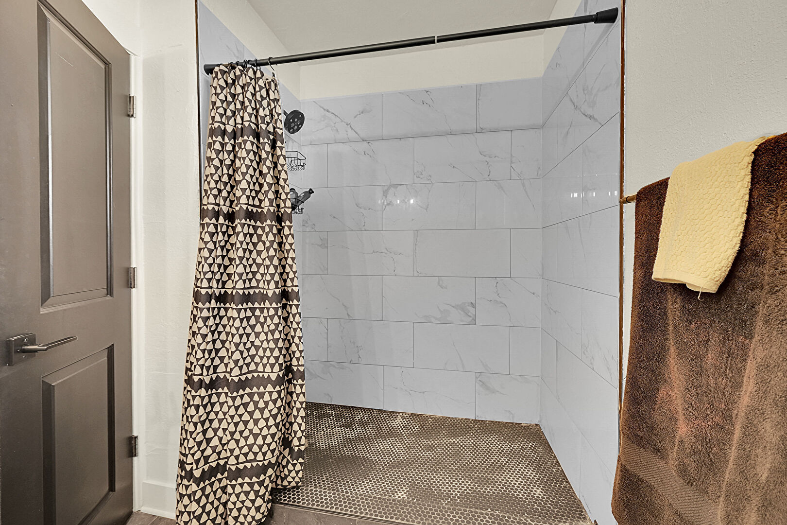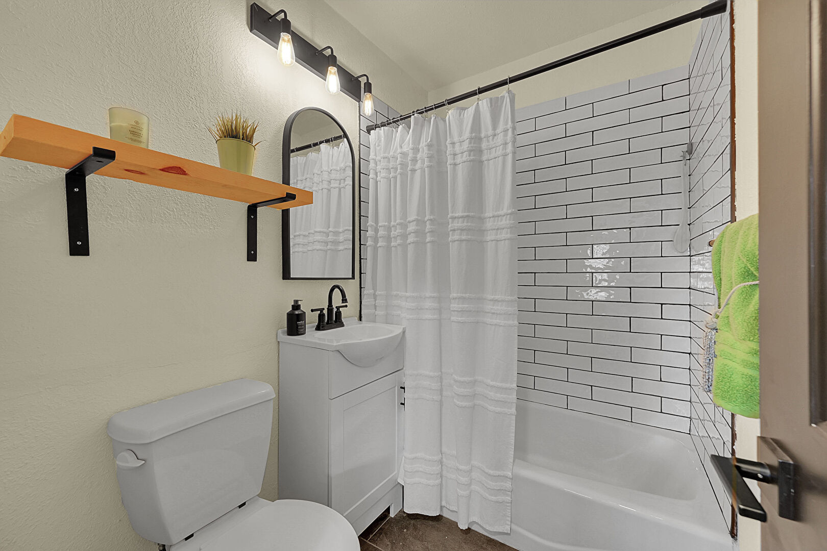 Baseboards Wall, Combined Bath Shower, Drywall, Full Bathroom, Natural Light, Tile Floor, Vanity, Full Bathroom, Textured Wall, Vent