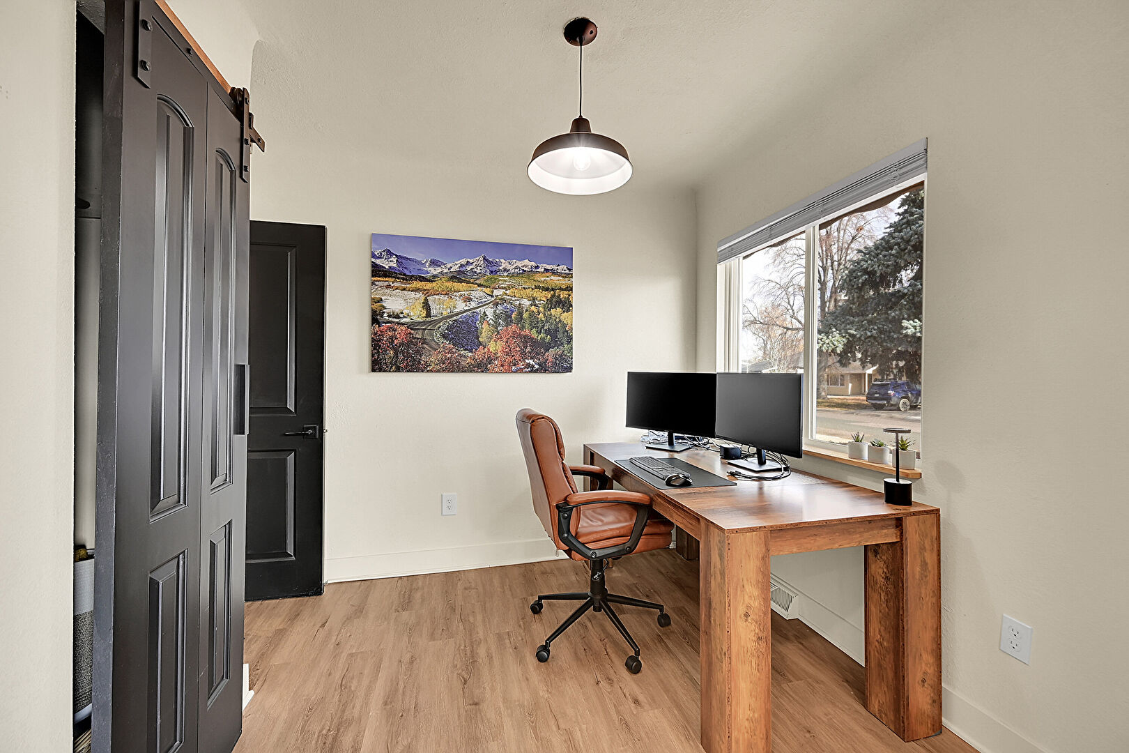 Barn Door, Drywall, Natural Light, Office Area, Wood Finish Floor, Baseboards Wall