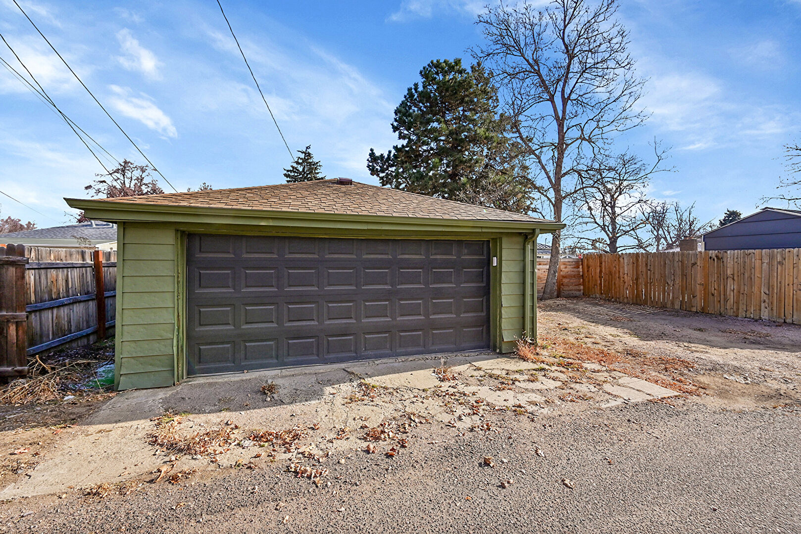Detached Garage, Downspout, Fence, Gutters, Horizontal Siding, Outdoor Structure, Shingle Roof, Gate
