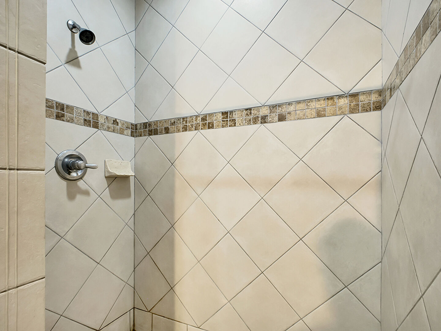 Double Vanity, Drywall, Full Bathroom, Recessed Lighting, Tile Floor, Tile Wall, Vent, Wainscot Wall, Half Bathroom, Tile Floor