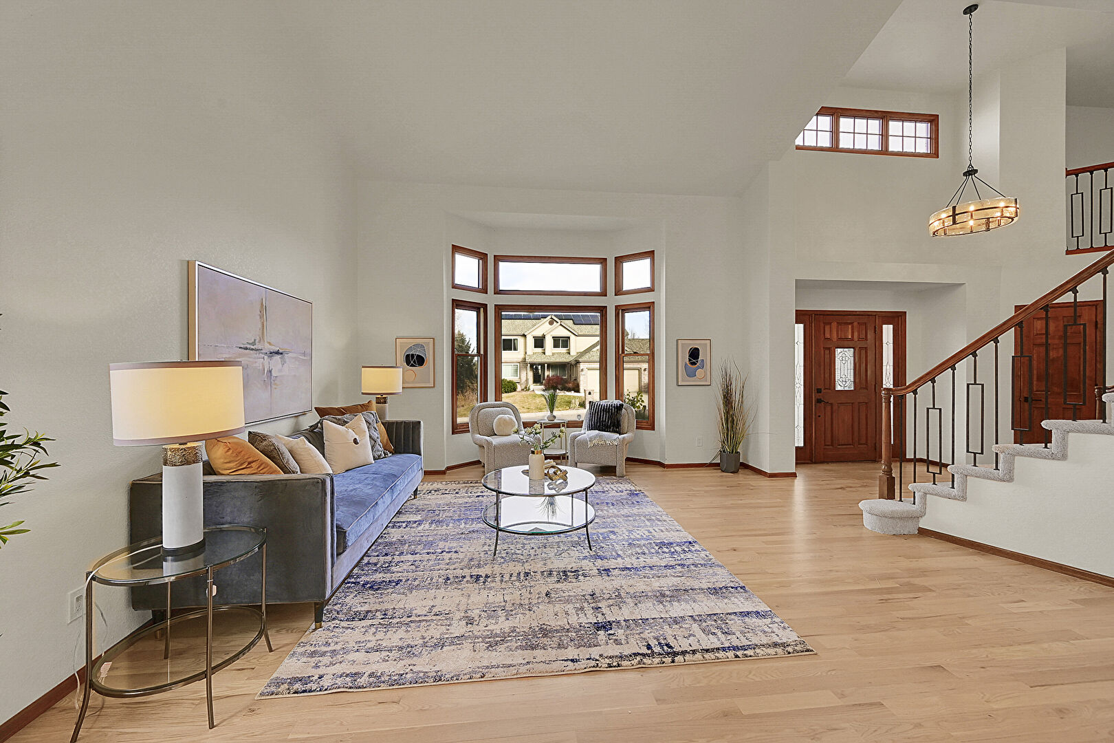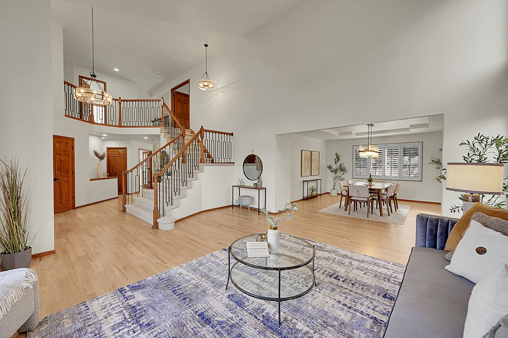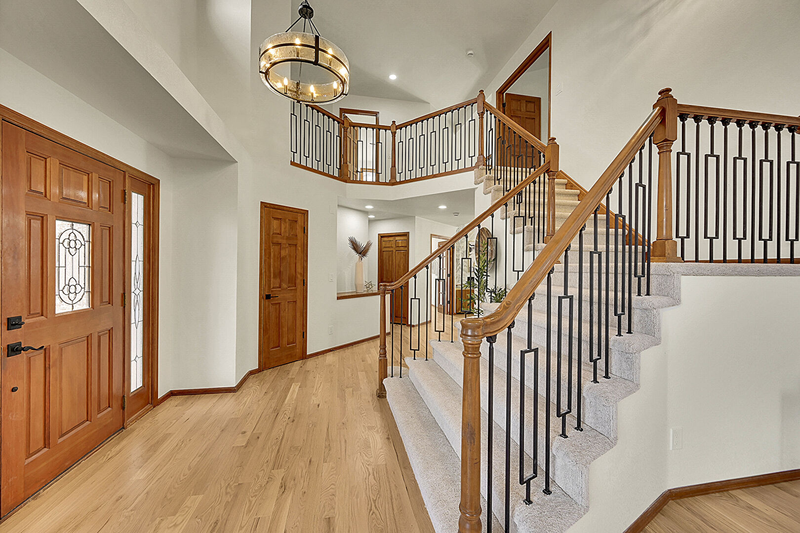 Baseboards Wall, Drywall, High Ceiling, Natural Light, Recessed Lighting, Stairs, Vaulted Ceiling, Wood Finish Floor, Baseboards Wall, Drywall, Notable Chandelier