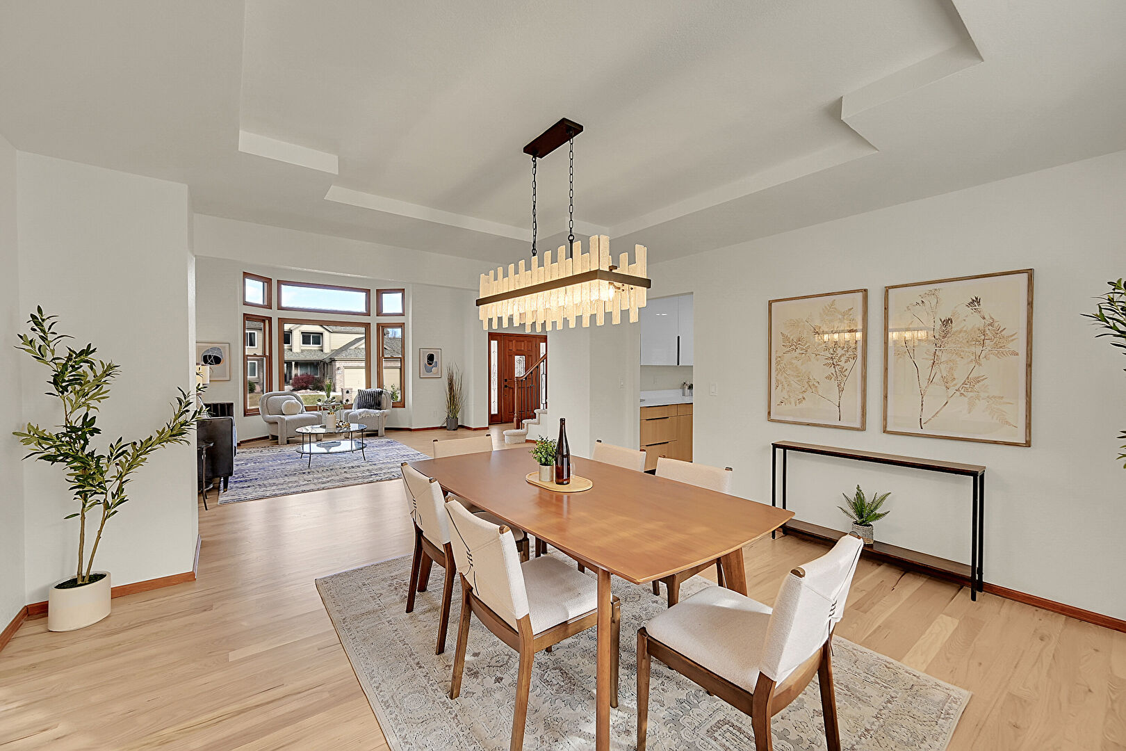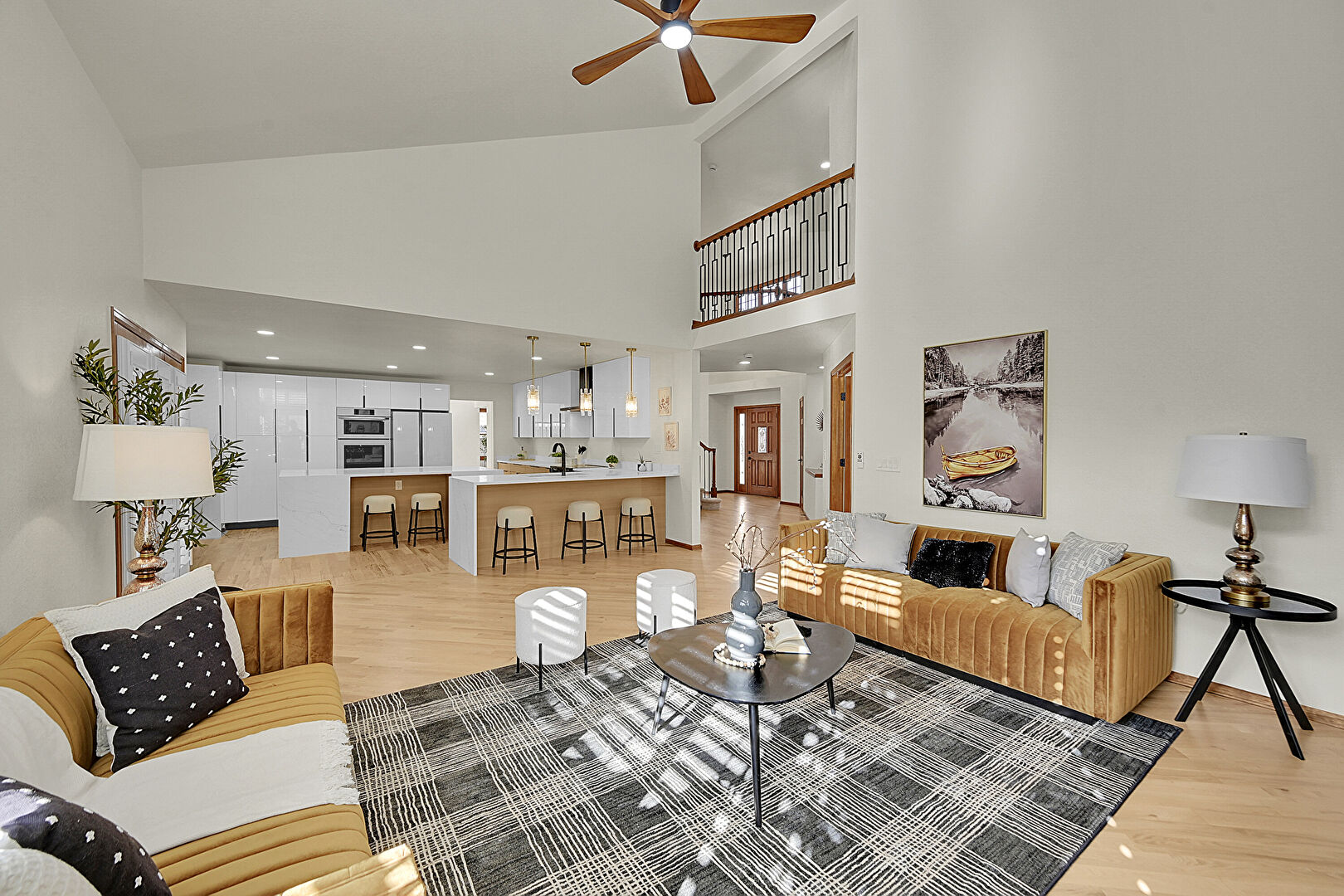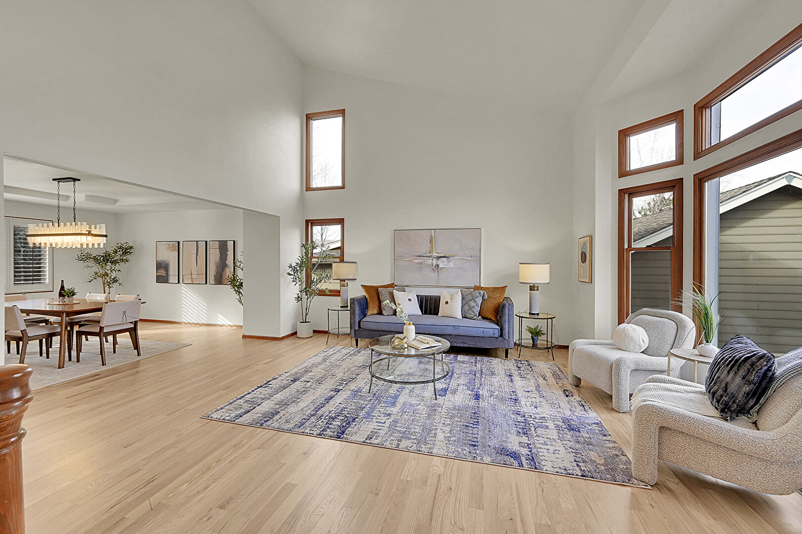 Baseboards Wall, Drywall, High Ceiling, Natural Light, Recessed Lighting, Stairs, Vaulted Ceiling, Wood Finish Floor, Baseboards Wall, Drywall, Notable Chandelier