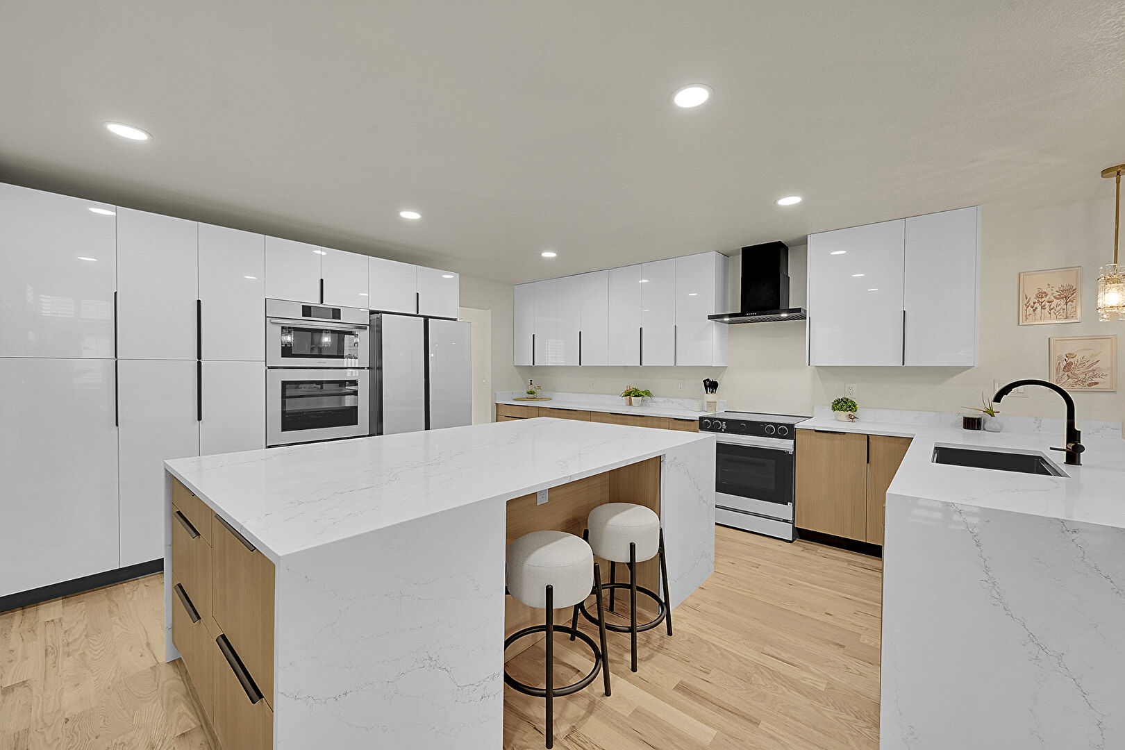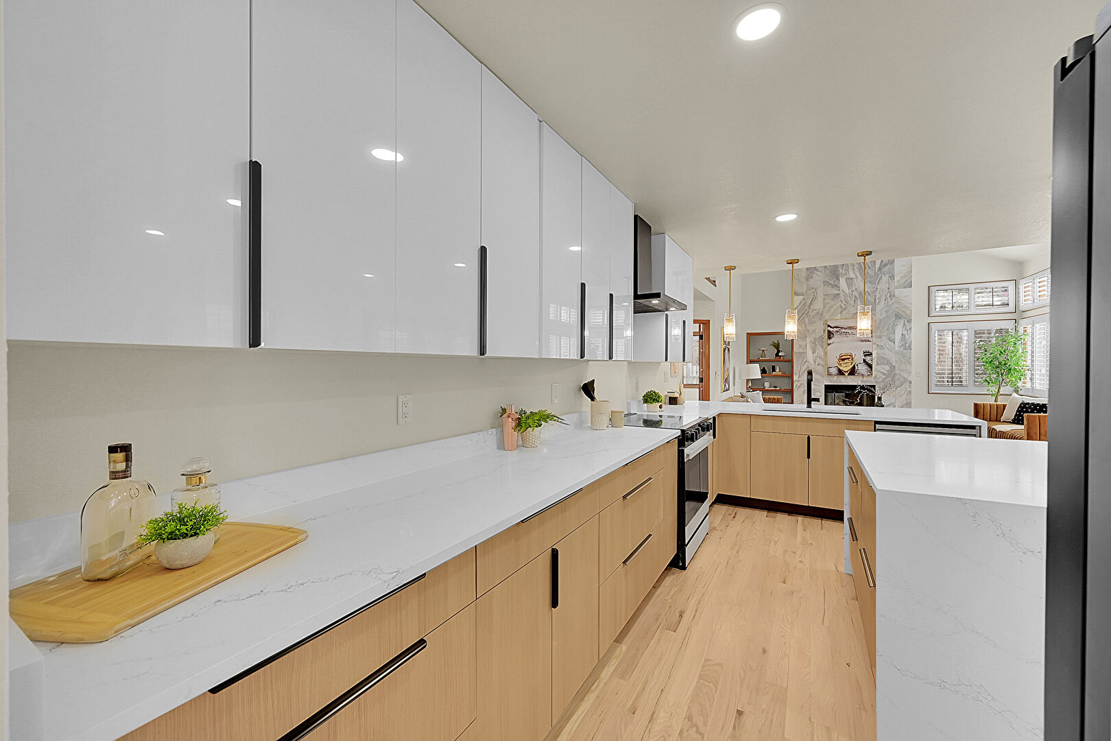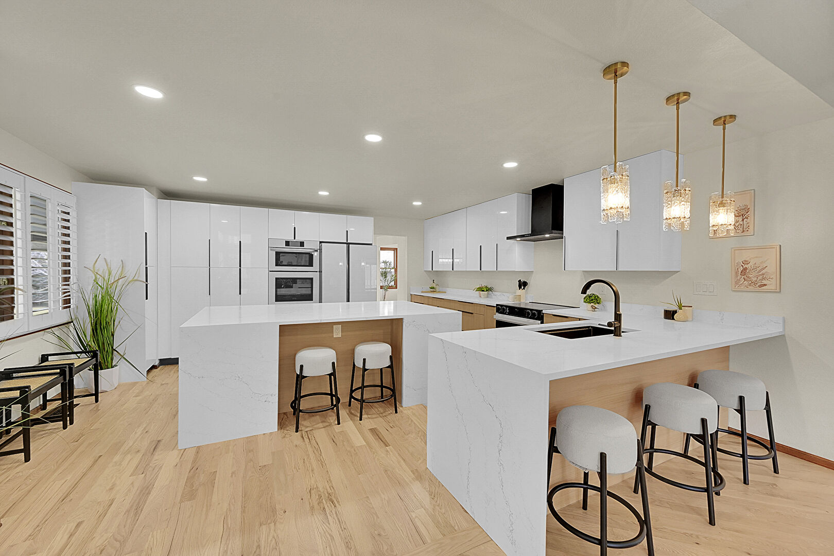 Baseboards Wall, Double Oven, Drywall, Fireplace, Flat Panel Cabinets, Kitchen Bar, Kitchen Island, Kitchen Peninsula, Medium Brown Cabinets, Natural Light, Opens To Living Area, Pendant Lighting, Recessed Lighting, Stone Countertops, U Shaped Kitchen, Vent, Wood Finish Floor, Kitchen Bar, Kitchen Island, Recessed Lighting, U Shaped Kitchen